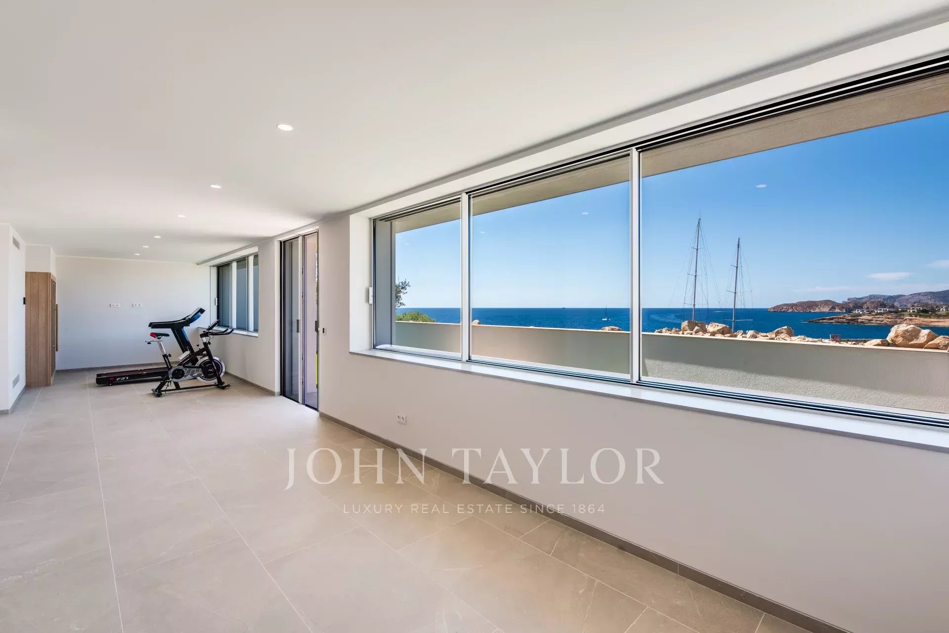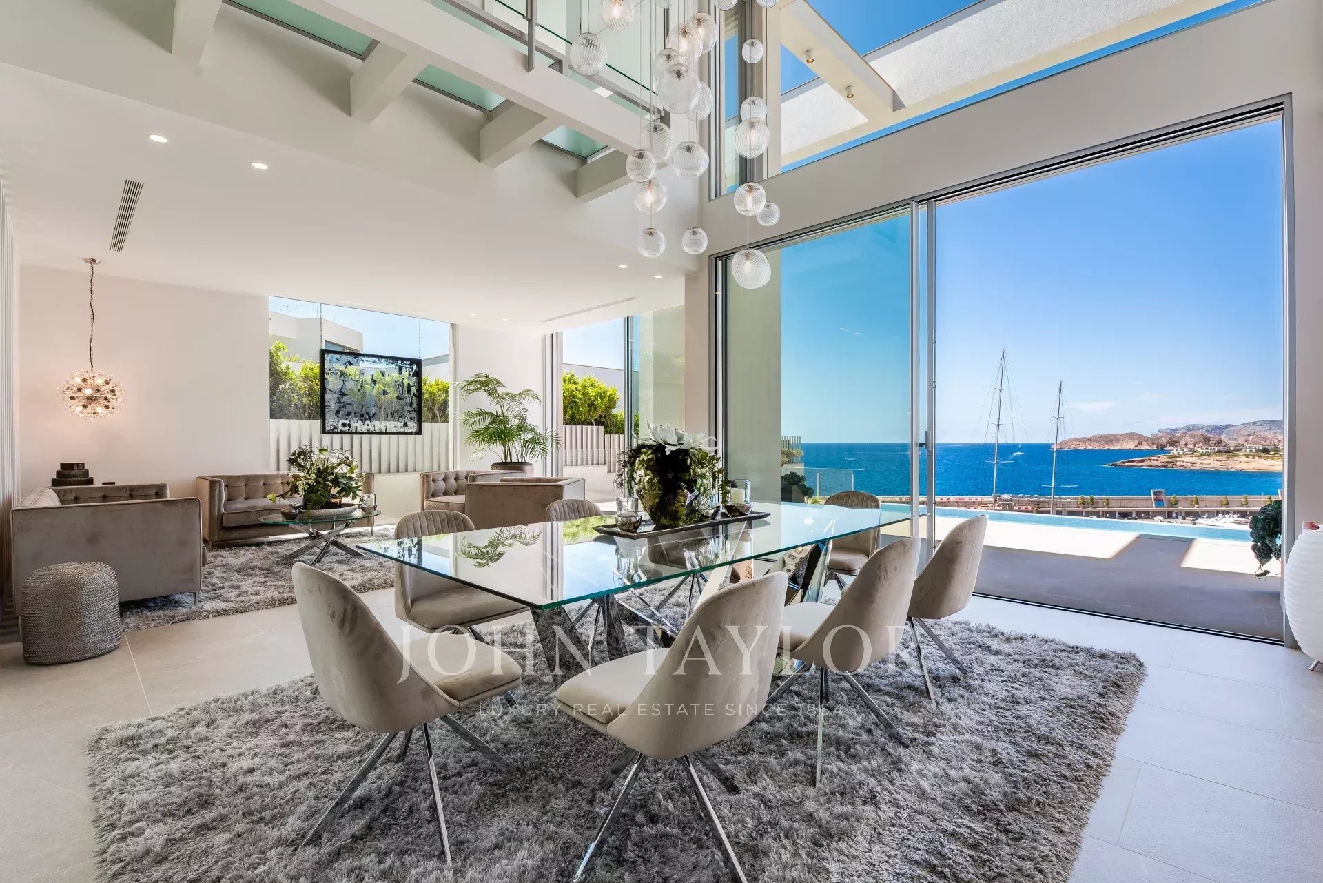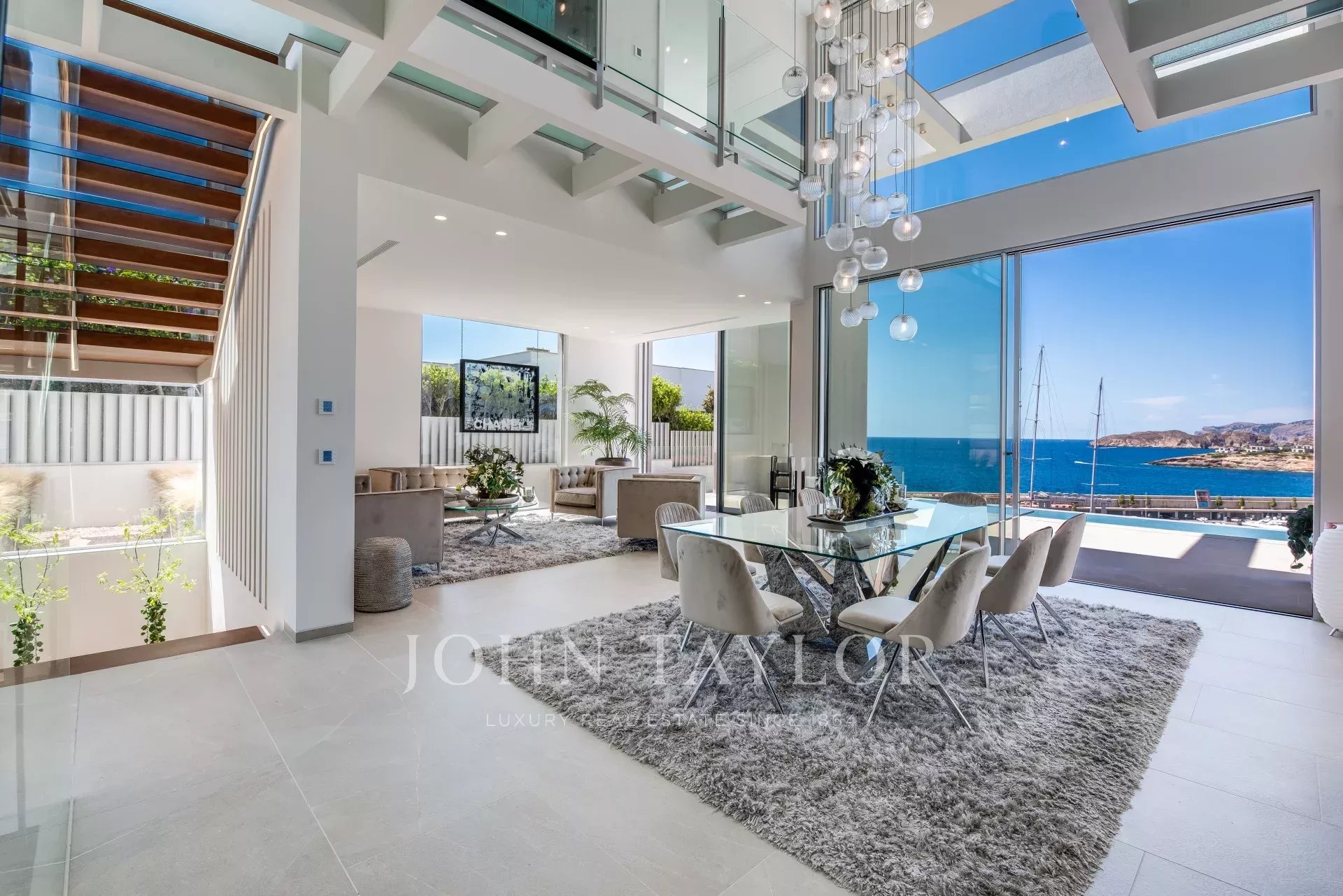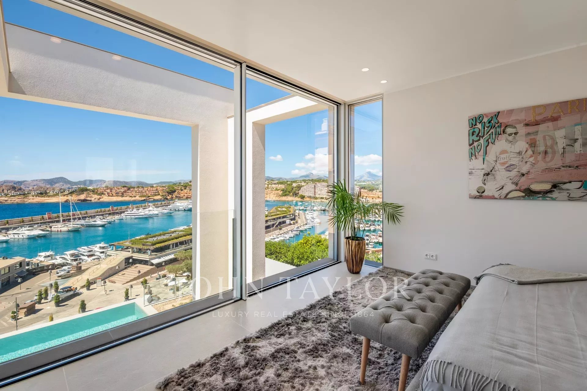 This ultra-modern villa is located in the port of Port Adriano in Santa Ponsa. The unique architectural style with huge window fronts give you freedom. This architectural work of art is distributed over 3 levels connected by a glass elevator, as well as glass corridors etc. With this unique architecture it is meant to bring all the Mediterranean light into this villa. This villa has 4 double bedrooms, each with a bathroom en-suite, a light-flooded living room, open kitchen with state-of-the-art equipment, a fitness room, a home cinema, a wine room, garage and parking spaces for 2 cars are just some of the features of this unique villa.