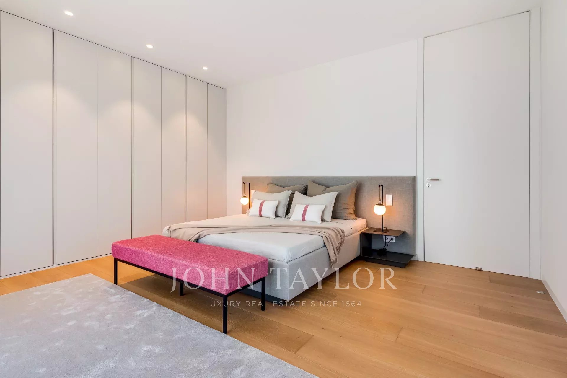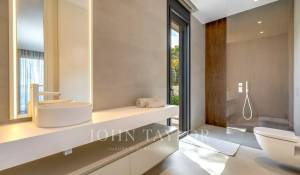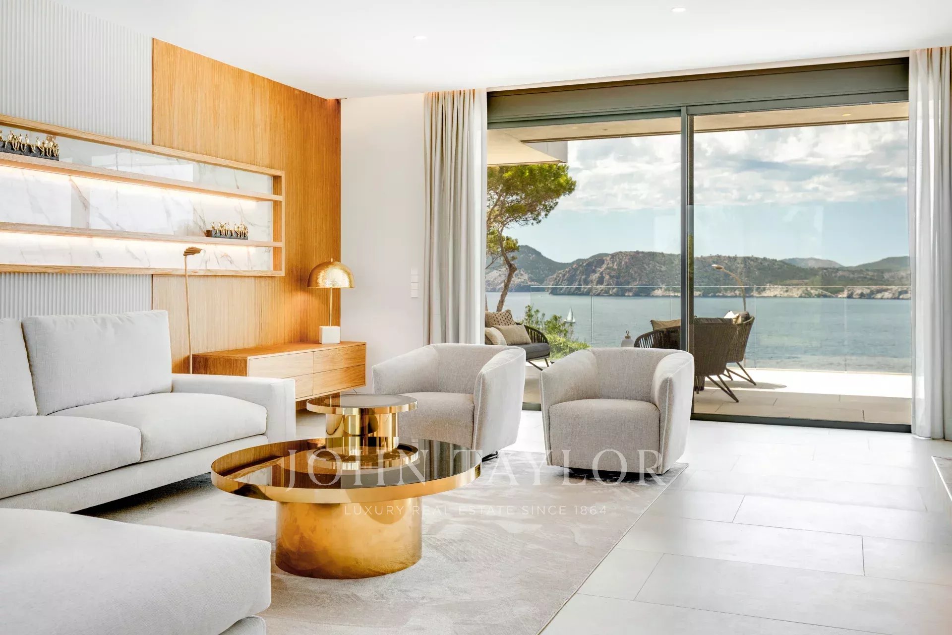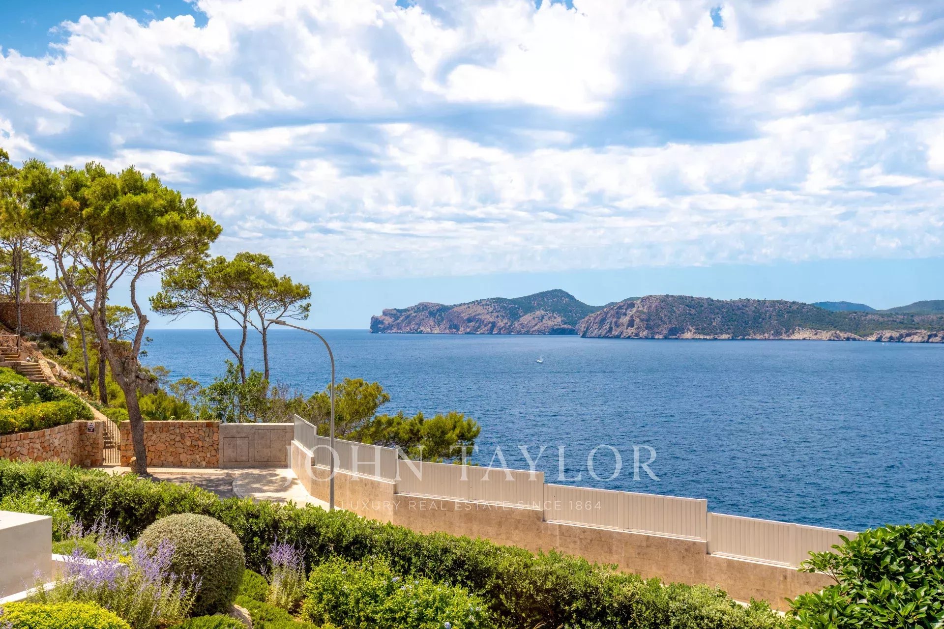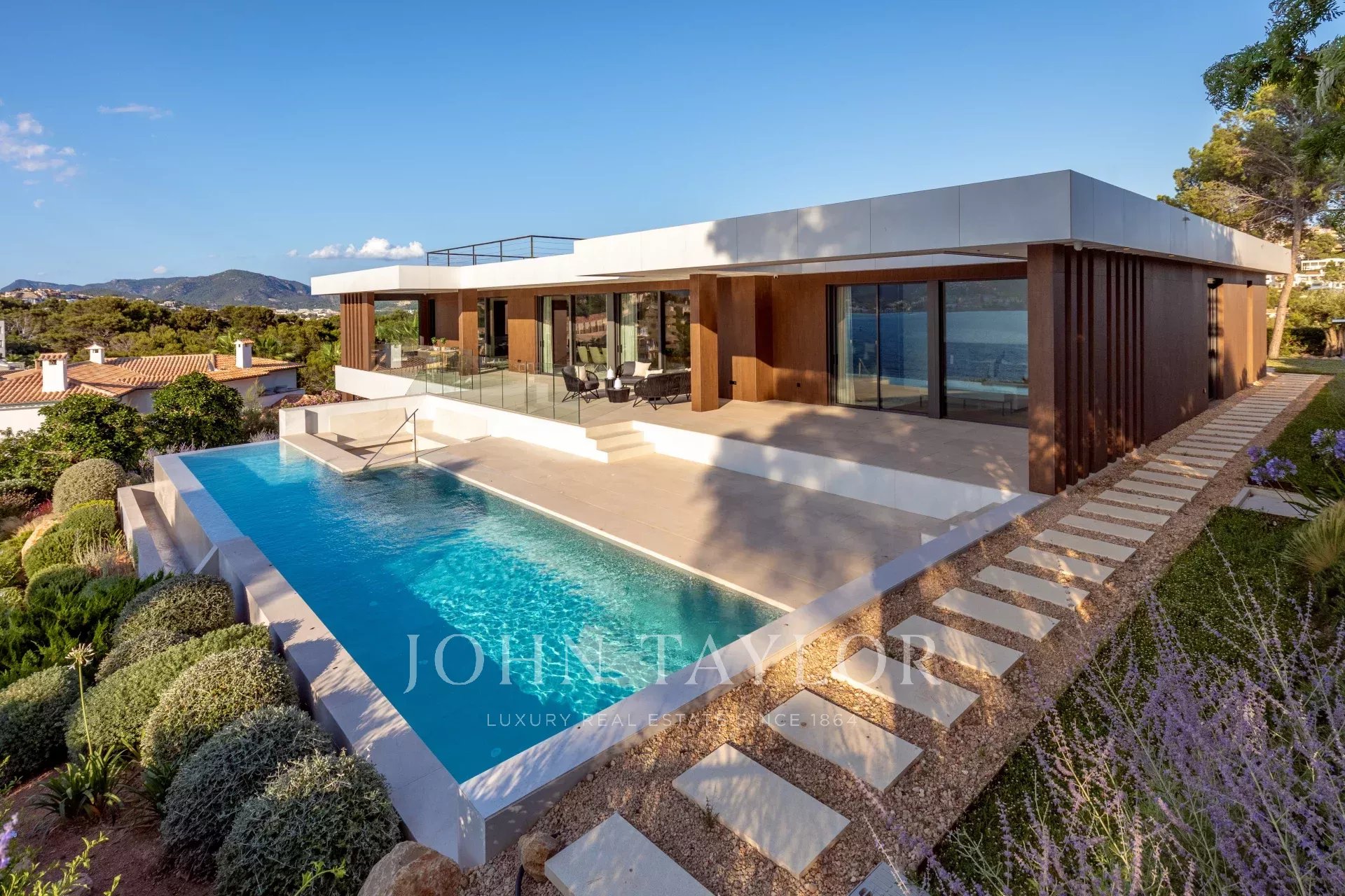 Newly built modern villa with spectacular sea views in Santa Ponsa. The construction of this luxury house was completed in June 2023. It is located on the second line a few meters from the sea. Nearby there is access to a romantic cove for swimming and diving among the rocks. The villa is distributed over 3 floors connected by an elevator. On the upper floor we find a spacious living room, a modern kitchen, an auxiliary kitchen, a toilet, the master bedroom with dressing room and bathroom en suite and access to an interior patio ideal for dining al fresco and to the terrace, which connects with the pool. The lower floor houses 3 bedrooms with en-suite bathrooms and a second room, which could also be converted into the fifth bedroom. A garage for 4 cars completes this wonderful villa. The materials and finishes of this villa are of very high quality.