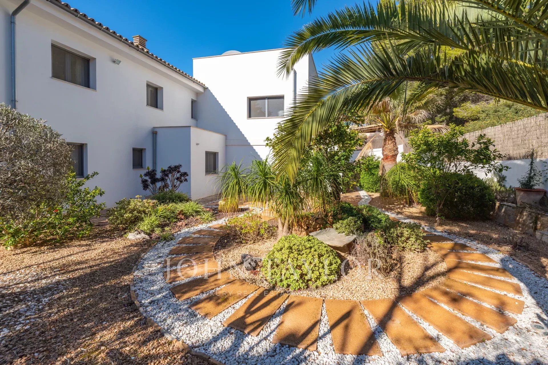 Villa in a quiet location in Santa Ponsa. This house was completely renovated in 2018 and stands out for its practical layout, good quality materials and cozy atmosphere. It is an ideal family home. The spacious garden and several large terraces invite you to enjoy outdoor living. On the first floor, the large living room with fireplace and the open kitchen with island connect to the porch. There are also 2 bedrooms with bathrooms en suite, an office area, a guest toilet, the laundry room and a garage. The upper floor offers a large master bedroom with dressing room and bathroom en suite, another bedroom and a fitness room, which could be the fifth bedroom of the house. Underfloor heating and air conditioning provide the right temperature at any time of the year. The pool and garden with lots of privacy are in perfect condition. A great property very close to everything Santa Ponsa has to offer and within walking distance to Port Adriano, Portals Nous and Palma.