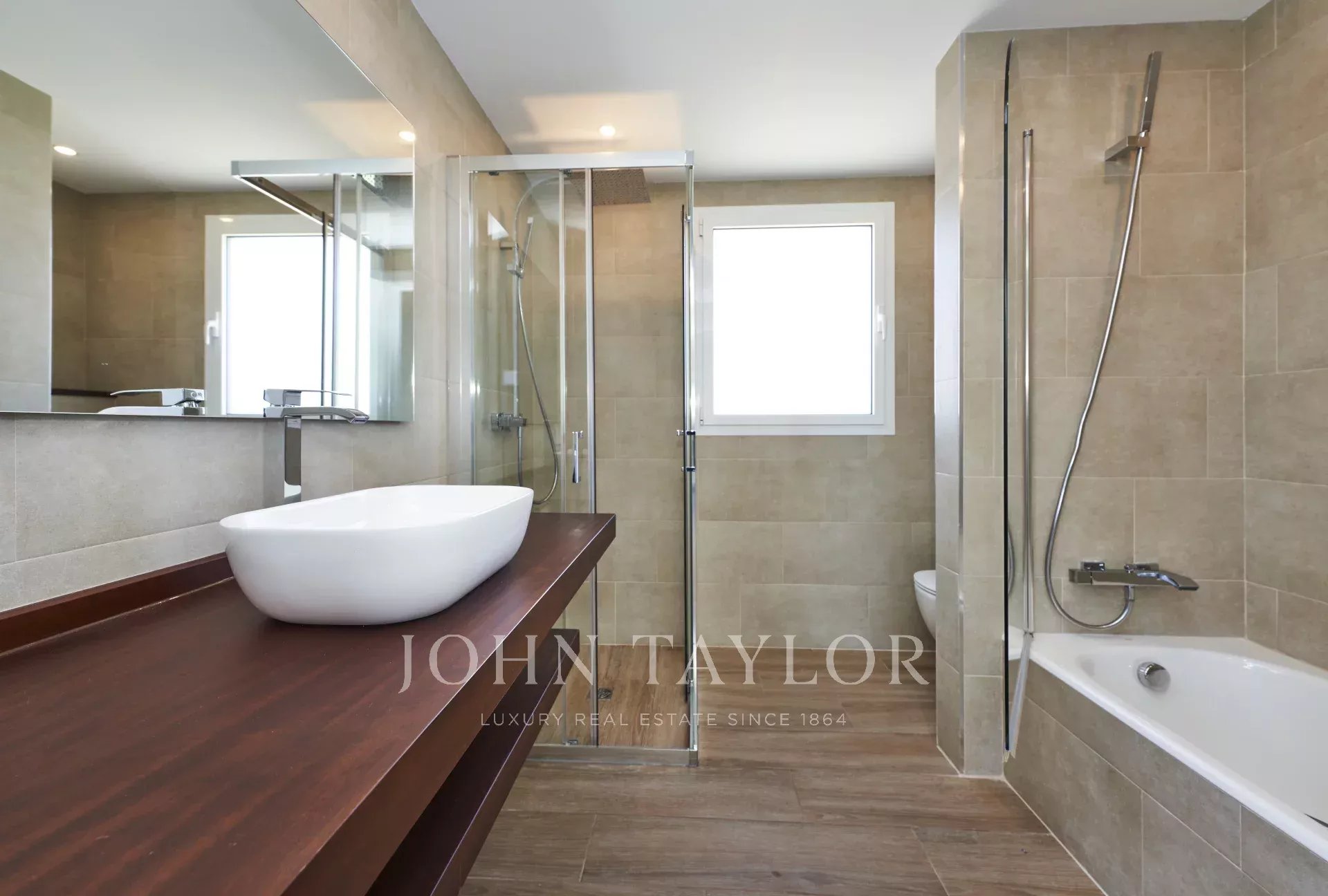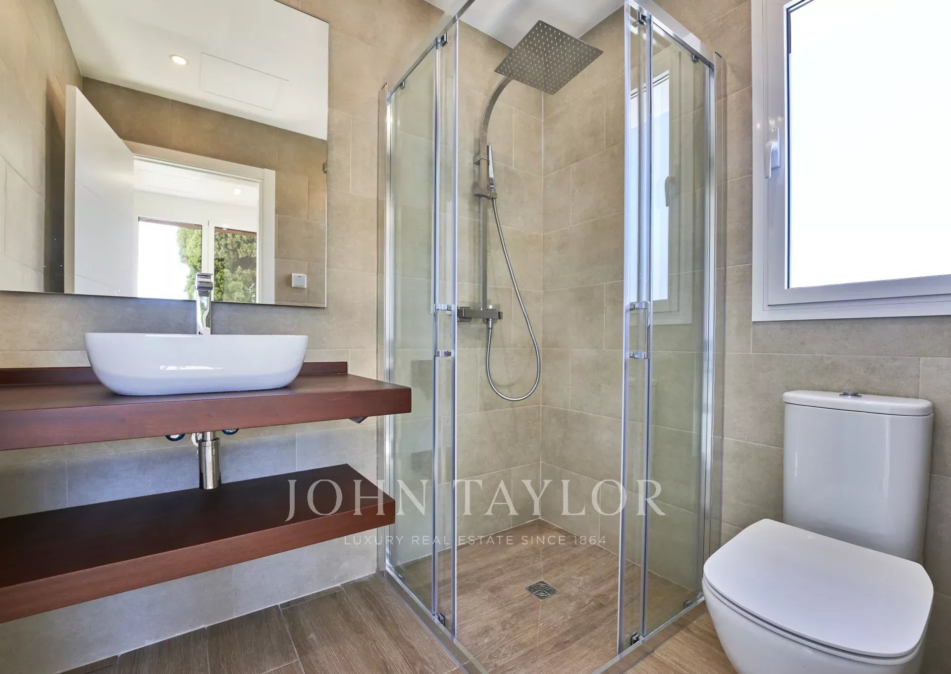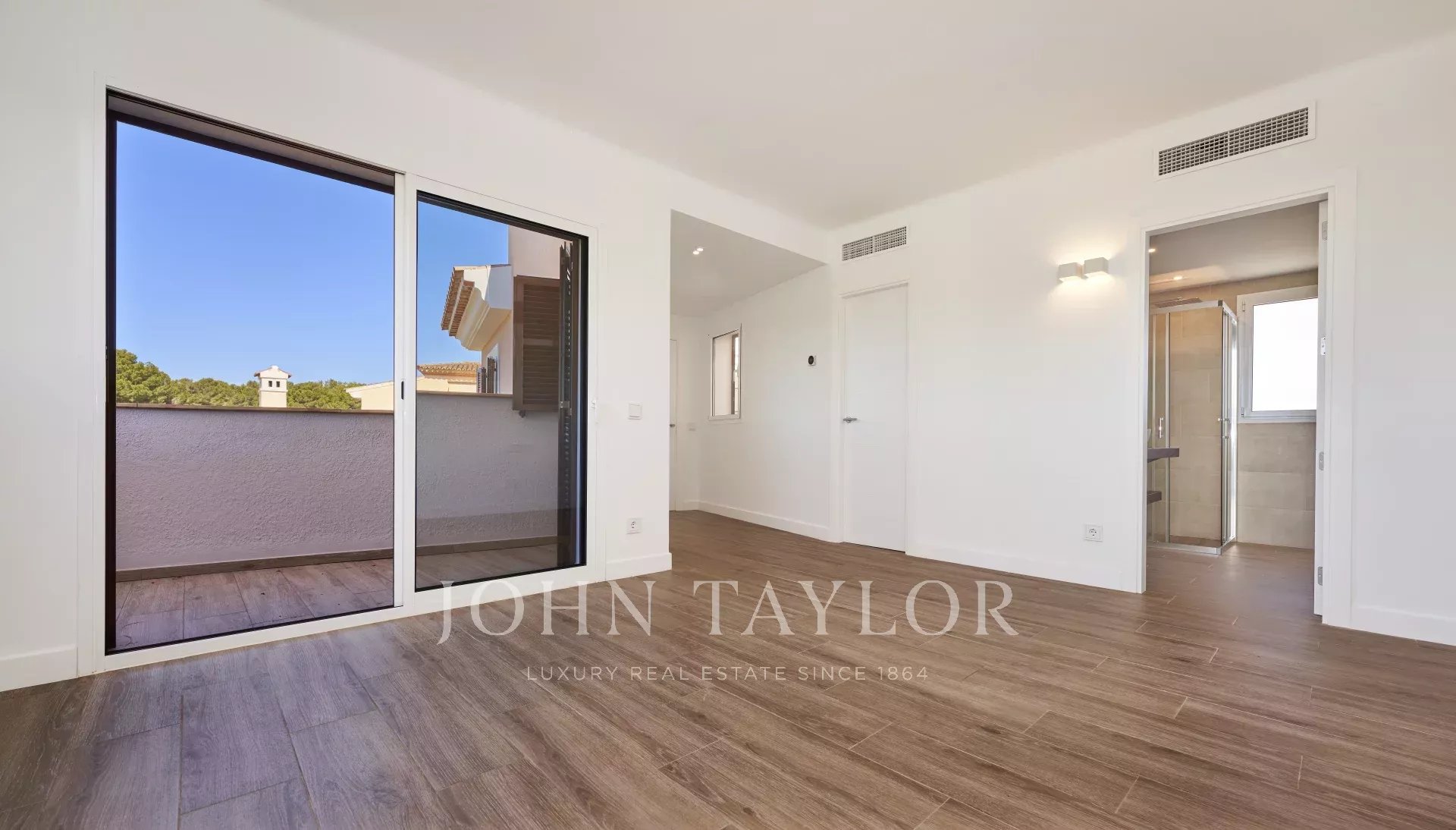 Discover this stunning luxury house located in Santa Ponsa next to the golf course. With an area of 216 m², the house offers a spacious living room, a modern kitchen and three comfortable bedrooms. Enough space and a perfect atmosphere to enjoy in tranquility with family or friends. Its Mediterranean architecture is complemented by high quality finishes, including aluminum windows and double glazing that ensure optimal insulation.