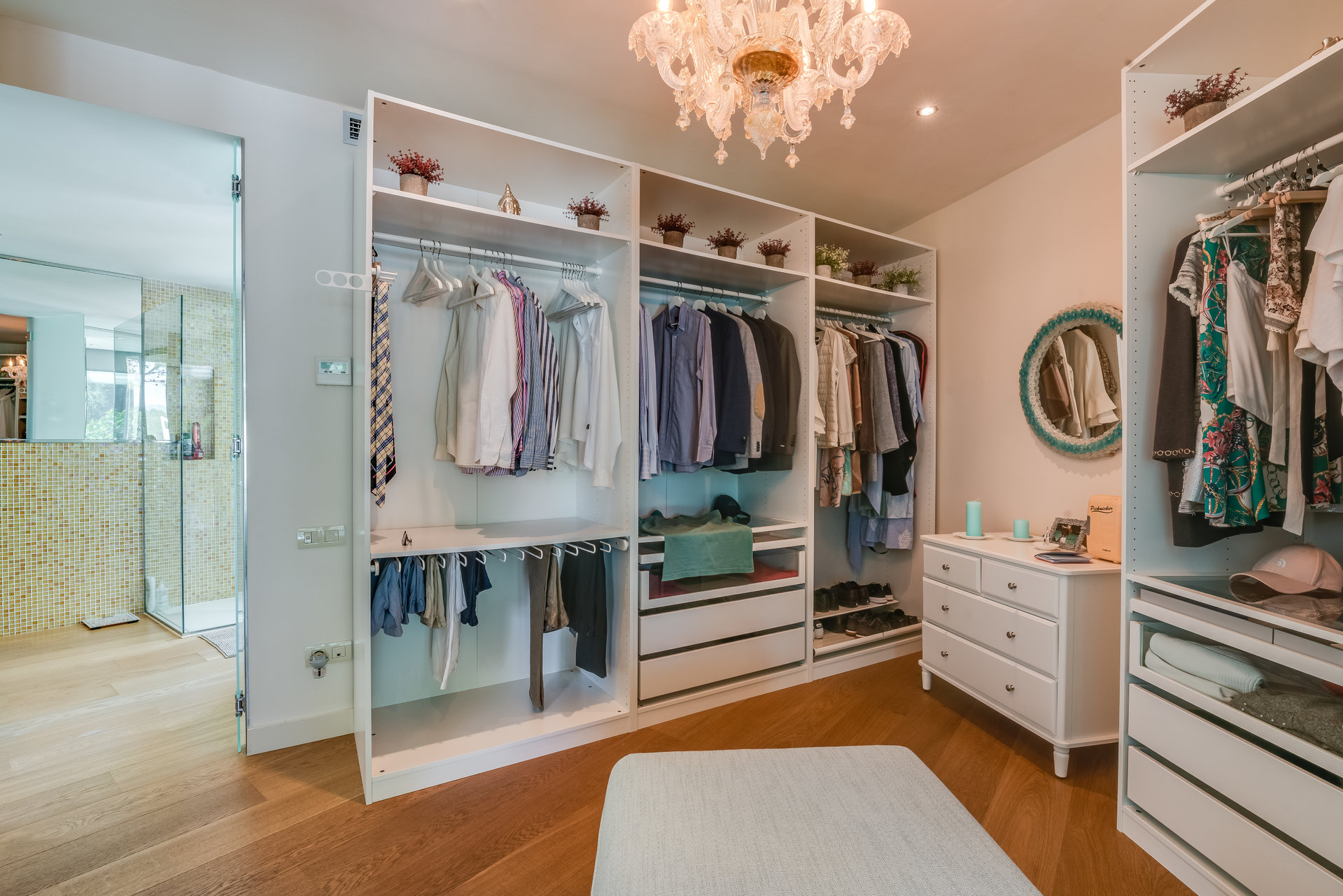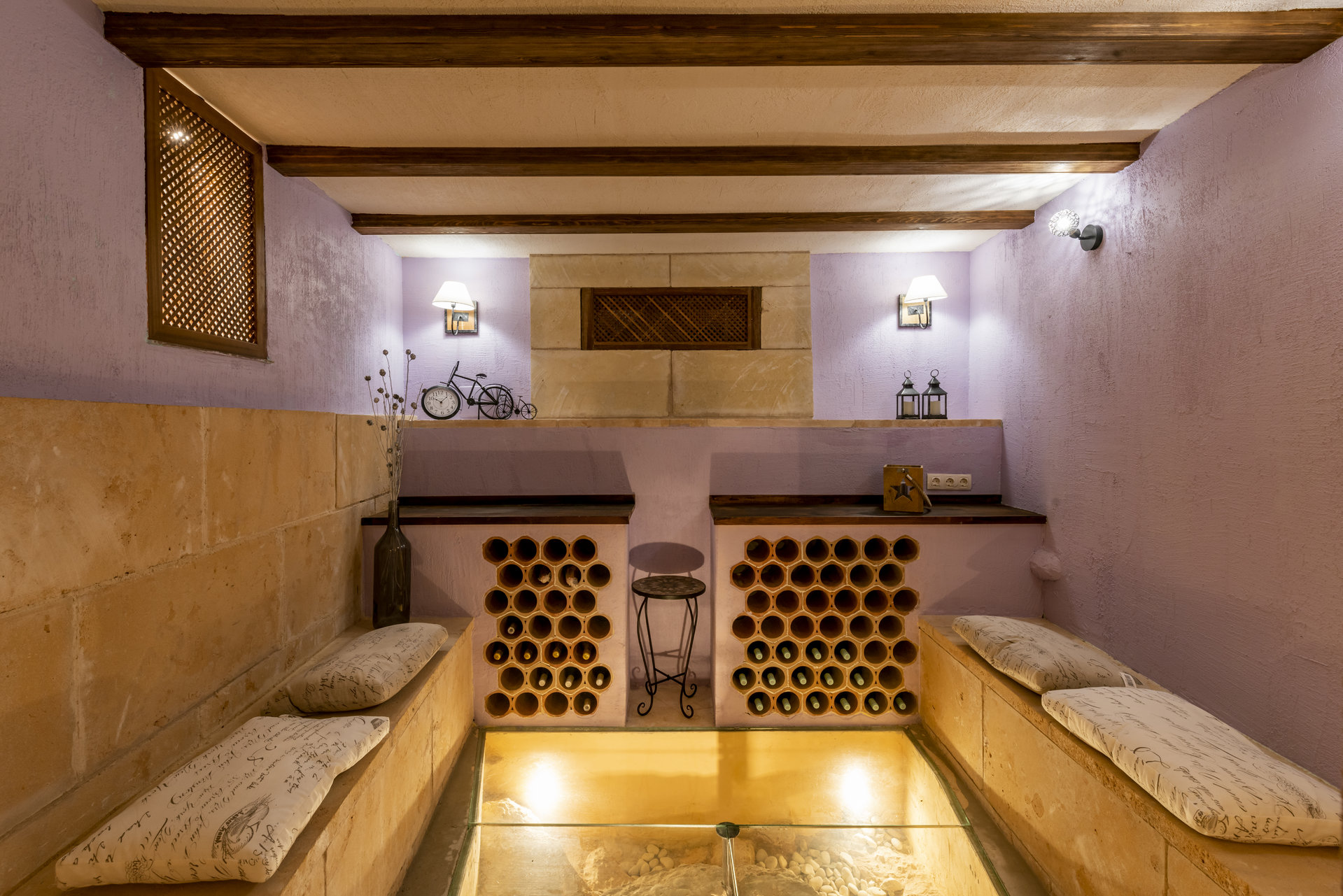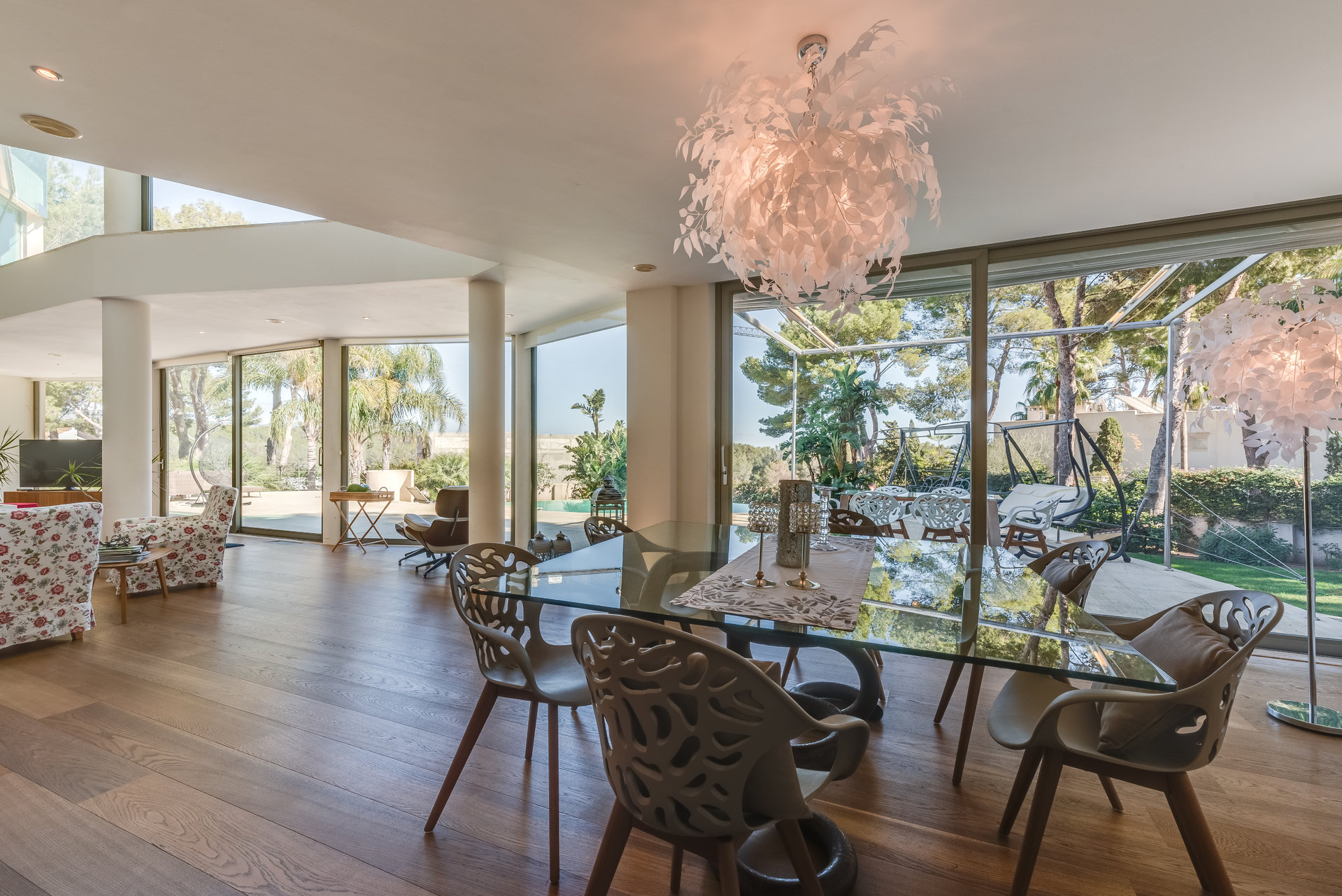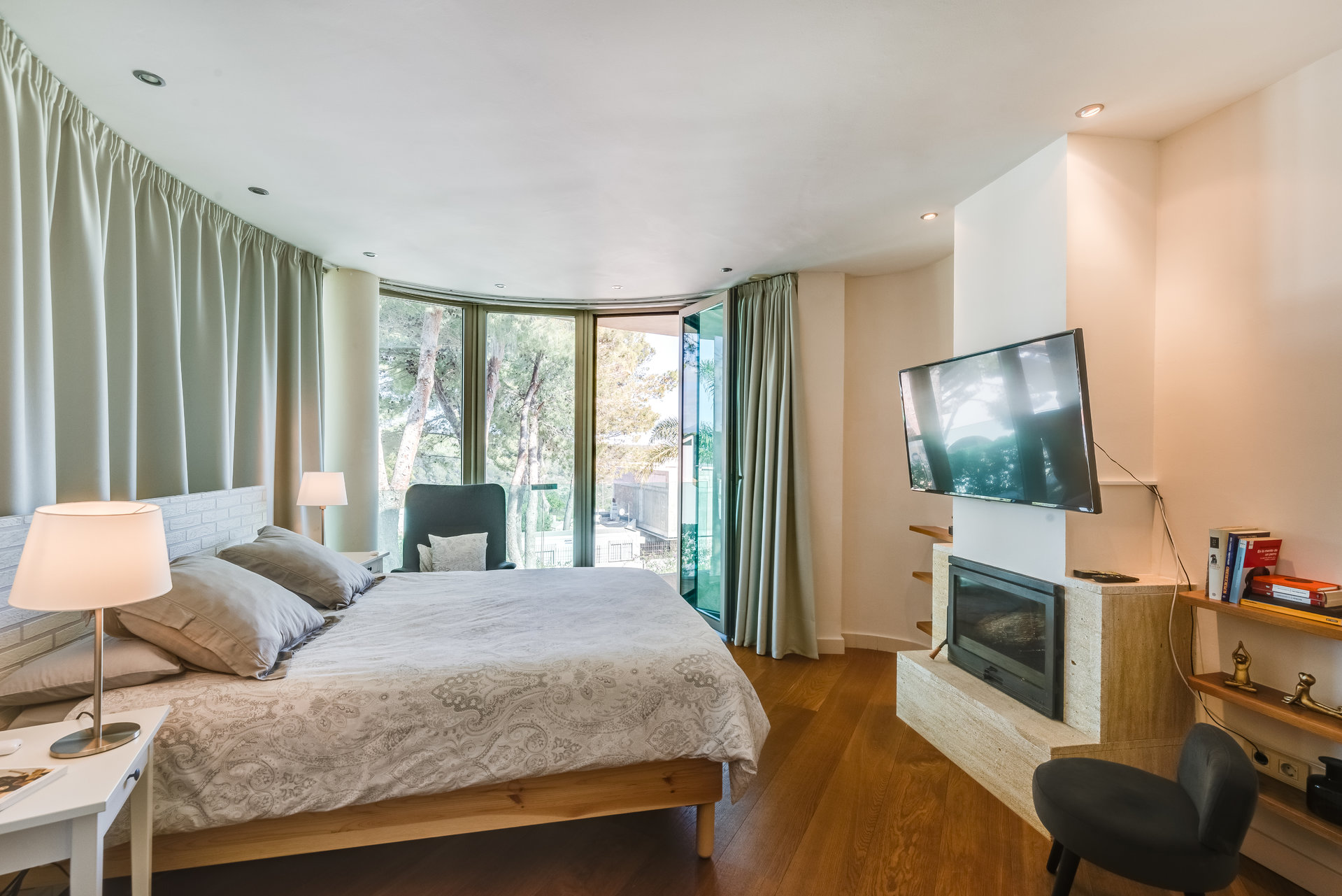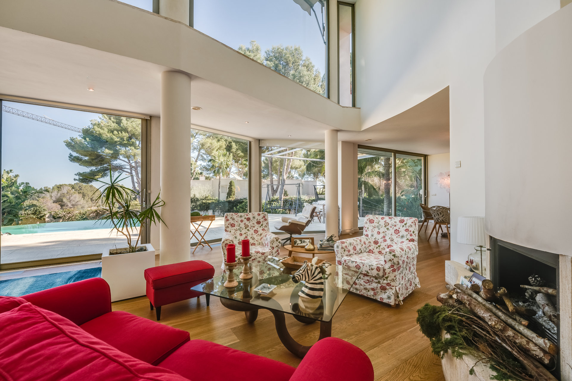on the main floor, a spacious open concept living area with fireplace and large glass windows connects harmoniously with the terrace, pool and garden. On this level there is also a separate fully equipped kitchen, laundry room, pantry, as well as two bedrooms and two bathrooms.