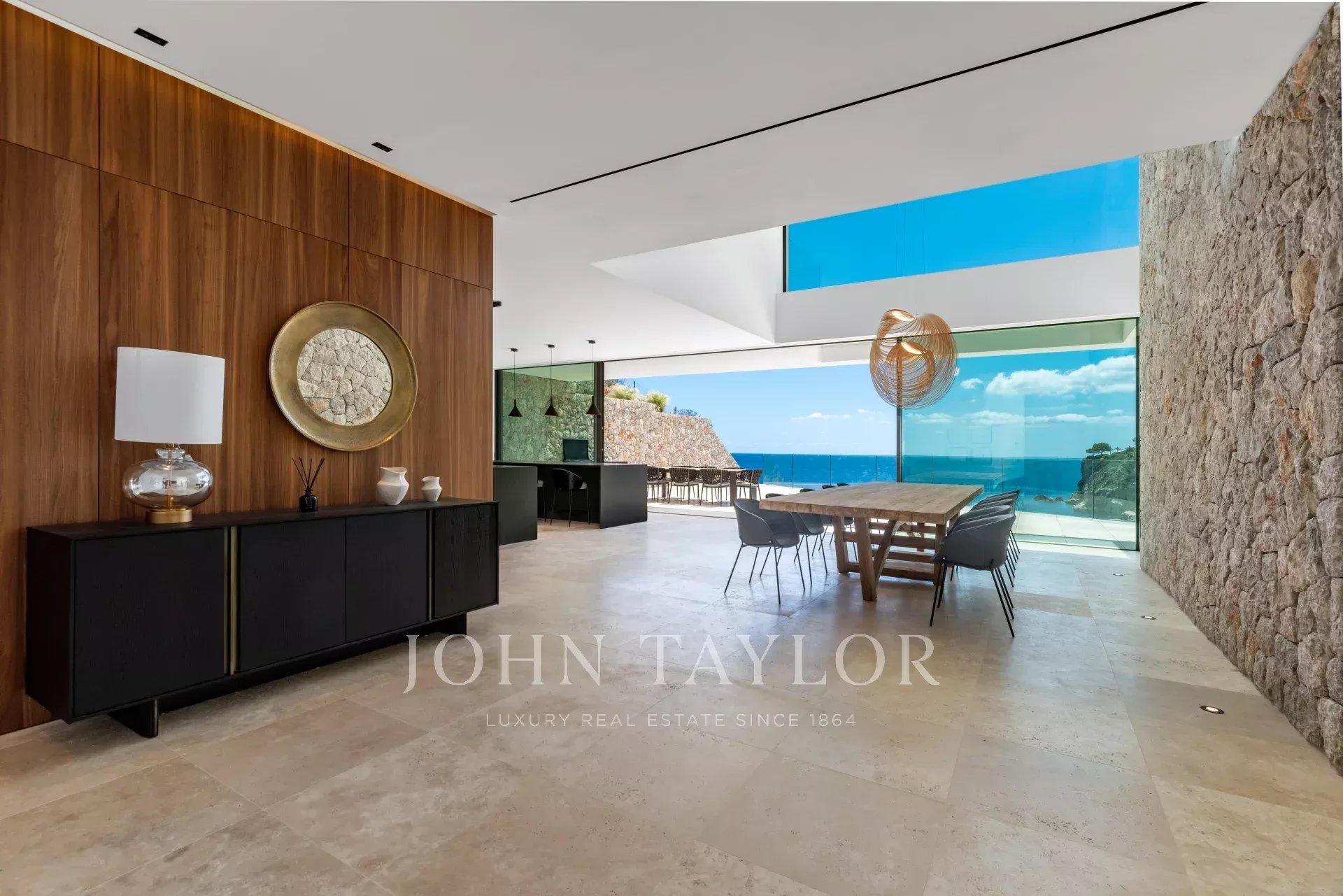 Experience the epitome of pure luxury living in this extraordinary newly built villa in the tranquil residential area of Sol de Mallorca! Step into this coastal masterpiece, which offers an unparalleled lifestyle! This breathtaking residence with an impeccable design in first line boasting unrivalled sea views redefines coastal luxury properties in Mallorca. With more than 1000 m2 of built area on a 2142 m2 plot this amazing house offers 3 floors connected by a lift. Upon entering the vestibule on the top floor you are inmediately welcomed by a stunning view of the Mediterranean sea. On this level there is the magnificent master suite with 2 walk-in closets and a sophisticated open plan bathroom. Every morning you will wake up with the continuously changing colours of the sea at your feet. On this floor there are also 3 more bedrooms, each one with its own bathroom. Descending a beautiful staircase one arrives at the main living area, completely light flooded, connected and spacious, but at the same time designed to offer clearly separate spaces for different moments, be it for a cosy evening at the fireplace, formal dining, a lively barbecue party with family and friends or simply relaxing on the lounge terrace. The basement of the house offers a garage for at least 7 cars and additionally some huge spaces, which can be dedicated to a fitness room, a home cinema or a play room for children. Many porches and open terraces to enjoy the sun around the stunning infinity pool complete this one of a kind retreat. Ready to elevate your living experience to new heights and turn this unmatched lifestyle into yours? Contact us today to make this dream a reality!