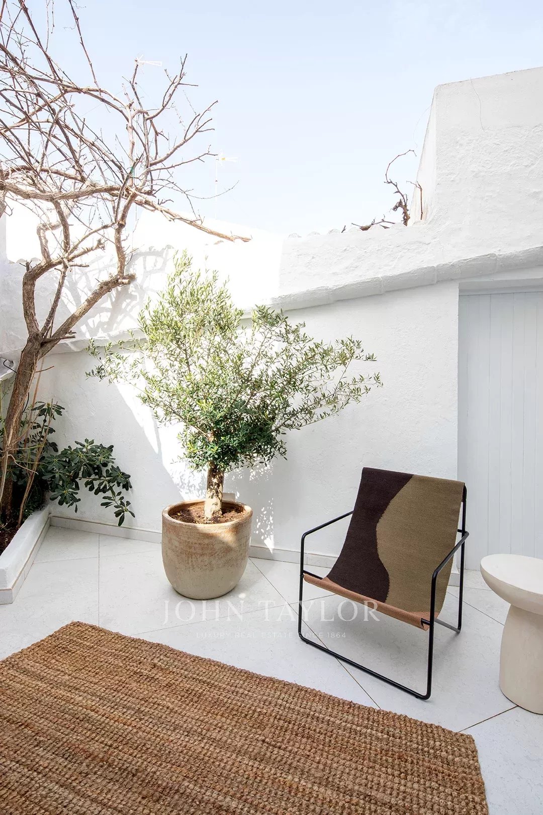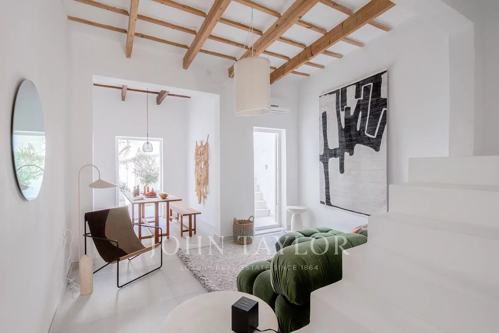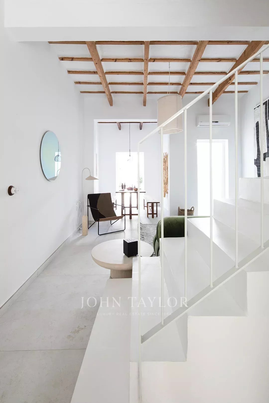 A few steps from the historic center of Ciutadella, this house perfectly combines the essence of Menorca with a sophisticated contemporary design. With 123 m² distributed over three floors, it offers open and bright spaces, where the integrated kitchen, living room and dining room open onto a private patio, perfect for outdoor dining or relaxing moments in the sun.