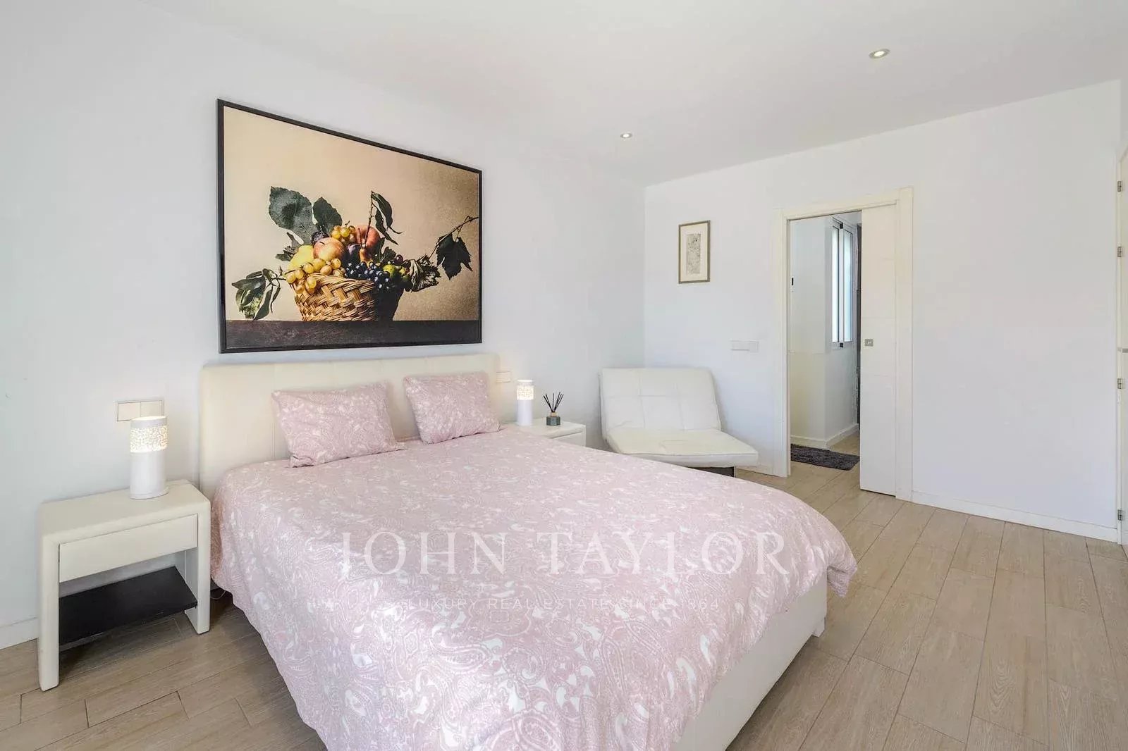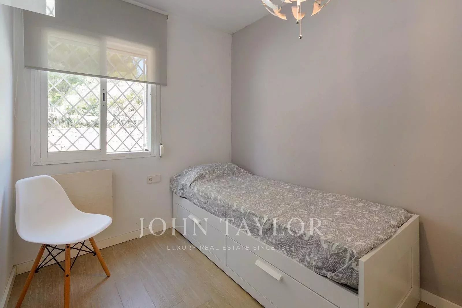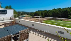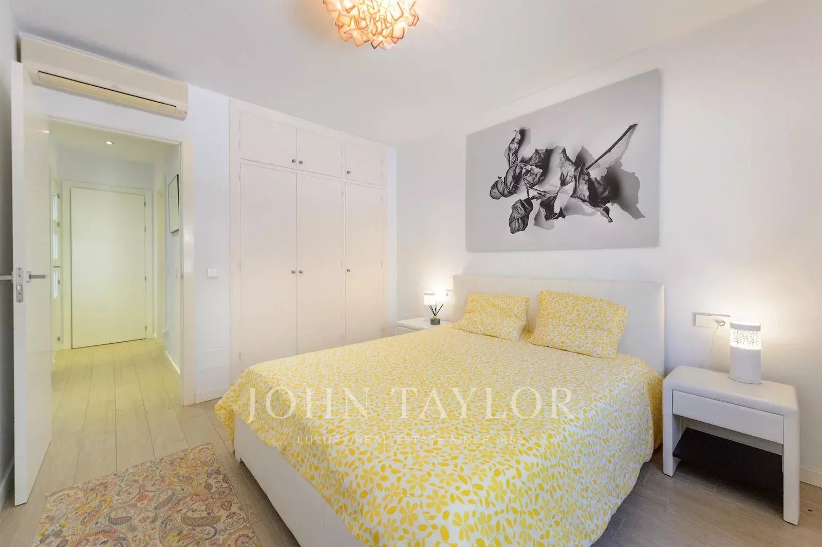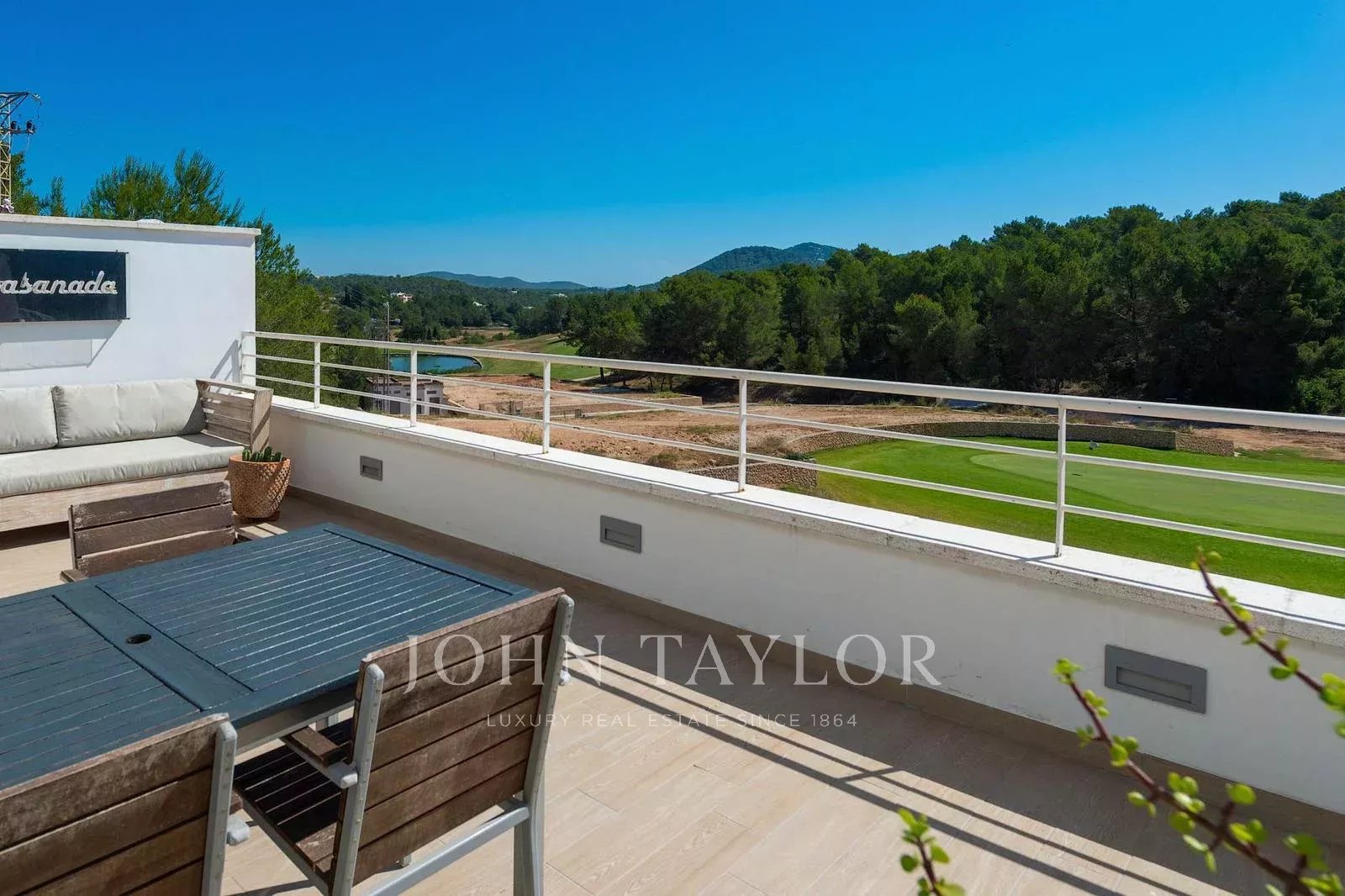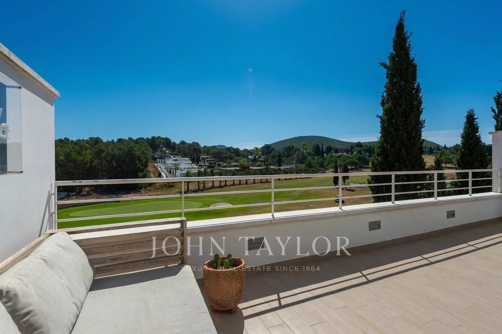 The large master bedroom features an en-suite bathroom and a generous closet area. It offers direct access to a terrace with breathtaking views of the golf course, allowing you to start your day with a refreshing view. The second spacious double room is separated from the master bedroom by a corridor, ensuring privacy. The third individual room features a single bed that can be transformed into a double bed, making it versatile for different needs. These two bedrooms share a common bathroom, conveniently located between them.
