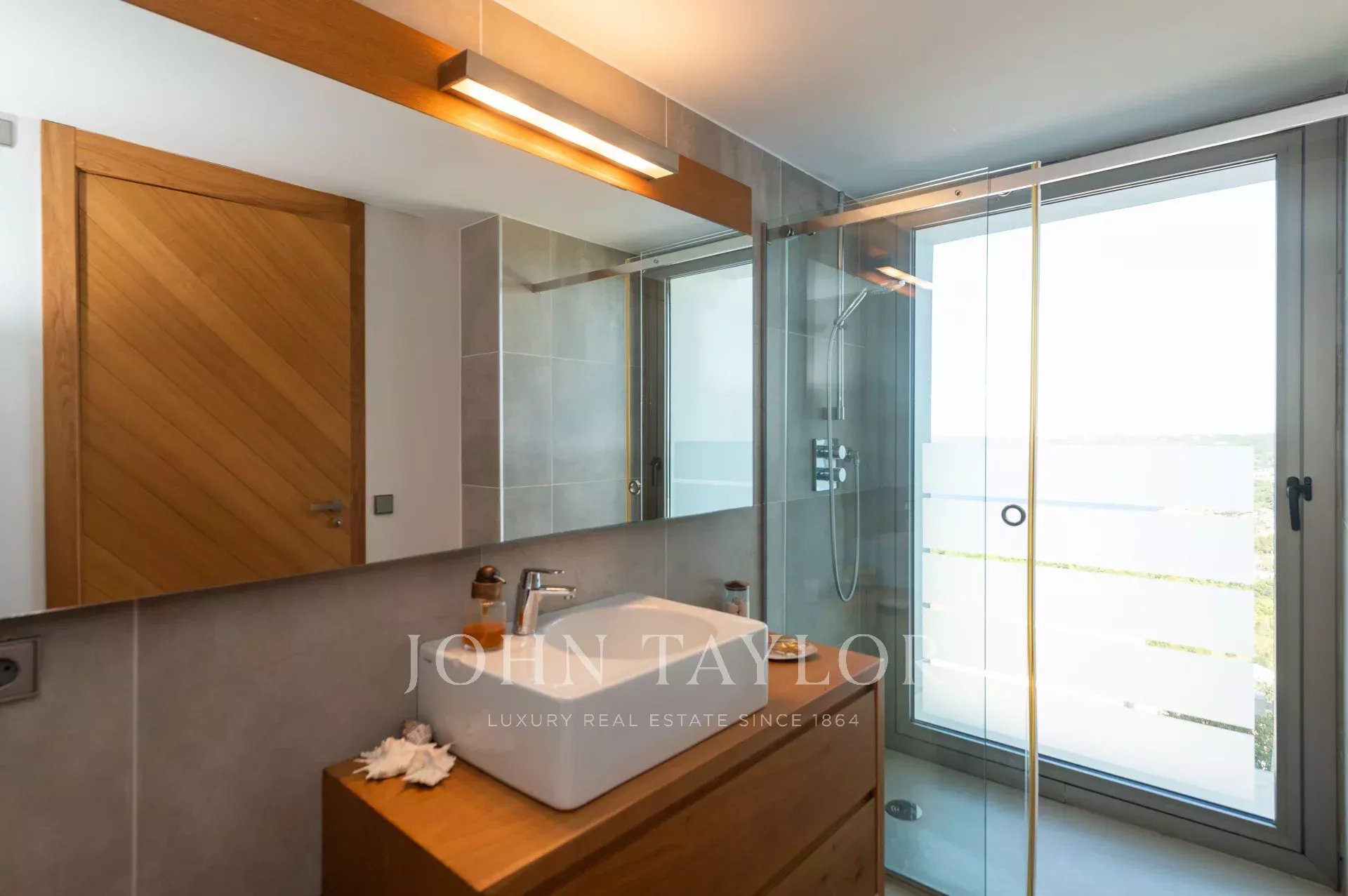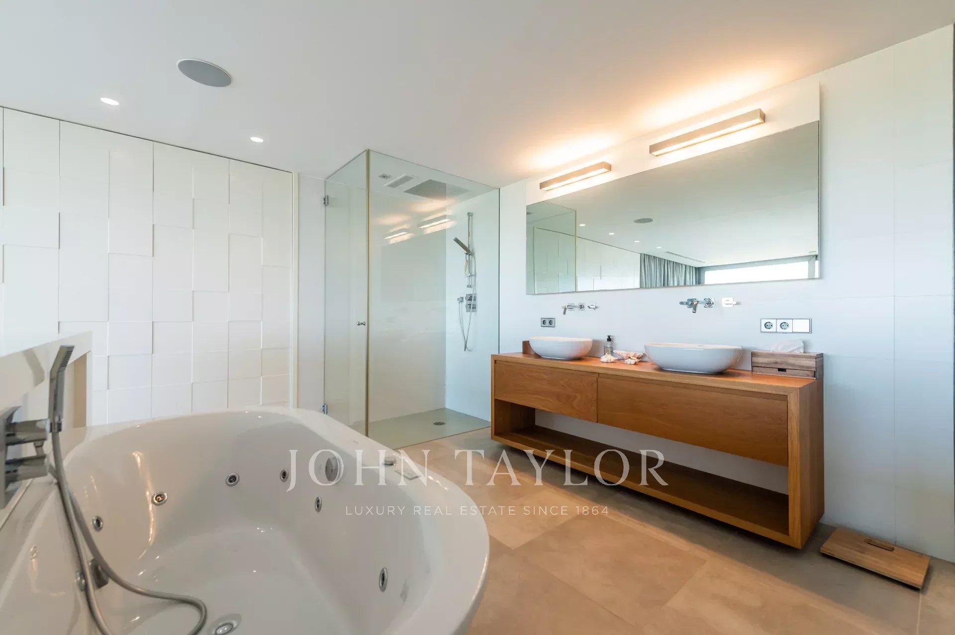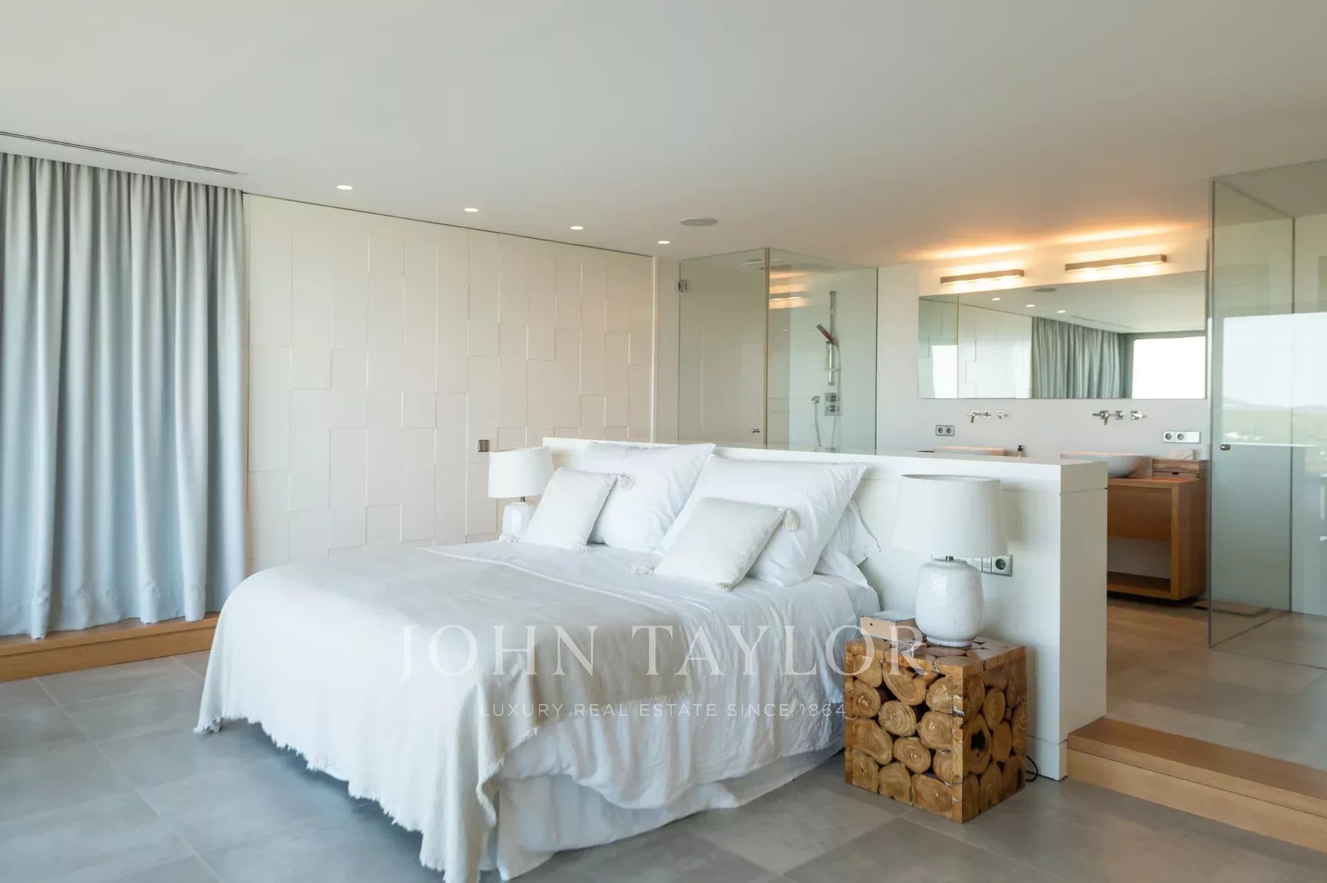 Outside, the house has a magnificent terrace equipped with an outdoor dining area from where you can enjoy the breathtaking views. The pool area features a wooden deck around the infinity pool, a lawn area with a bali chill out bed for relaxing, Mediterranean plants, a shower, four sun loungers and umbrellas, as well as a covered garage for two cars.