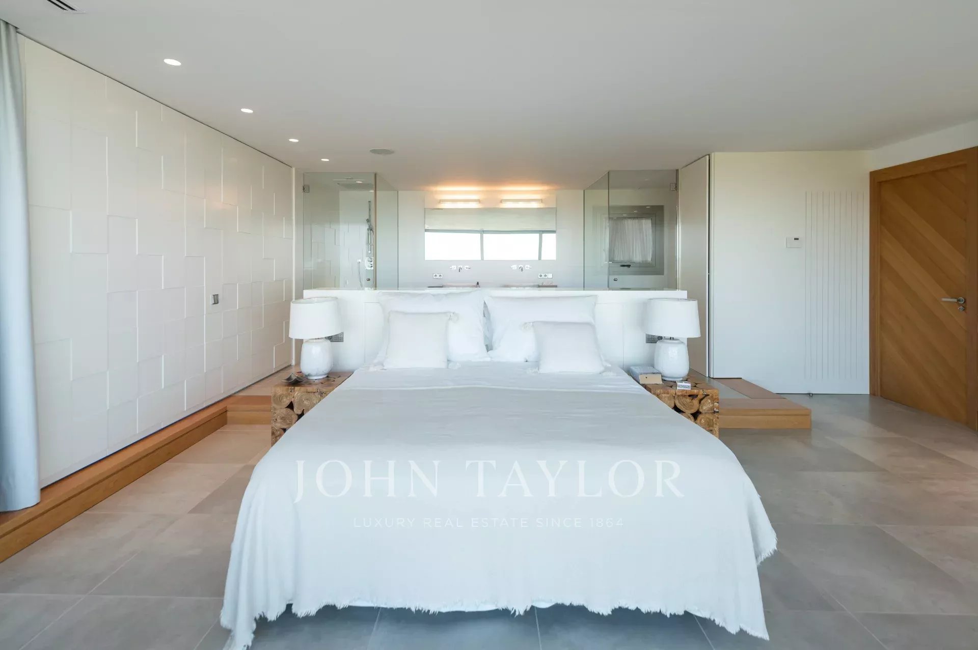 Upstairs are the bedrooms. The master bedroom has a double bed (180 cm), a private terrace and an en suite bathroom with shower and bathtub. There are also two double bedrooms with king size beds and en suite bathrooms, and two more bedrooms, one double with king size bed and one with two single beds, which share a bathroom.
