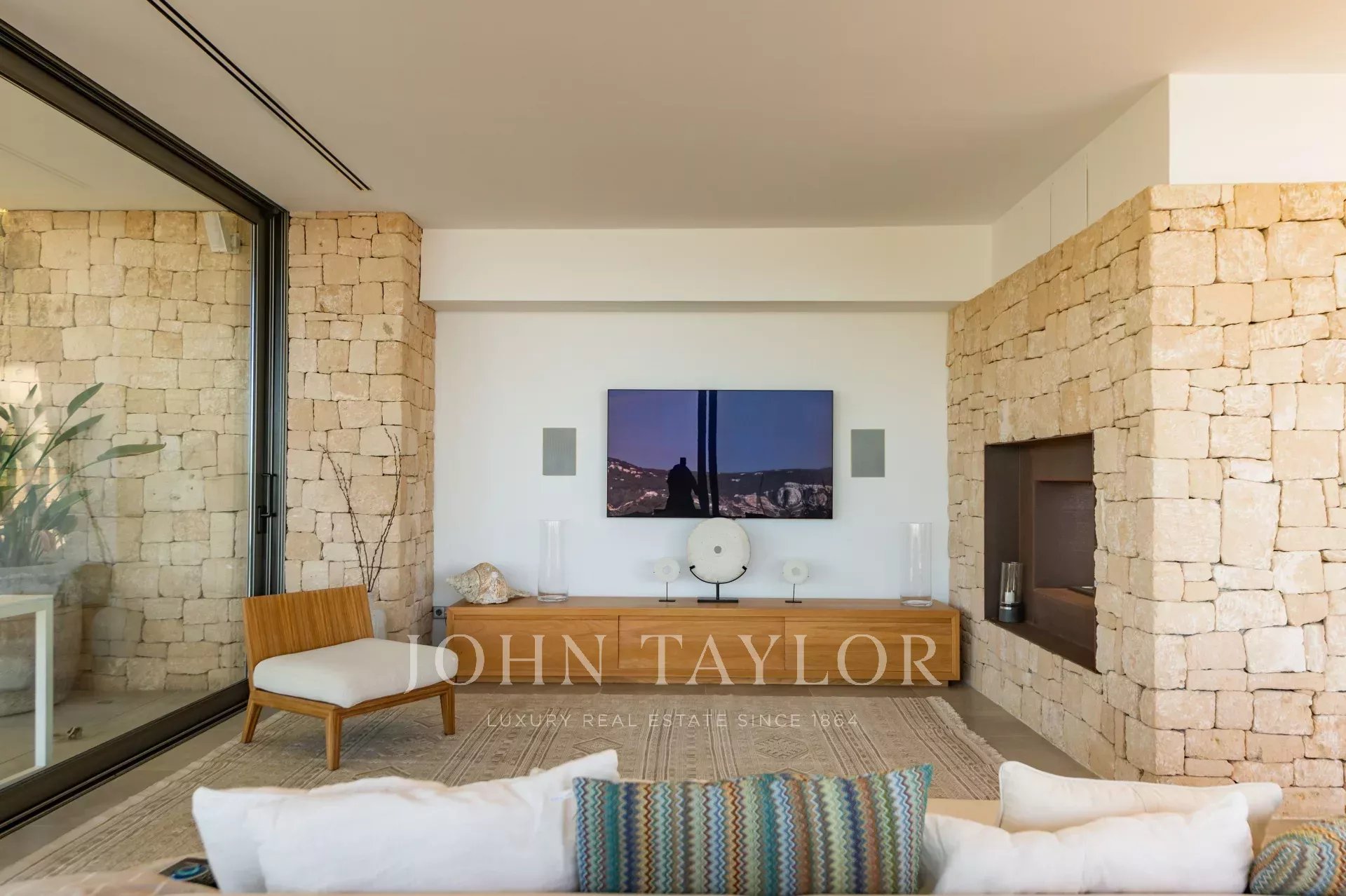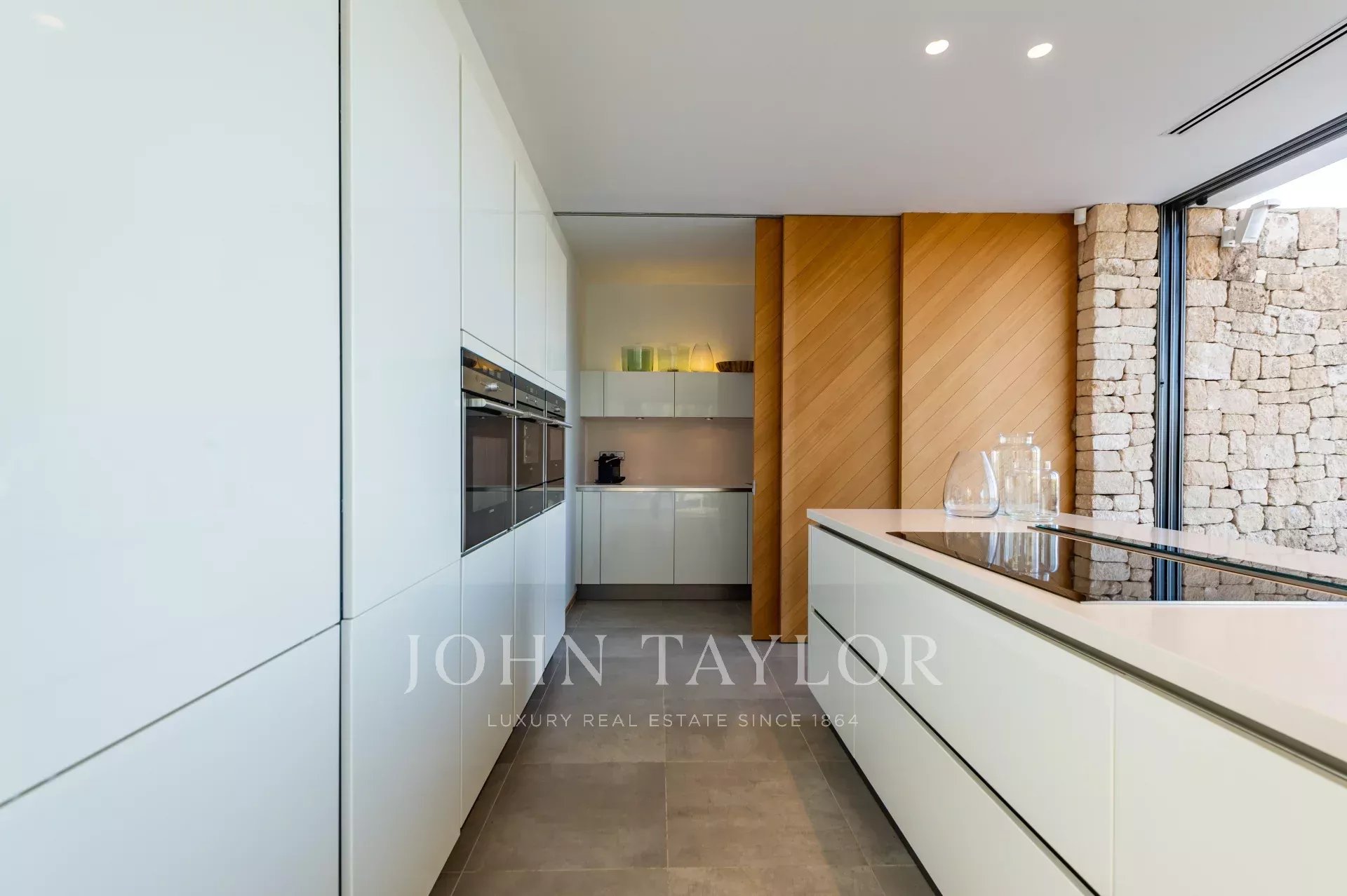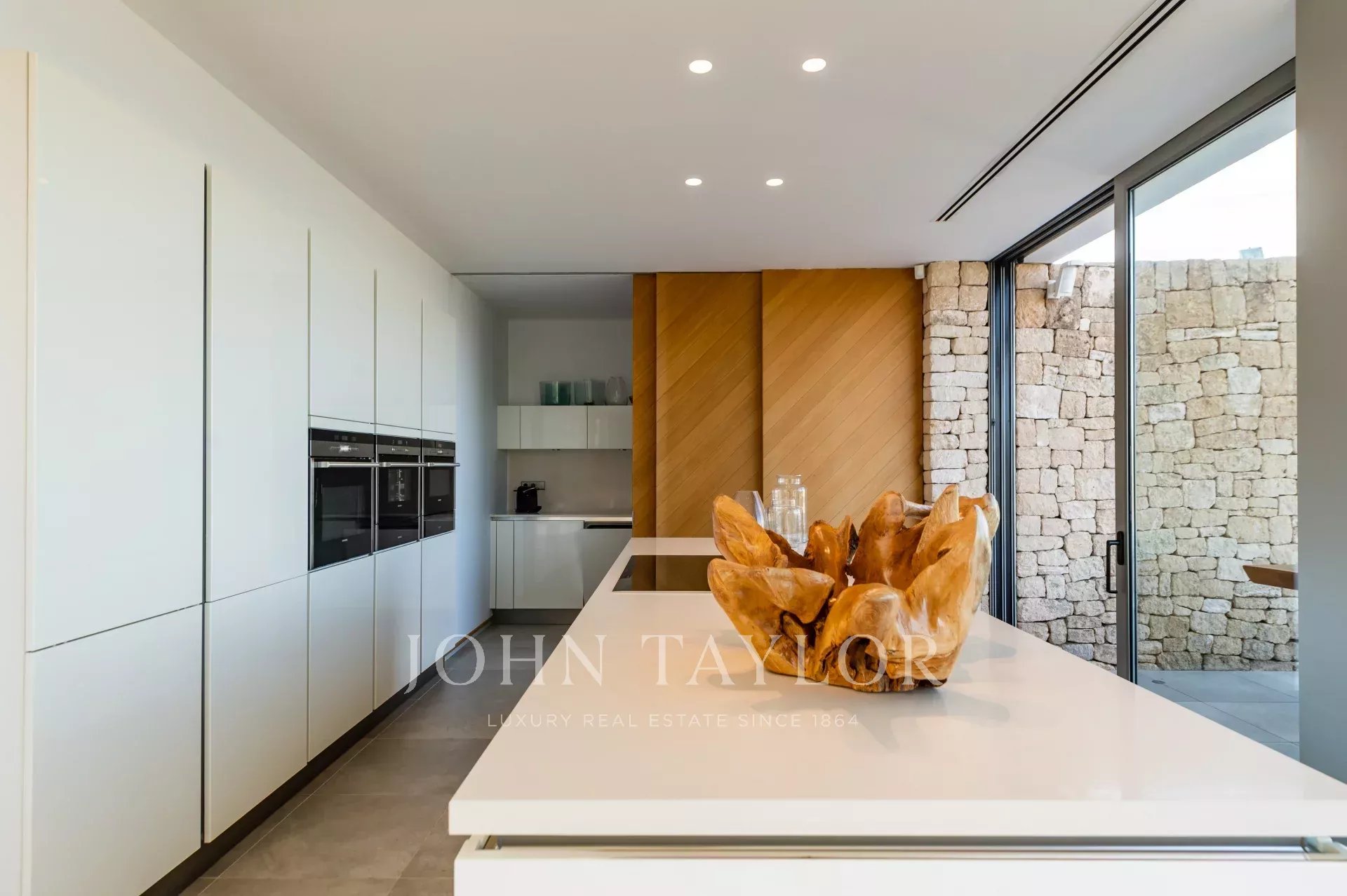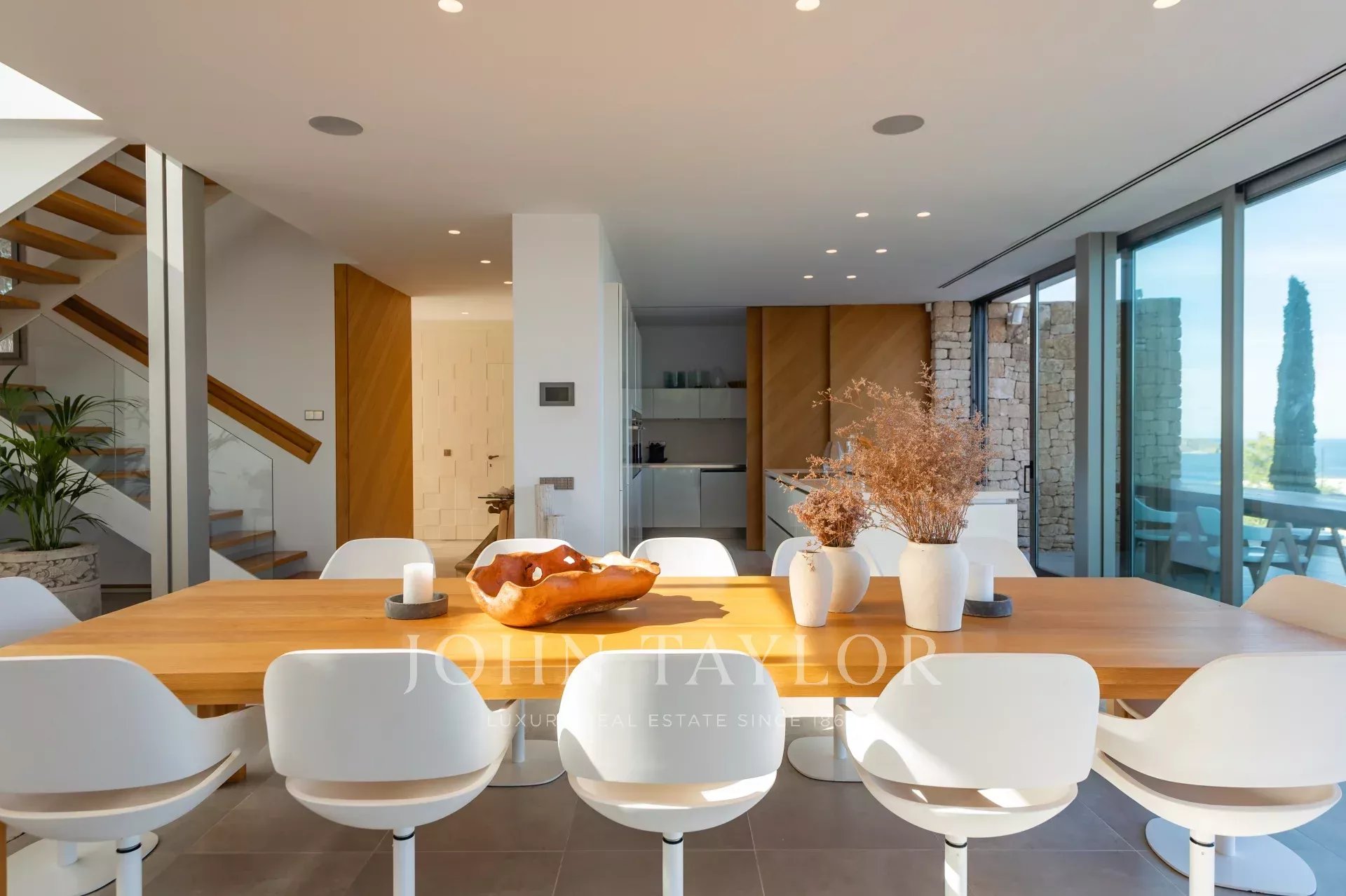 The main floor has a large kitchen, dining room and living room, all surrounded by large windows overlooking the outdoor terrace and pool with sea views. The kitchen is equipped with everything you need, including an American fridge, extra freezer, dishwasher, steam oven, traditional oven and microwave, blender and juicer. There is also a service toilet, a laundry room and a room for the house staff with two single beds and a bathroom with shower.