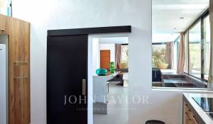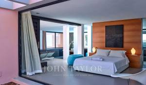 The exterior area features a large pool and jacuzzi, surrounded by sun loungers and umbrellas, as well as a barbecue area for outdoor dining. From the furnished terrace, you can enjoy the impressive sea view, making it the ideal spot to enjoy Ibiza's famous sunsets.