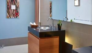 The villa offers several bedrooms with en-suite bathrooms, all with access to the outdoors through large sliding doors. The master bedroom, with an en-suite bathroom that includes a separate shower with side jets, is connected to the main living area but also offers privacy through sliding doors. Other bedrooms have direct access to the garden or a wooden terrace under the pool, creating a unique and relaxing atmosphere.