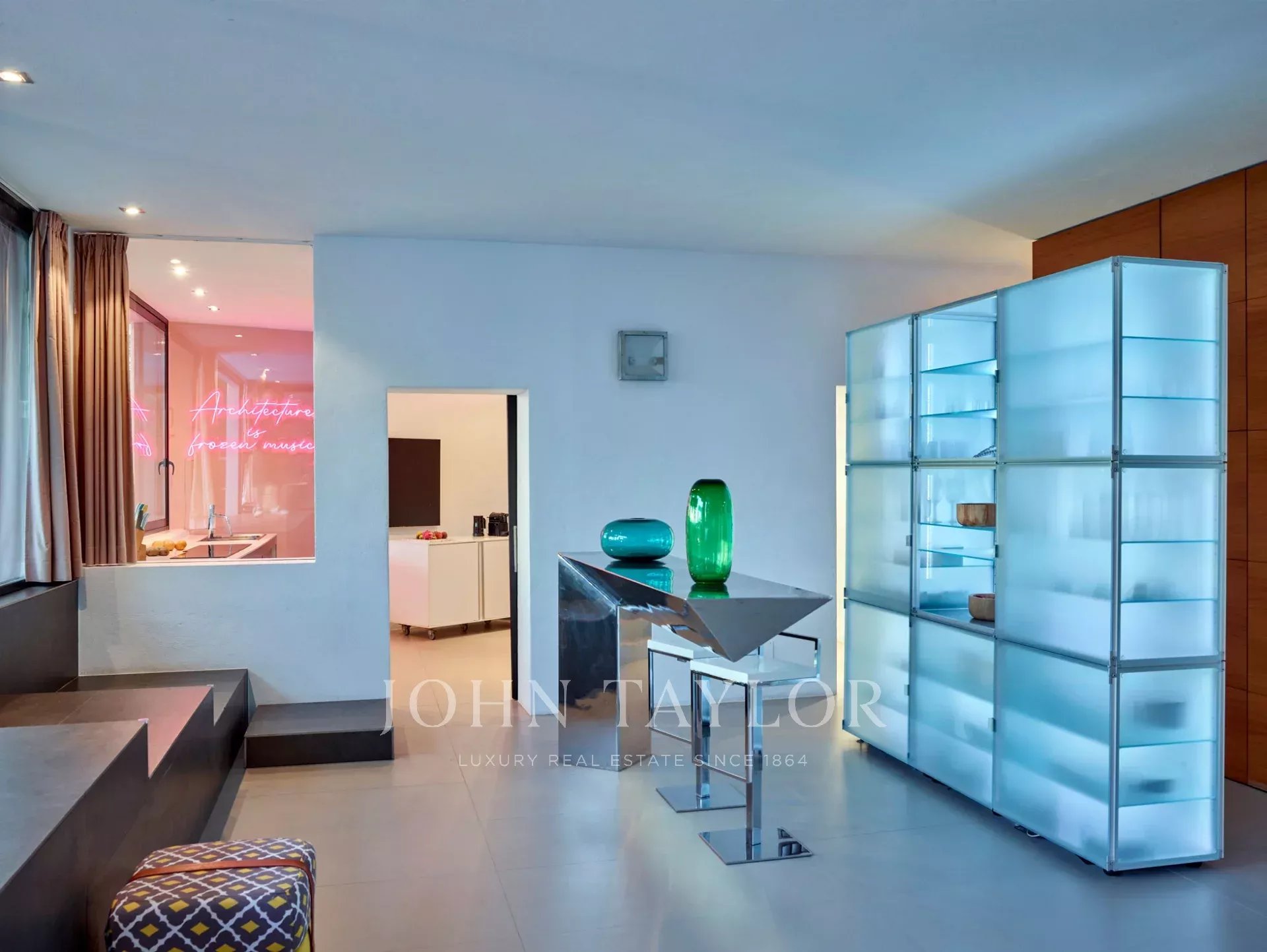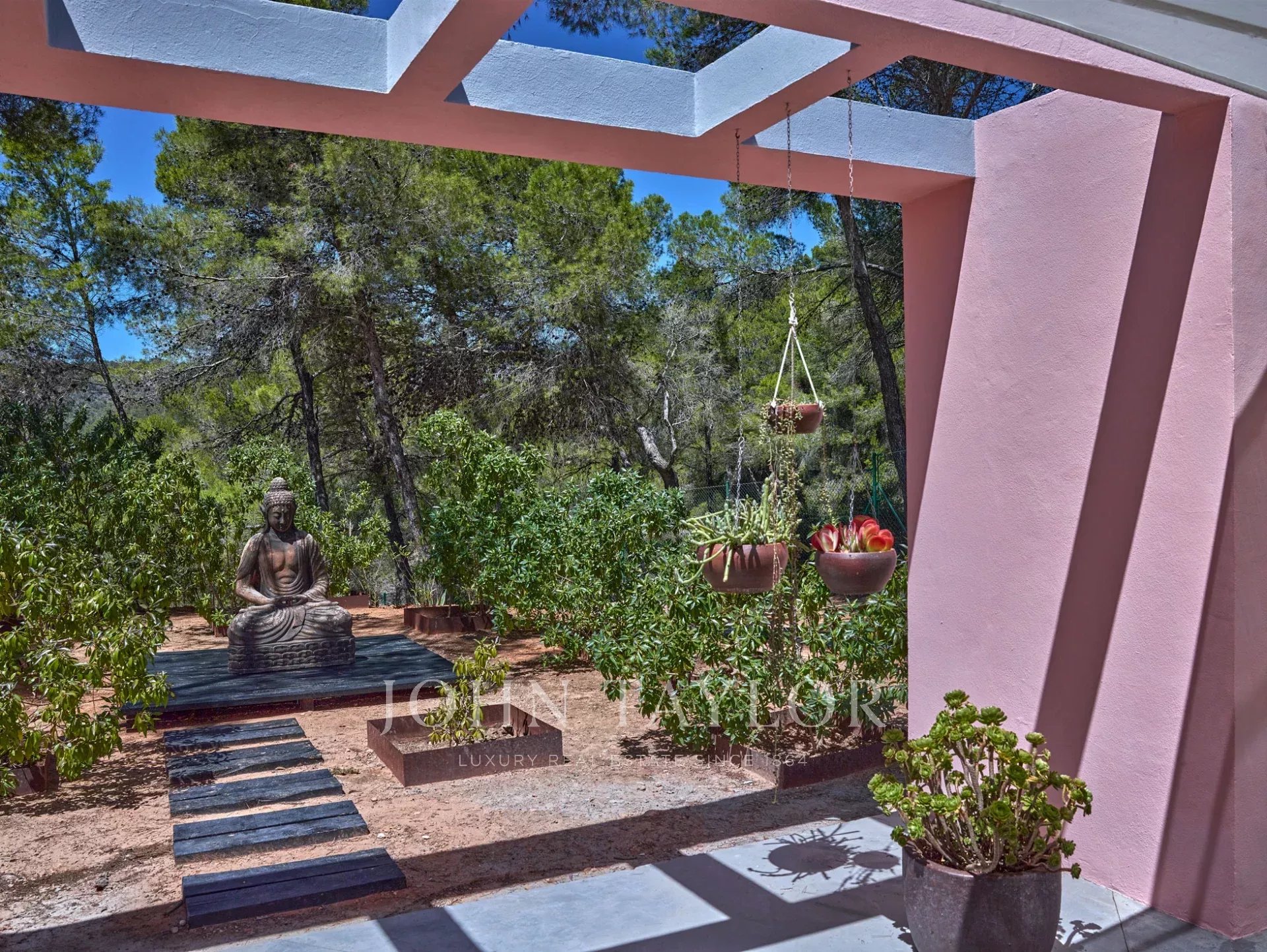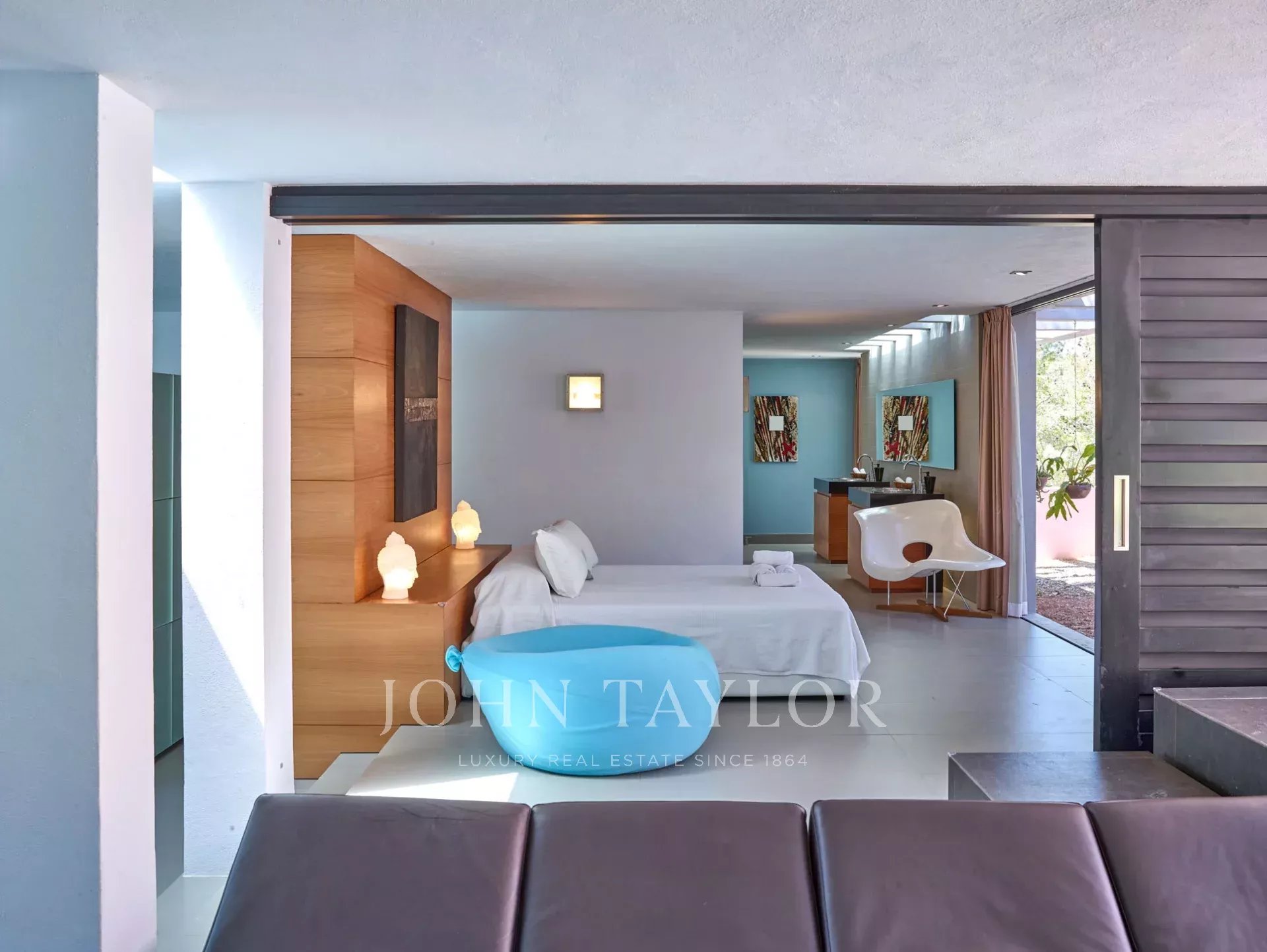 This impressive modern villa is located in the eastern part of Ibiza, near the famous Cala D'Hort and Cala Vadella beaches, surrounded by Mediterranean nature and pine trees. Situated on a quiet and private hillside, this hidden gem offers spectacular views of the sea and sunsets, ideal for enjoying unforgettable moments on the island. Just a few minutes from the charming village of San José, the property combines elegance, tranquility, and an unparalleled natural setting.