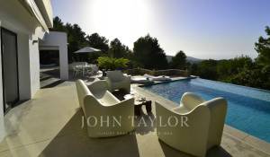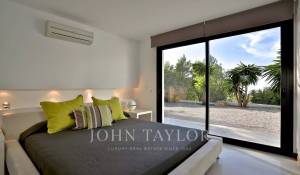 Nestled on a beautiful hillside between San José and Cala Tarida, this modern villa invites you to enjoy an exclusive lifestyle with breathtaking views of the sea and the Ibizan landscape. Upon entering, you will be greeted by a bright living room and a cozy dining area, equipped with air conditioning and a sound system that creates the perfect atmosphere. The fireplace adds a warm and inviting touch, while large windows allow natural light to flood the space and connect you with the terrace and pool.