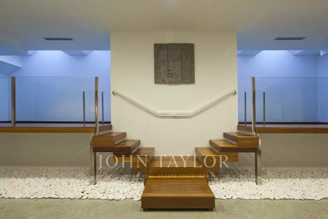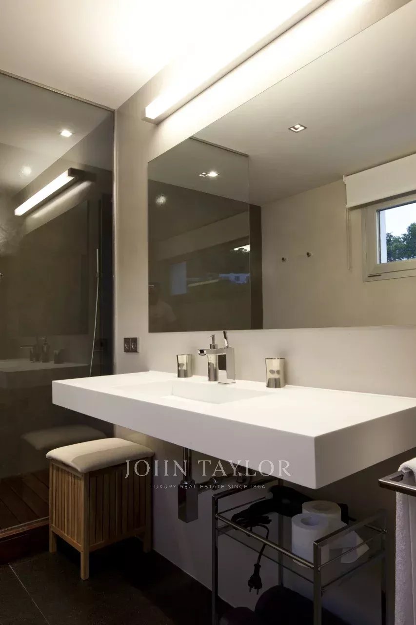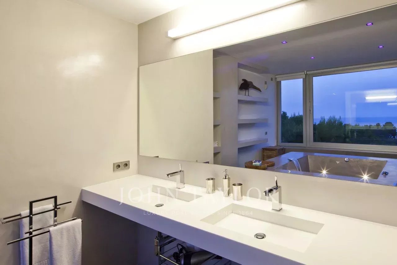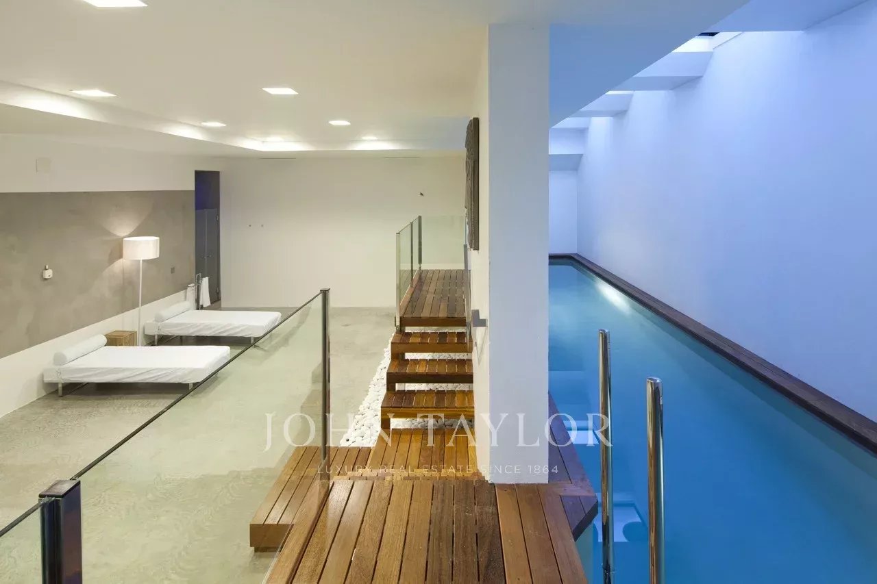 Newly built, the house offers spectacular sea views, indoor and outdoor pool, garden, spacious terrace areas and a spa.