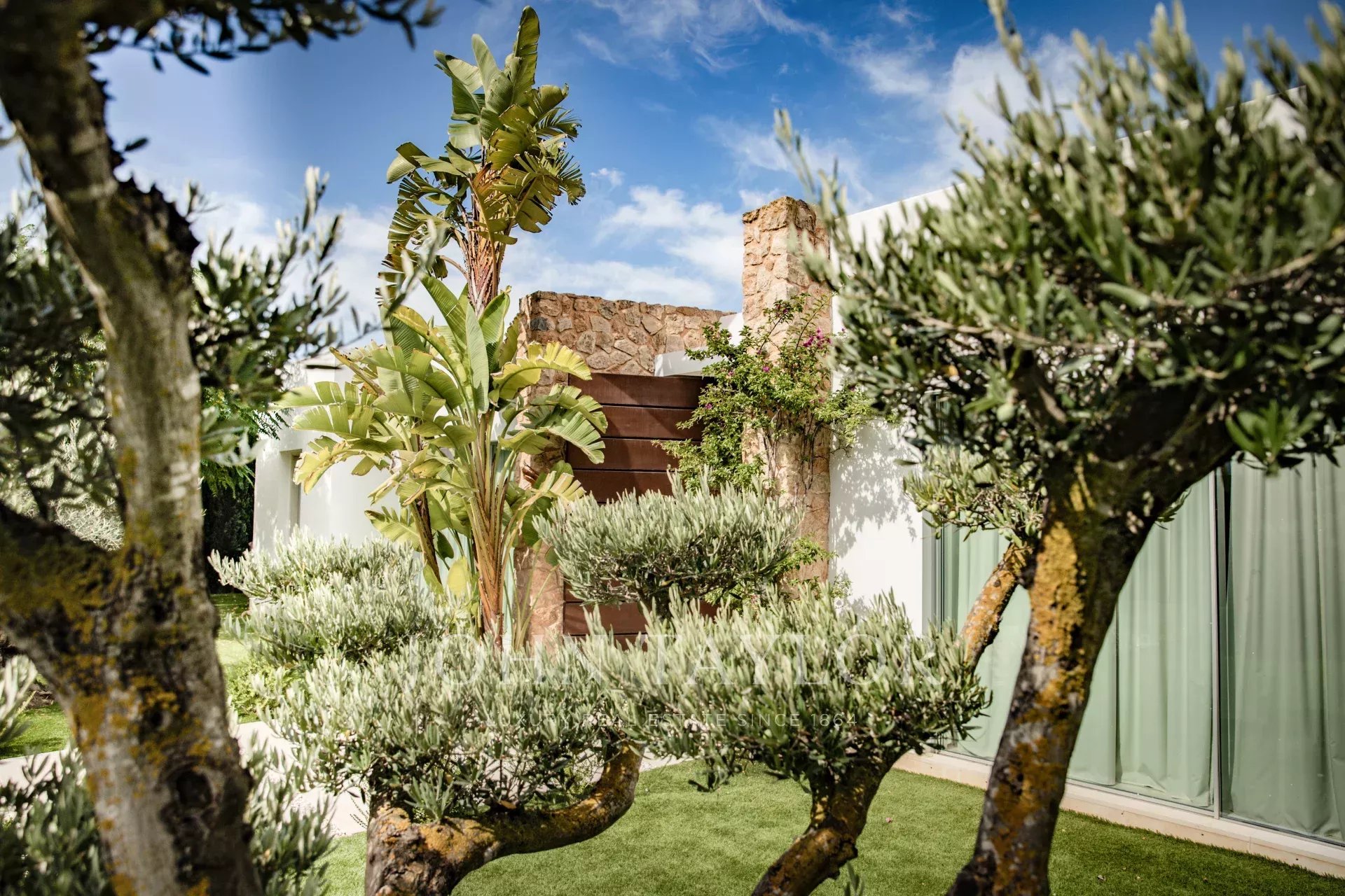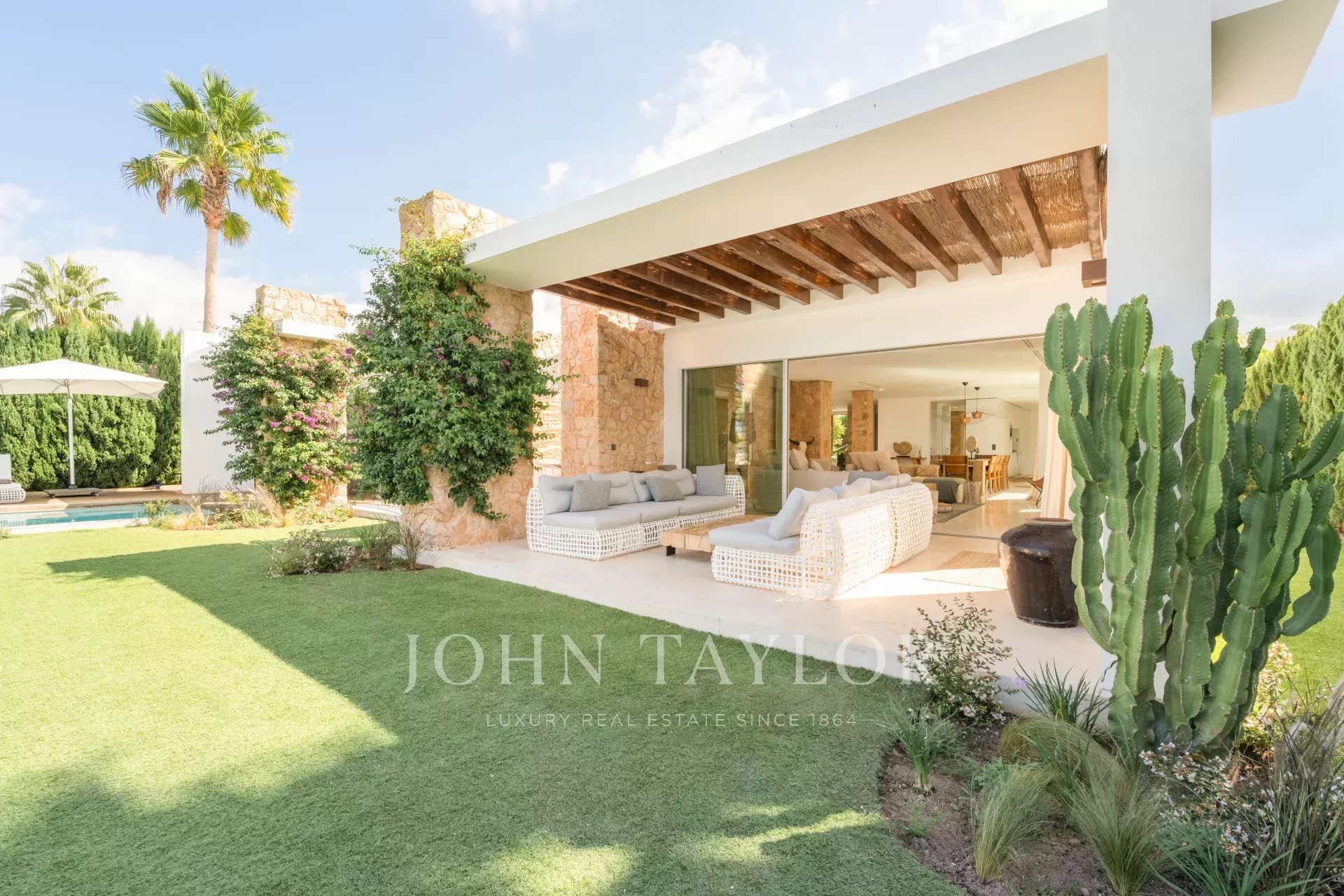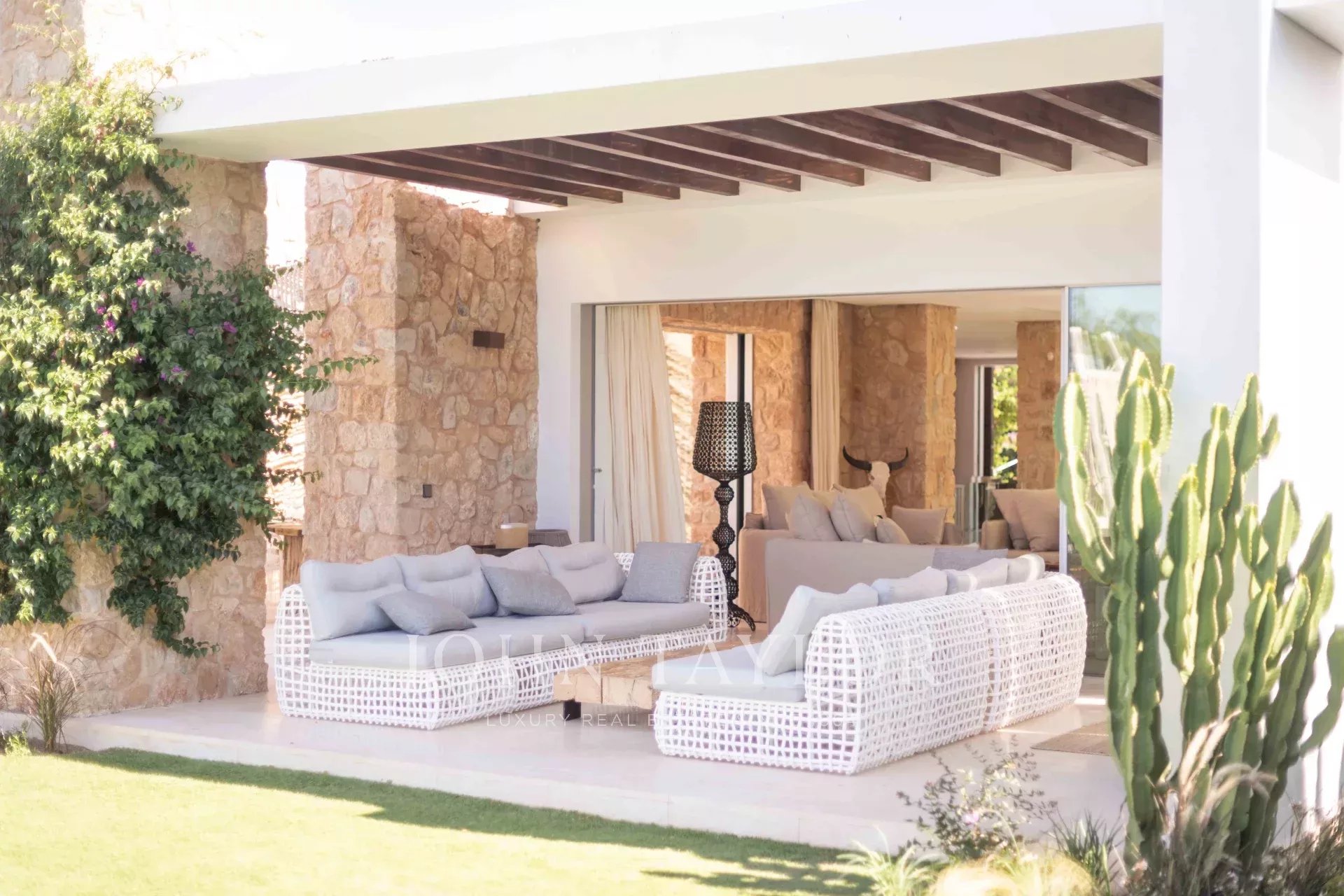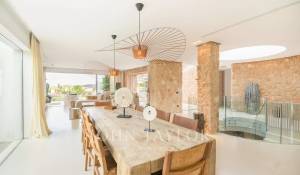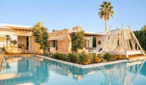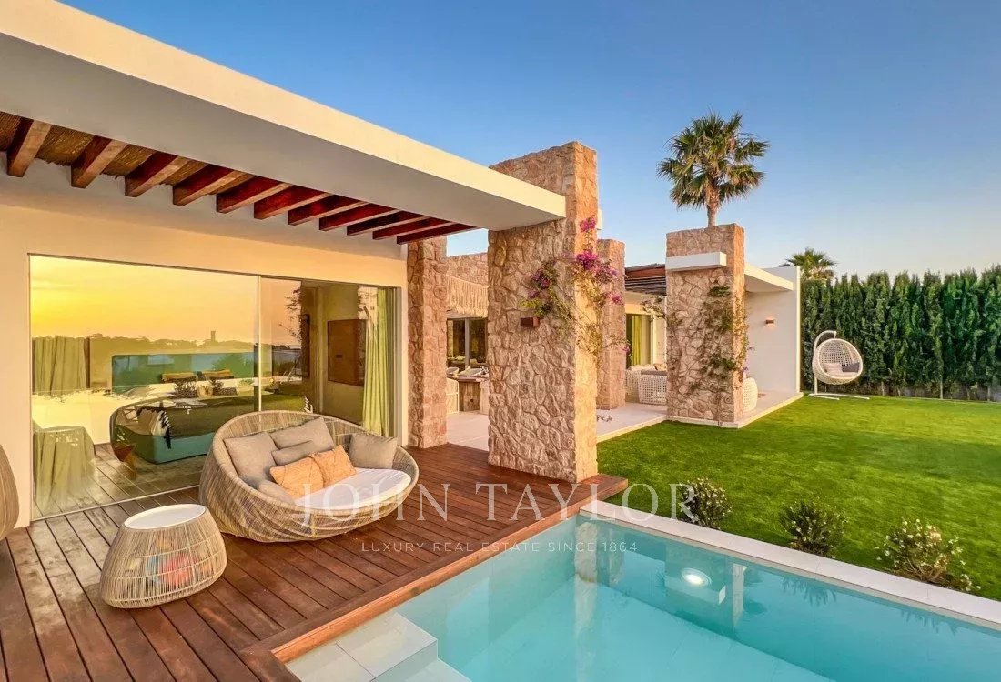 This extraordinary modern villa with five bedrooms is located just 400 meters from the stunning Cala Conta beach, known for the famous Sunset Ashram restaurant. Other nearby beaches, such as Cala Tarida with the exclusive Cotton Beach Club or Cala Bassa with its renowned Beach Club, are just a short drive away.