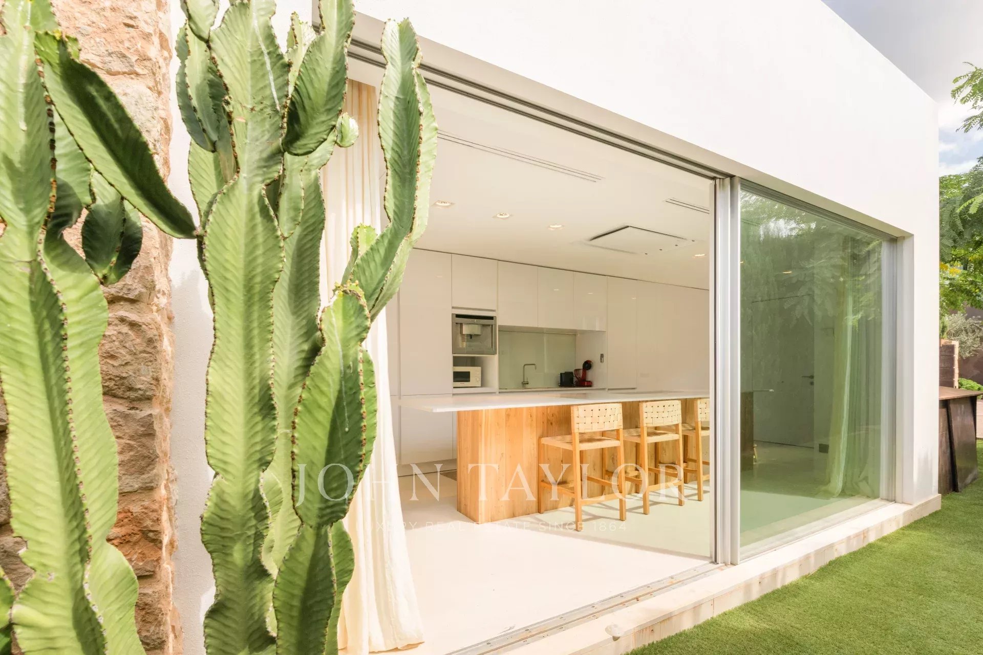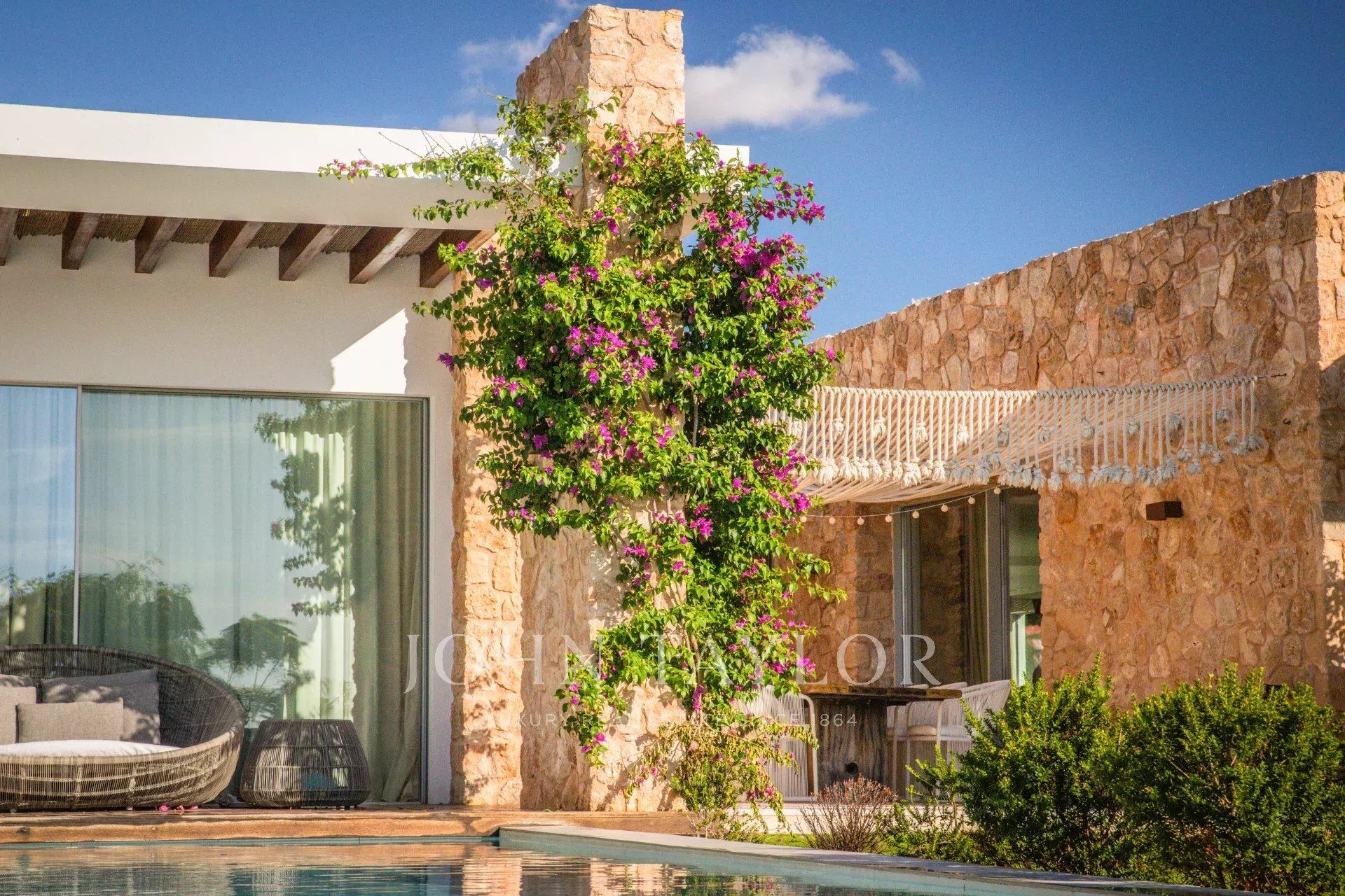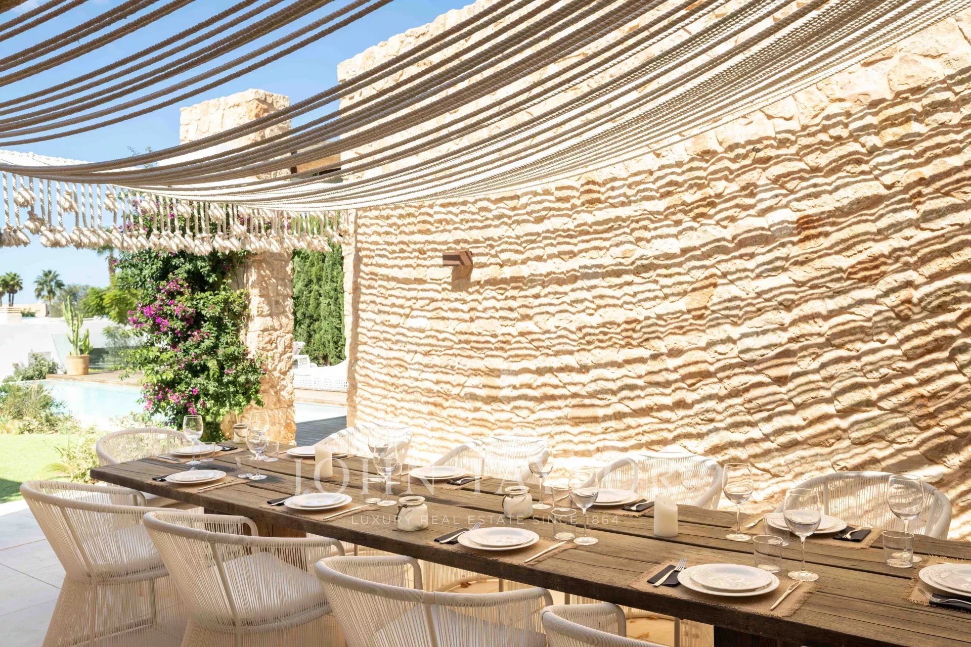 This extraordinary modern villa with five bedrooms is located just 400 meters from the stunning Cala Conta beach, known for the famous Sunset Ashram restaurant. Other nearby beaches, such as Cala Tarida with the exclusive Cotton Beach Club or Cala Bassa with its renowned Beach Club, are just a short drive away.