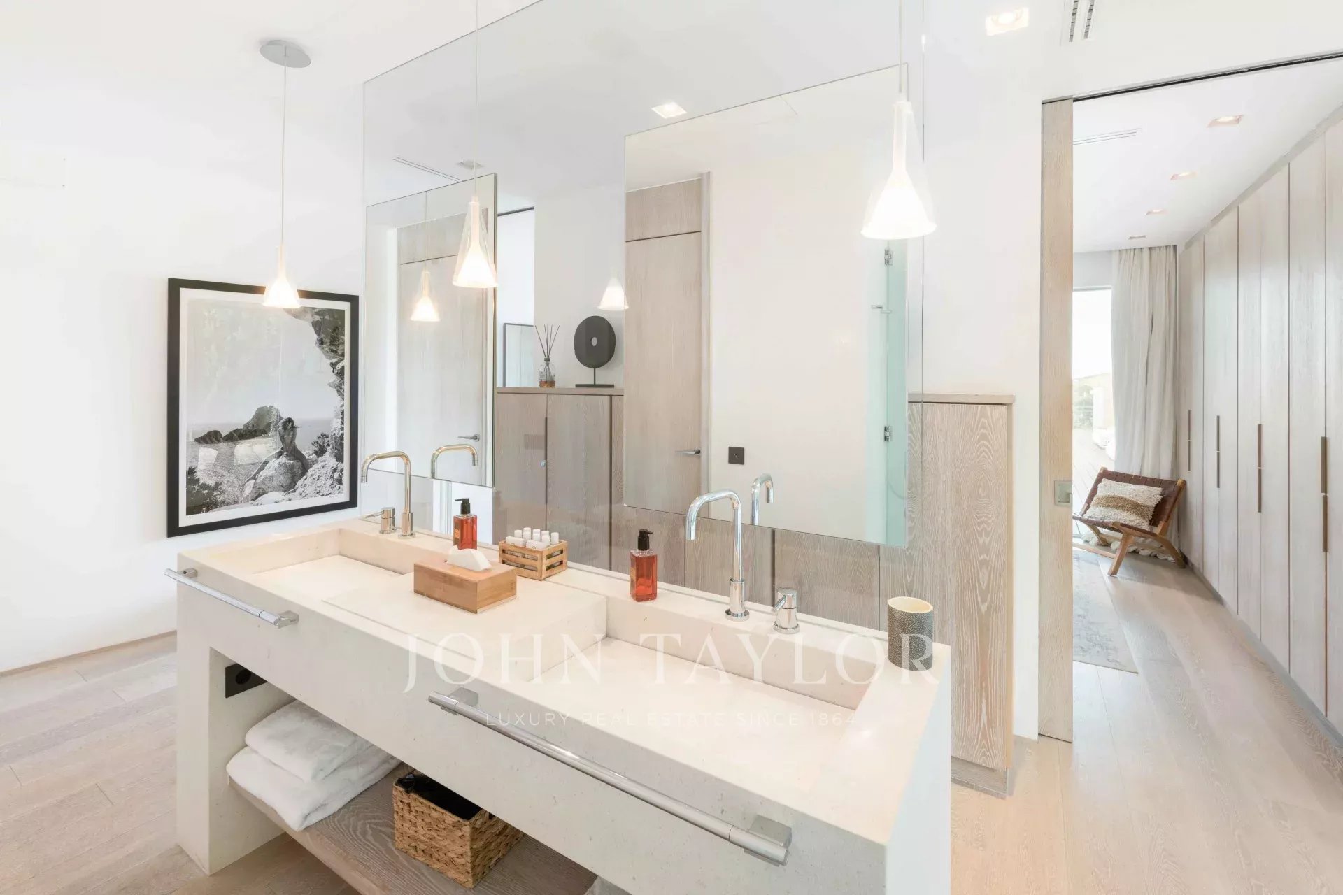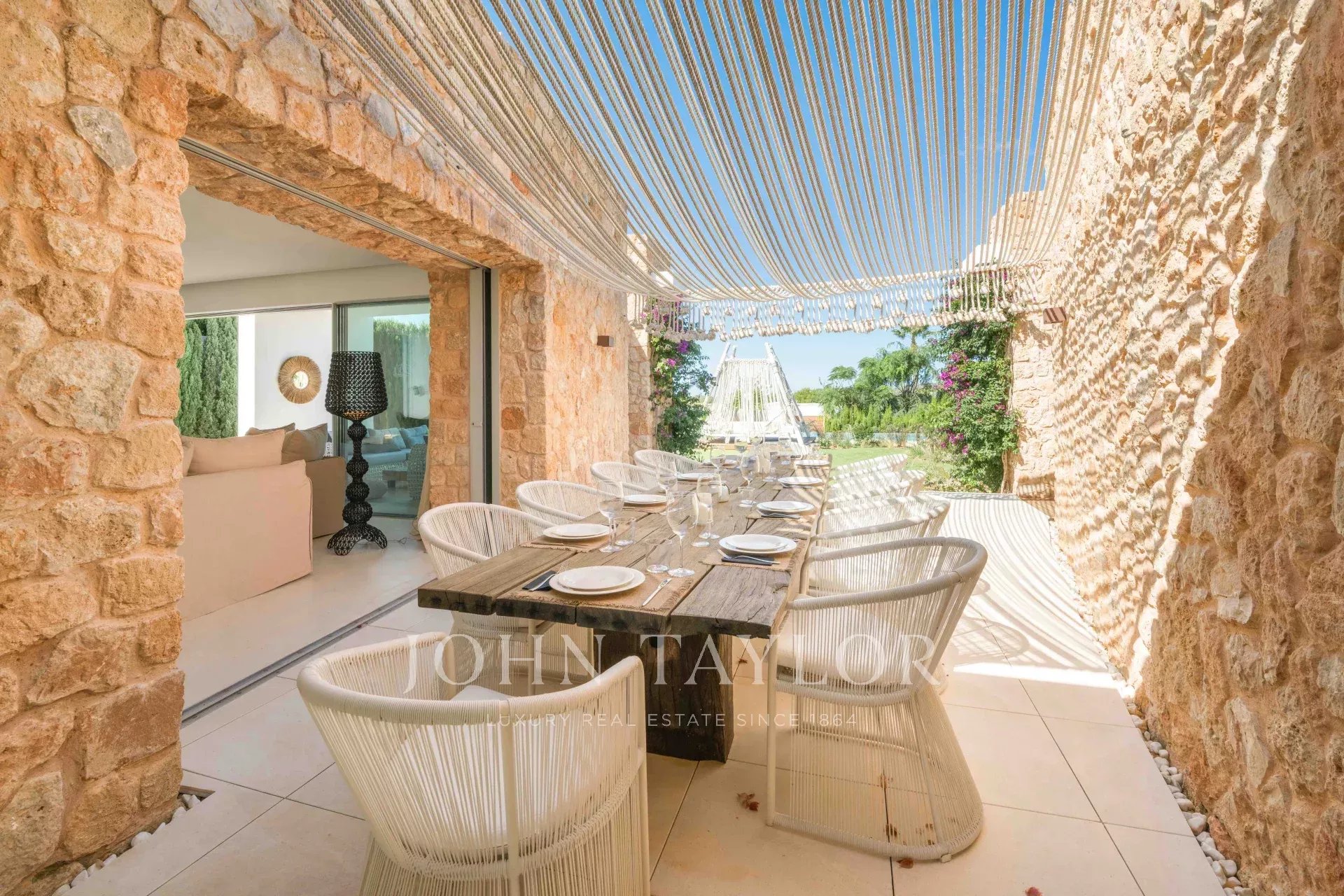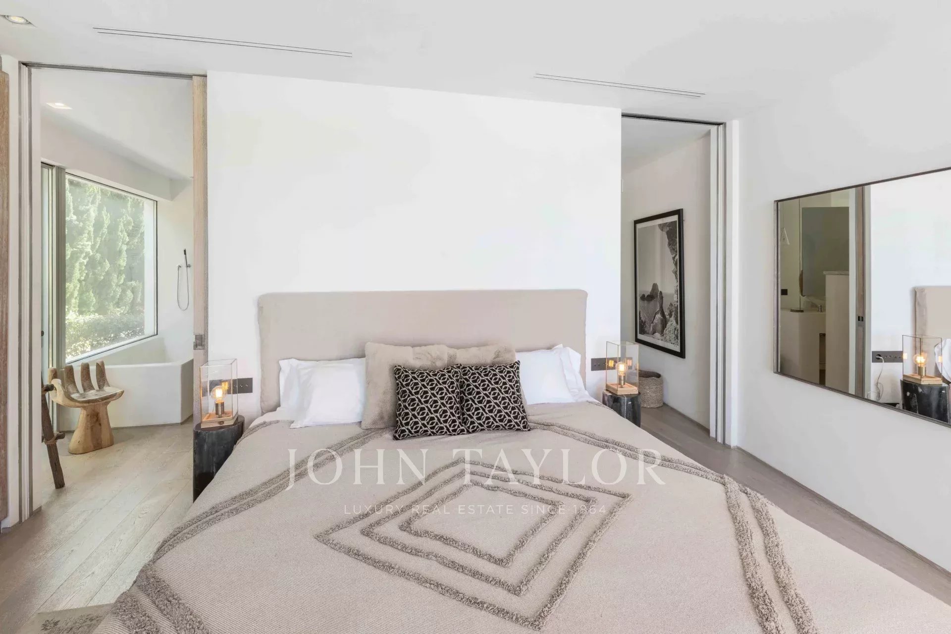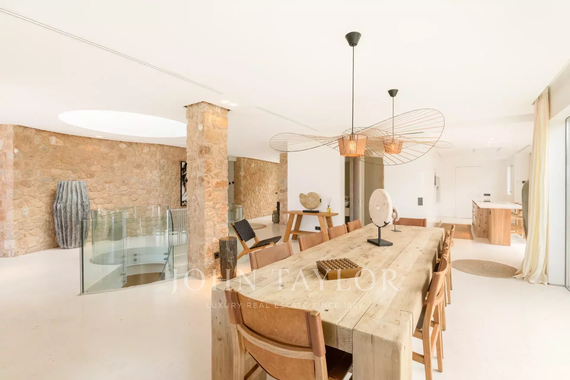 This extraordinary modern villa with five bedrooms is located just 400 meters from the stunning Cala Conta beach, known for the famous Sunset Ashram restaurant. Other nearby beaches, such as Cala Tarida with the exclusive Cotton Beach Club or Cala Bassa with its renowned Beach Club, are just a short drive away.