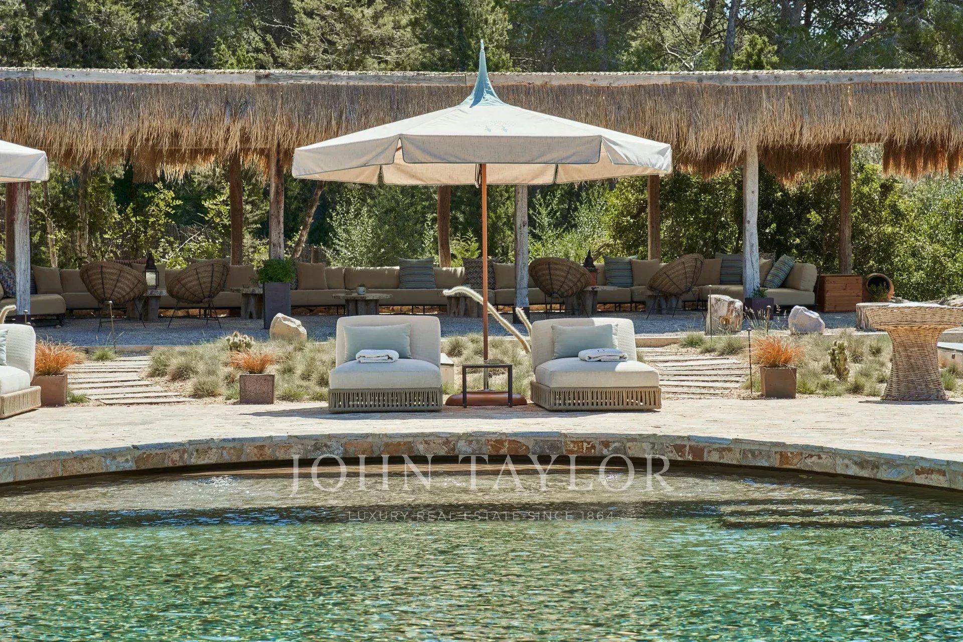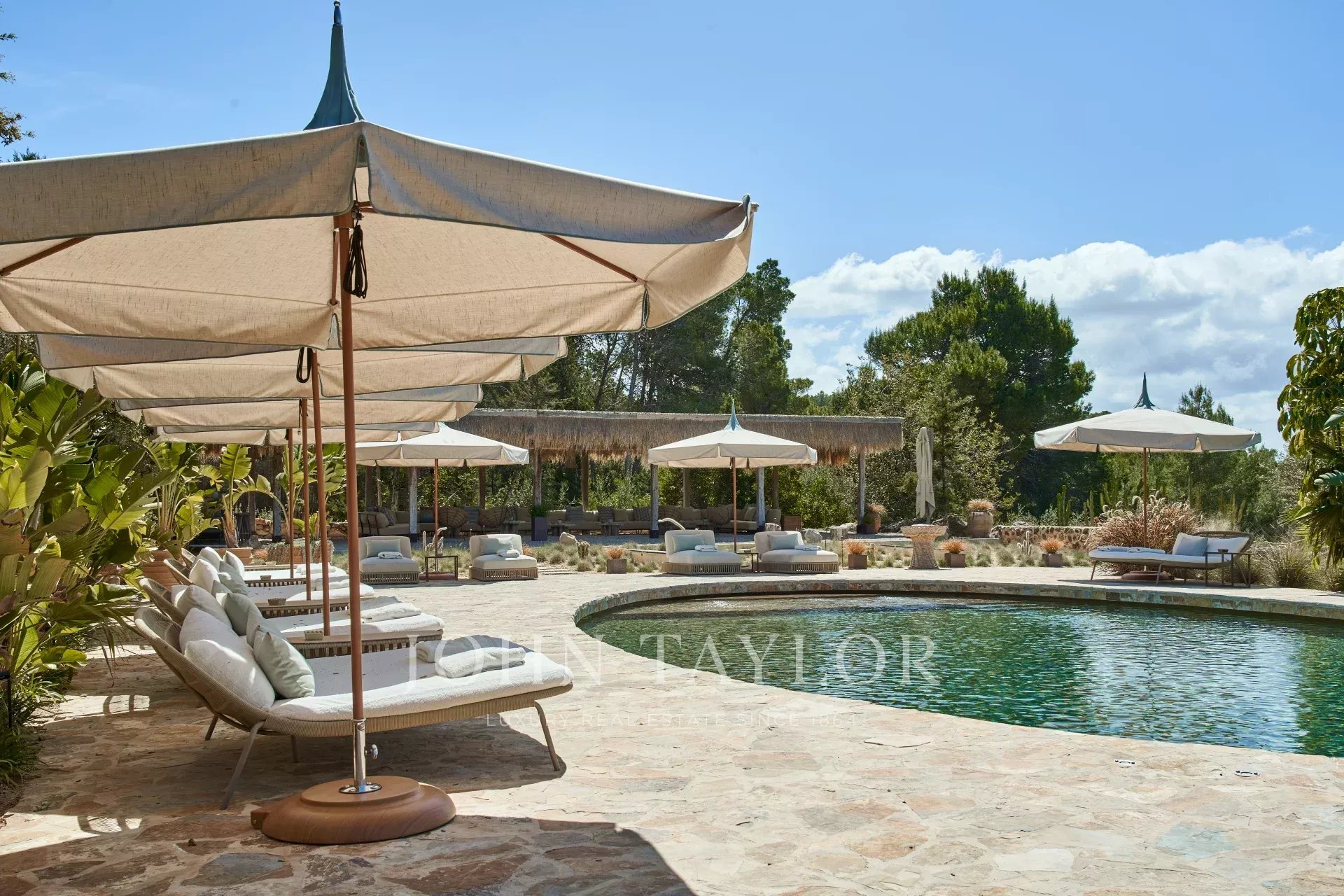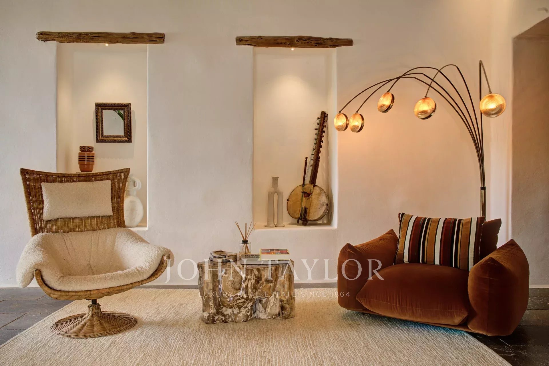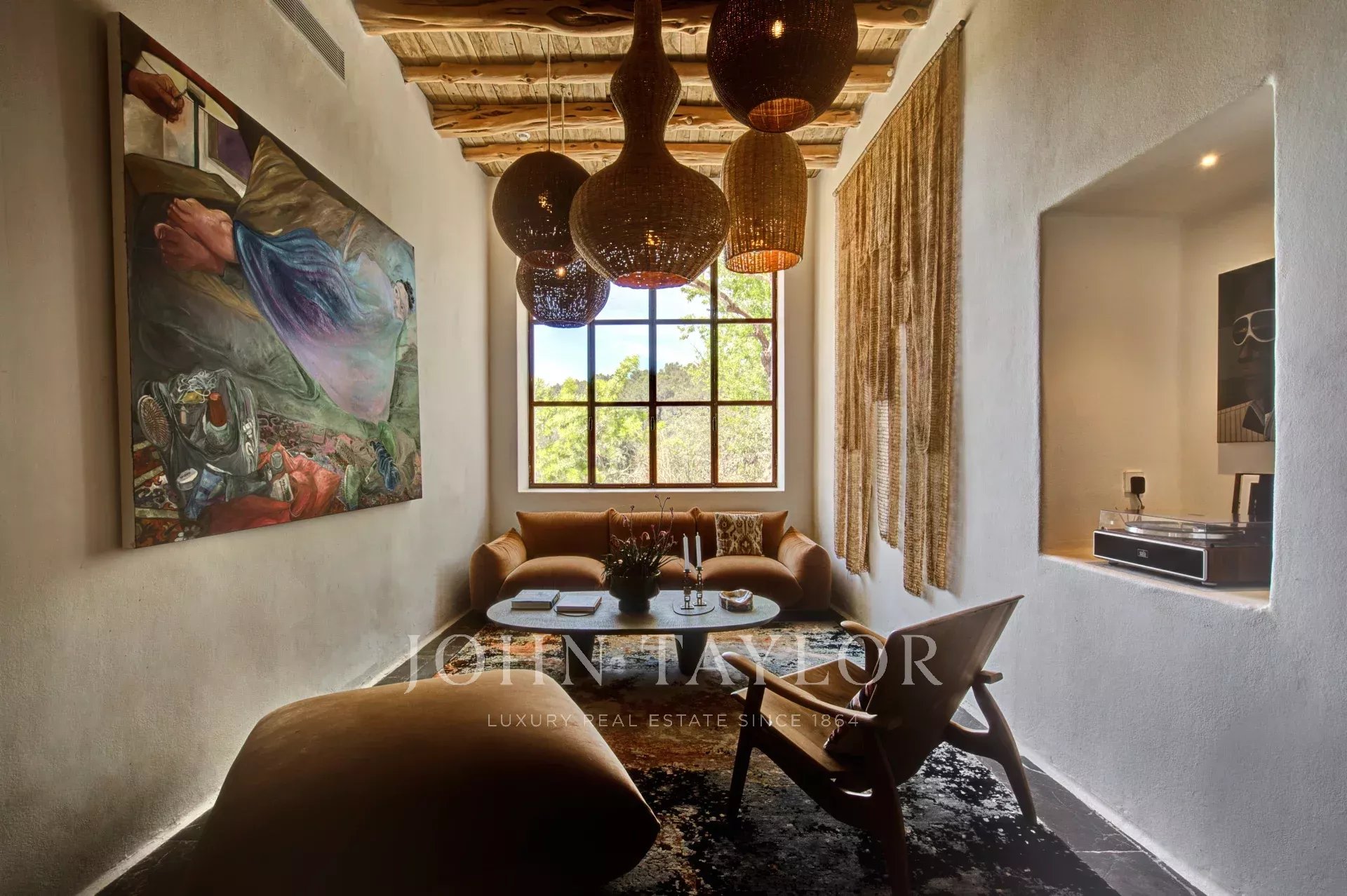 Escape to an oasis of luxury and authenticity in the north of Ibiza. This stunning nine-bedroom finca blends history, design, and nature in a private 21-acre setting. Enjoy a spectacular saltwater pool, wellness areas, sunny terraces, and a soundproof private cave for exclusive celebrations.