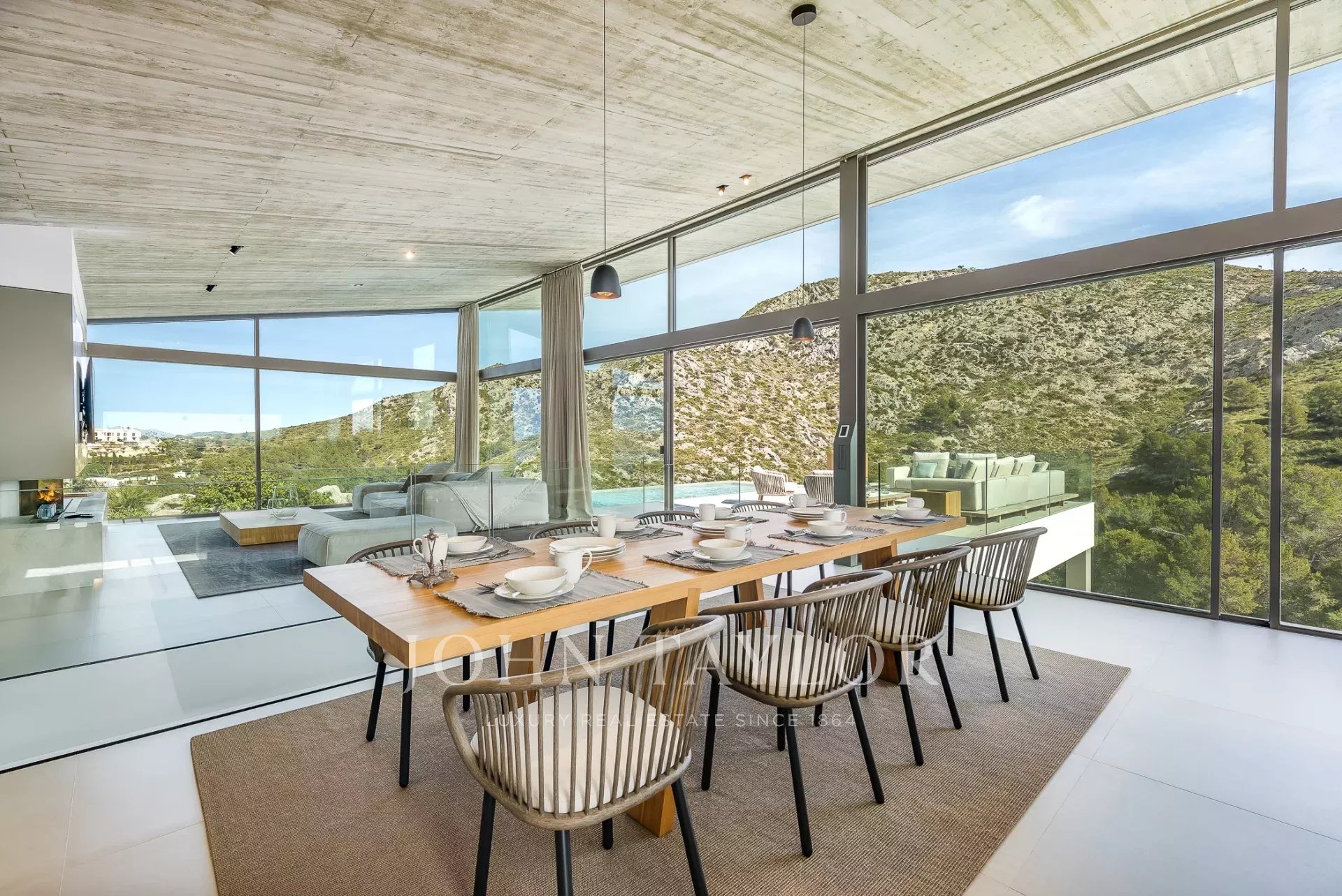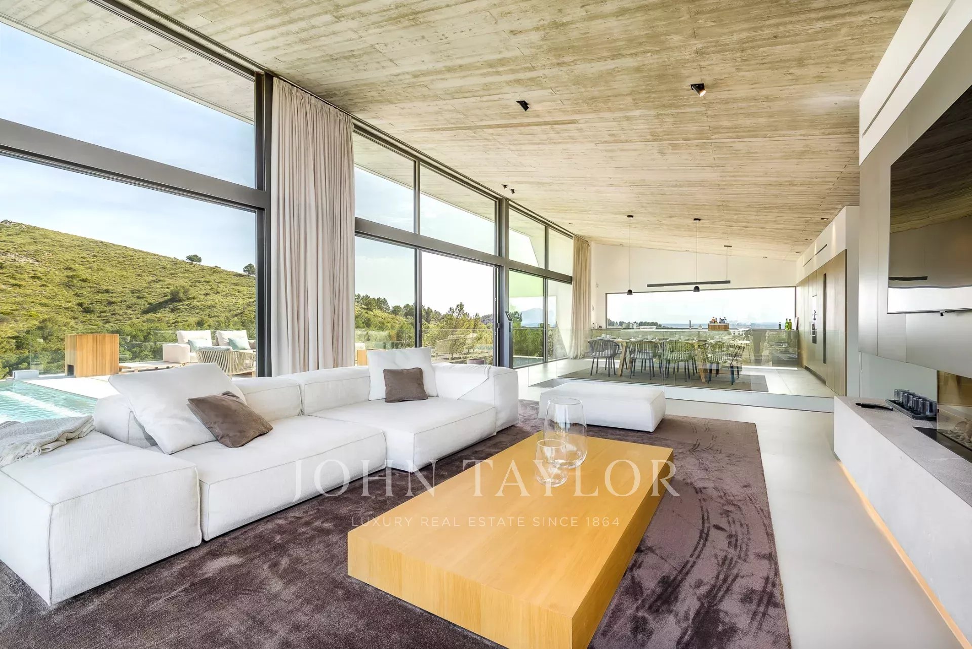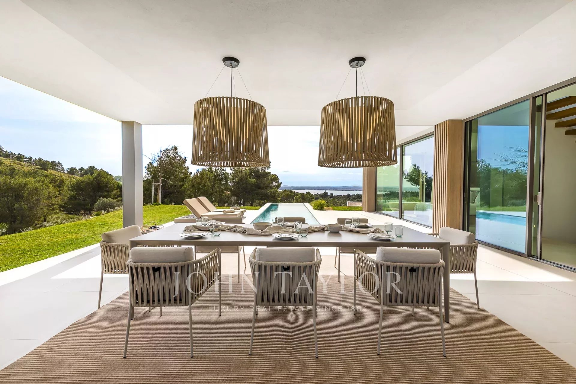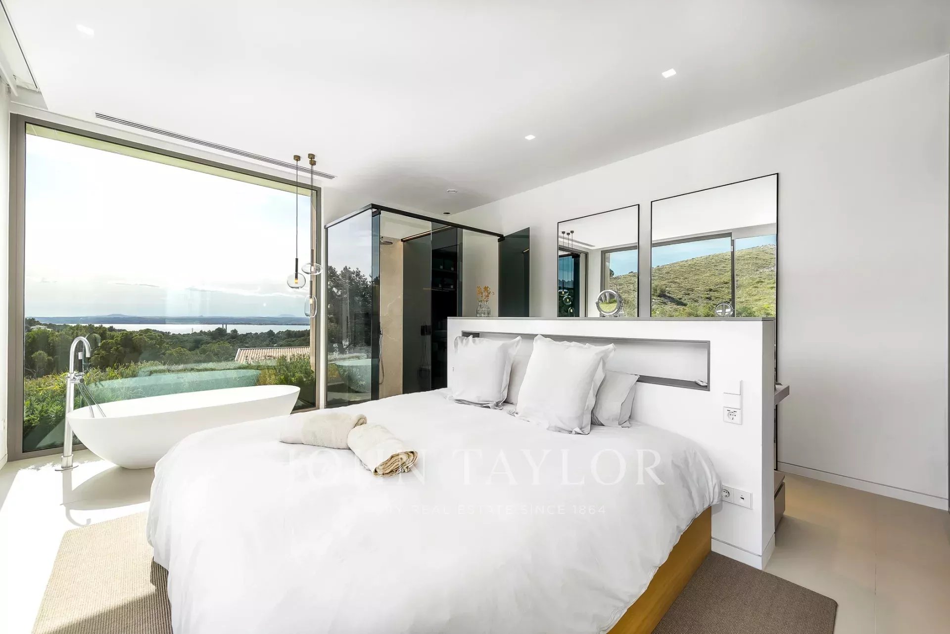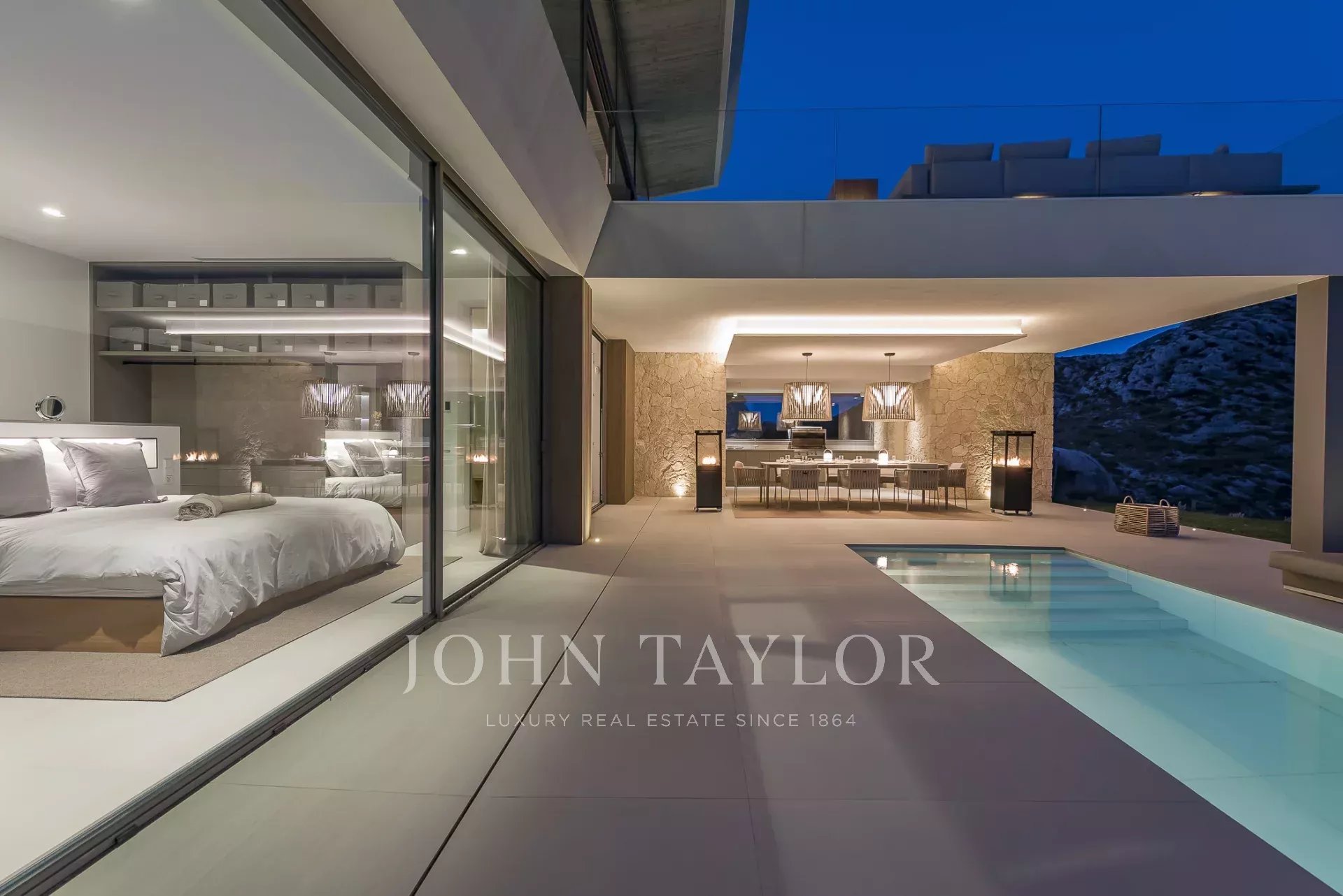 The house is modern and furnished to a high standard. Warm colours and materials offer the guest a special feel-good ambience. The 4 double bedrooms are located on the ground floor, outside you have access to a large terrace. with fully equipped outdoor kitchen and one of the two pools. Upstairs is the open-plan kitchen/living room with panoramic windows, the cosy living area with gas fireplace, and another terrace with a Jacuzzi pool.