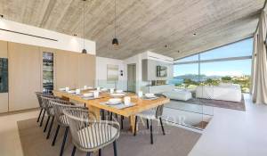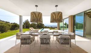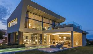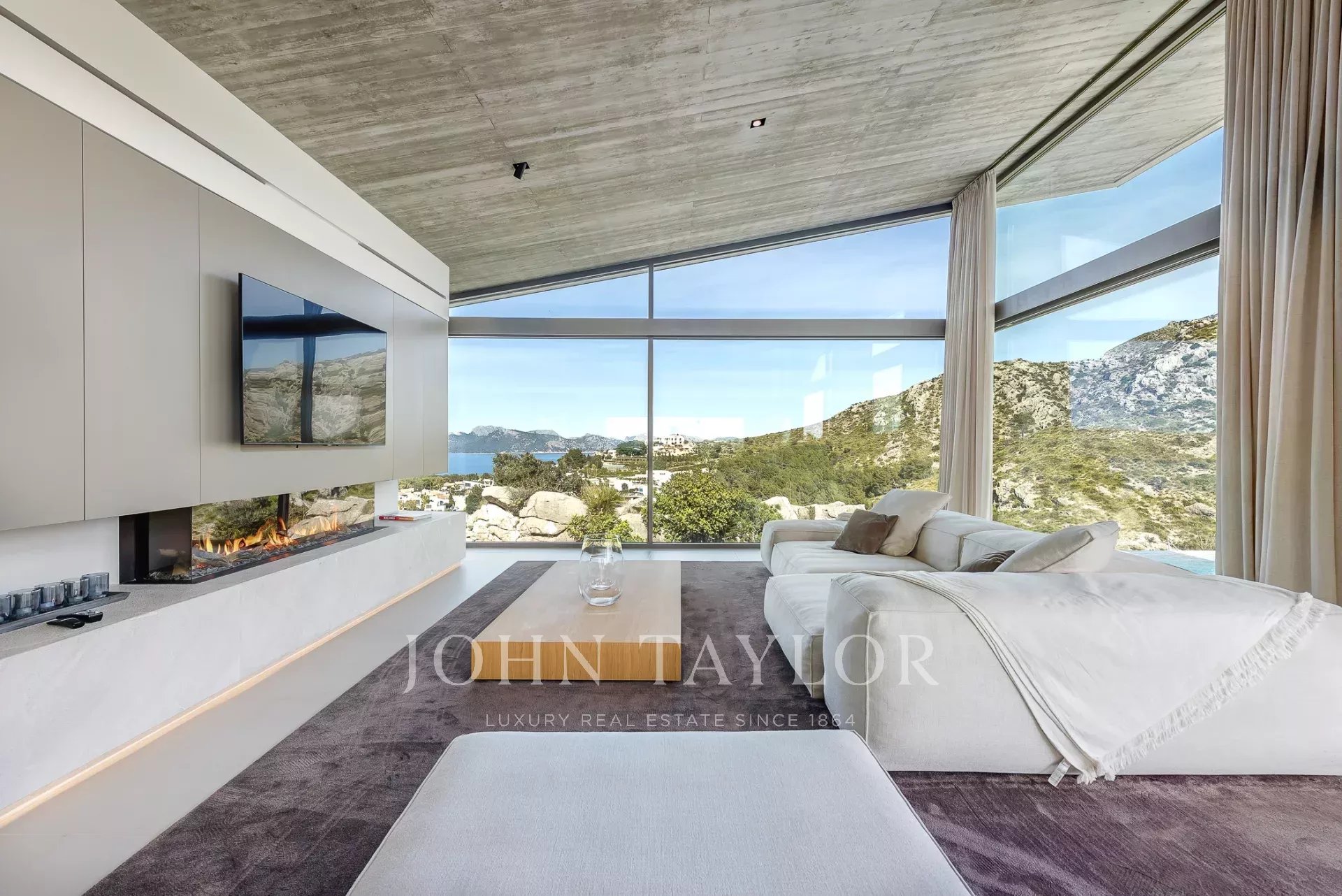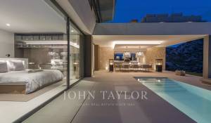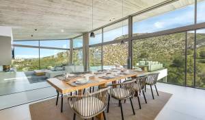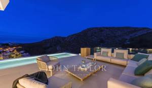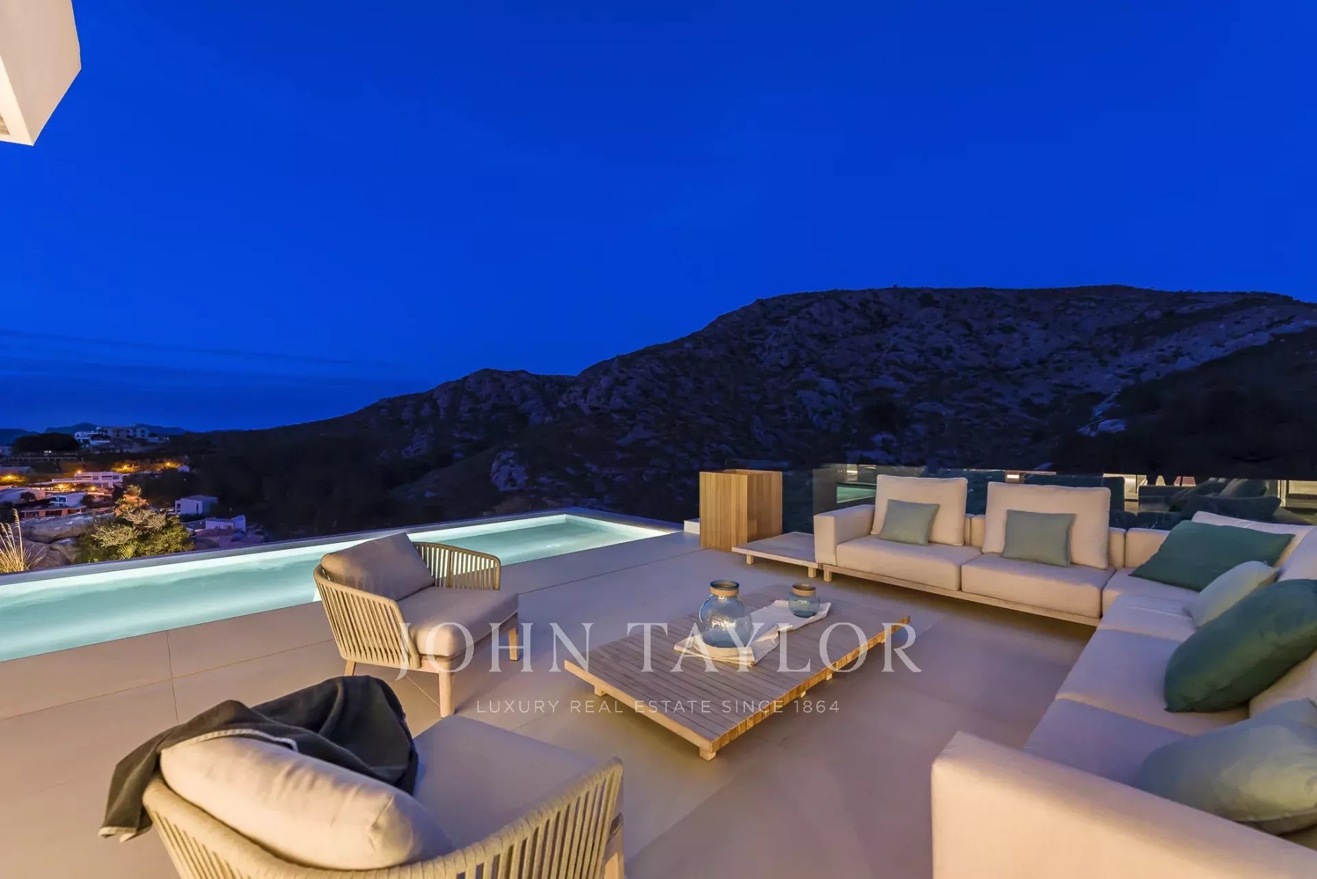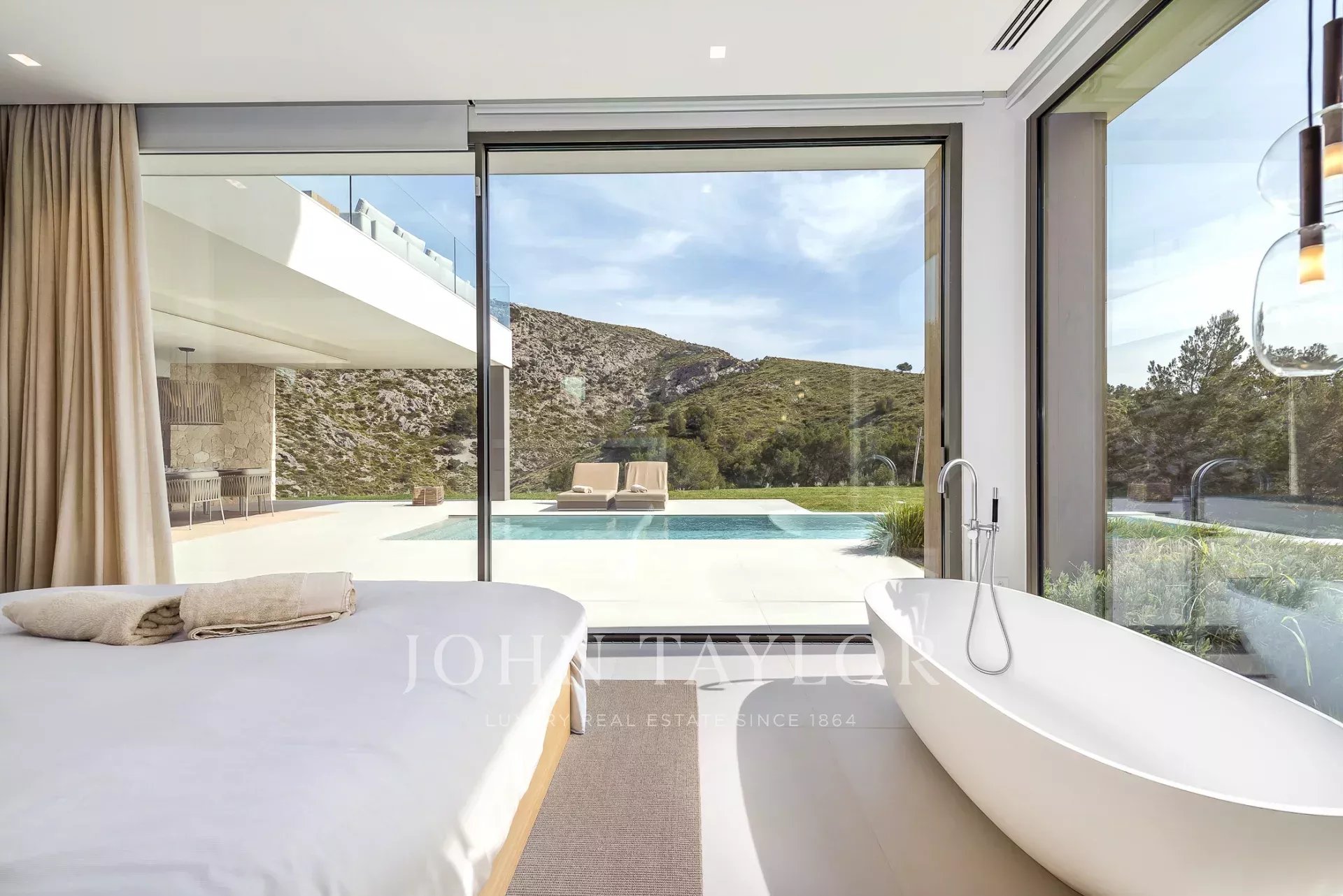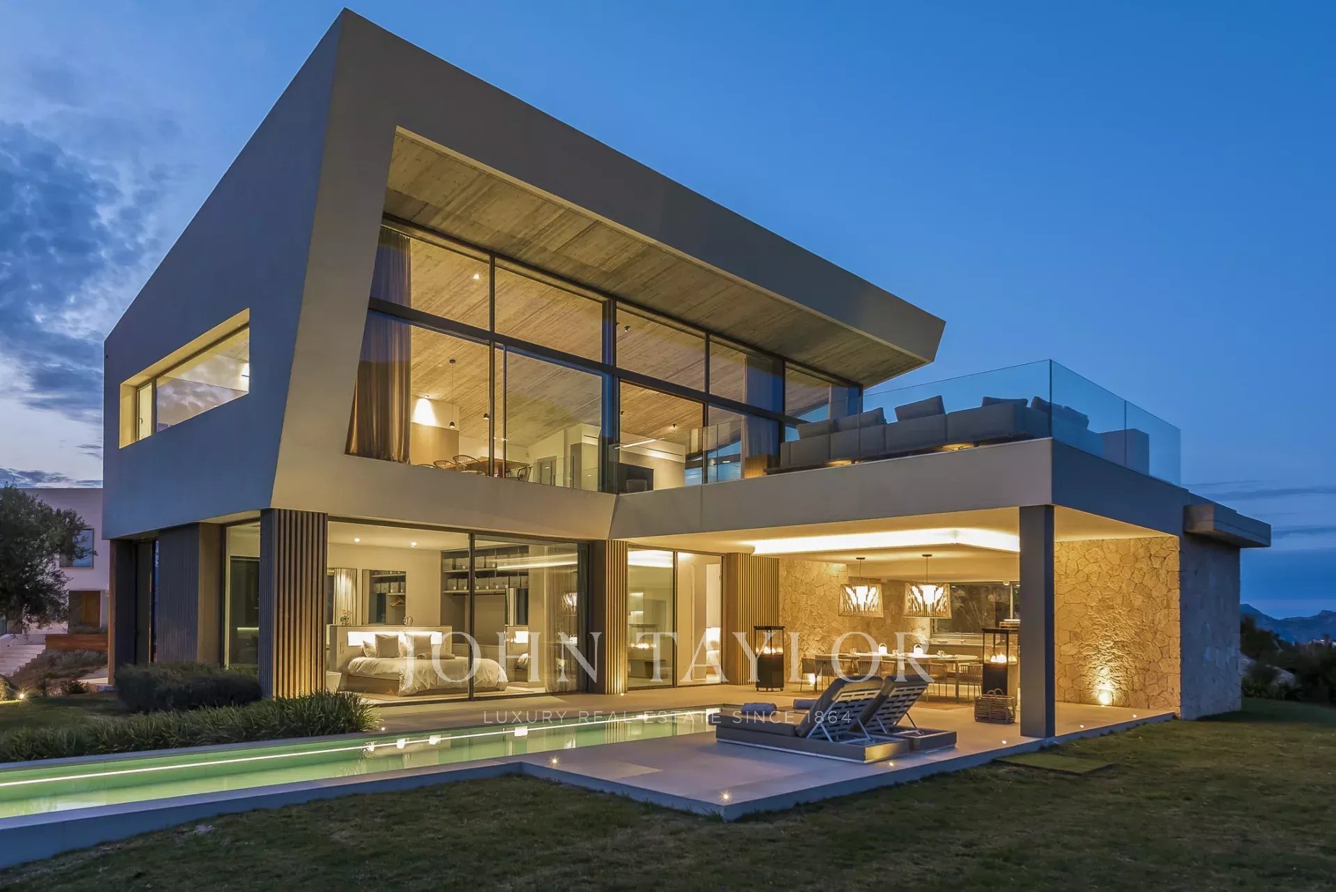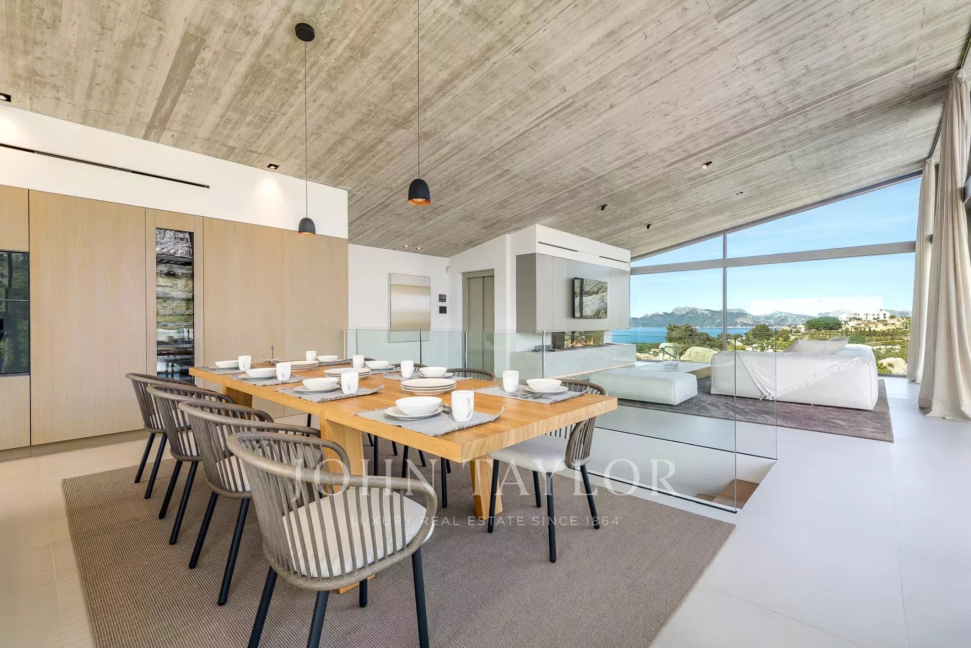 The house is modern and furnished to a high standard. Warm colours and materials offer the guest a special feel-good ambience. The 4 double bedrooms are located on the ground floor, outside you have access to a large terrace. with fully equipped outdoor kitchen and one of the two pools. Upstairs is the open-plan kitchen/living room with panoramic windows, the cosy living area with gas fireplace, and another terrace with a Jacuzzi pool.