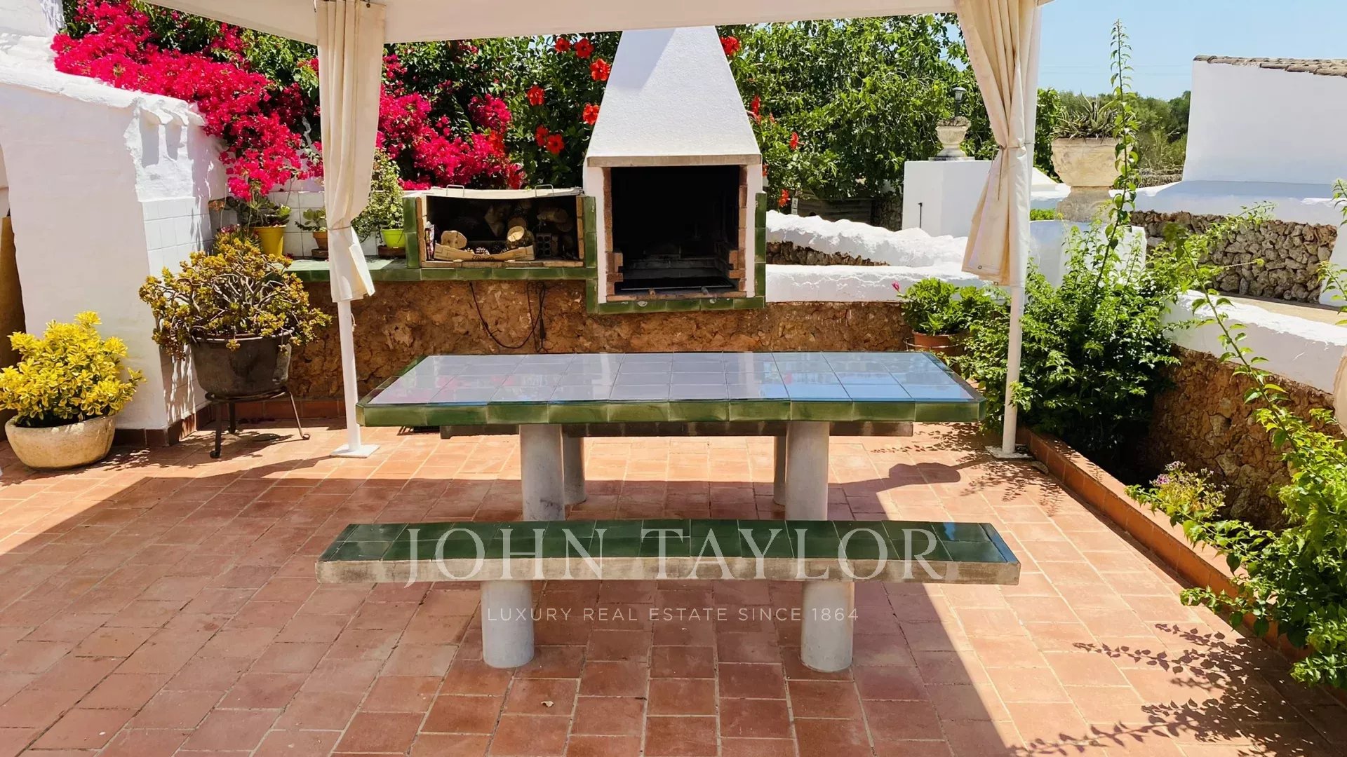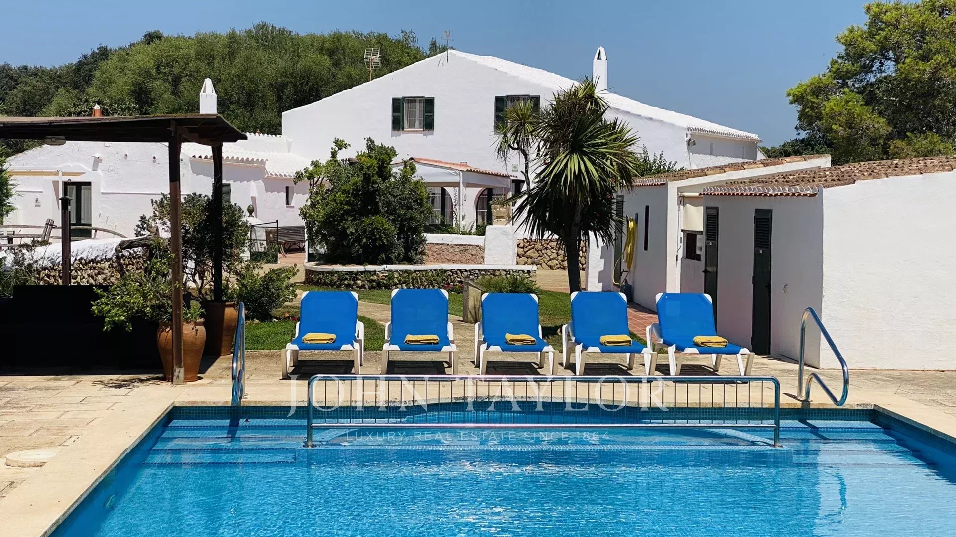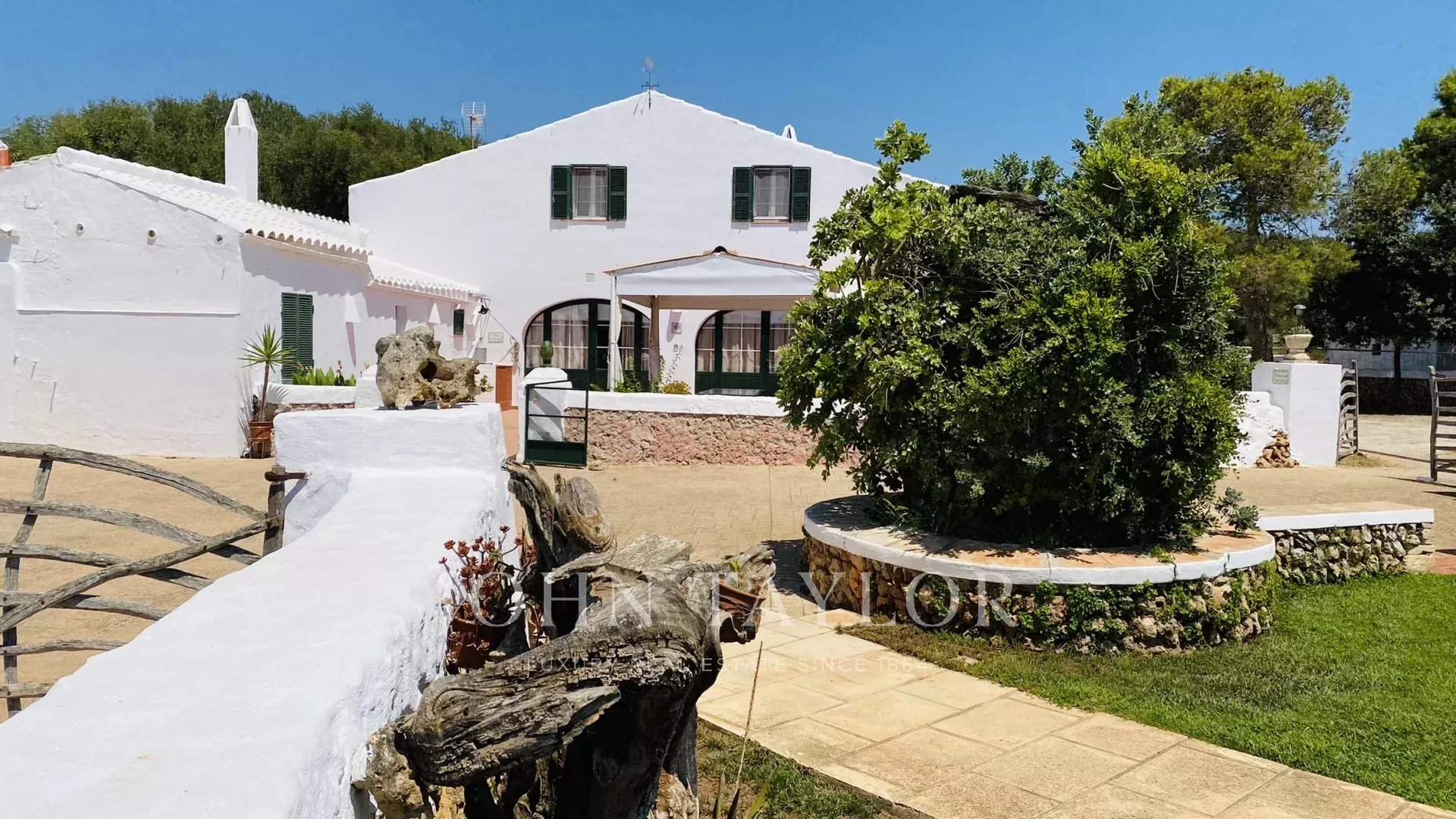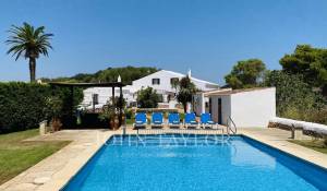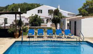 Although it dates from the 19th century, it has been completely refurbished, maintaining its original structure and typical Menorcan style. Next to the main facade there is a barbecue, with a table to eat in the shade. On the other hand, there is an area of natural shade (wild olive trees) next to the kitchen door, with a table and wooden benches. Here there are also children's games (swings and slide). The swimming pool (11m x 6m, and purification by electrolysis) has a special fenced area for children, it is surrounded by lawn and there is also a table with chairs under the pergola. There is also a toilet and shower in this area. There is also a paved area with a basketball hoop, paddle court and another covered area to shelter two cars.