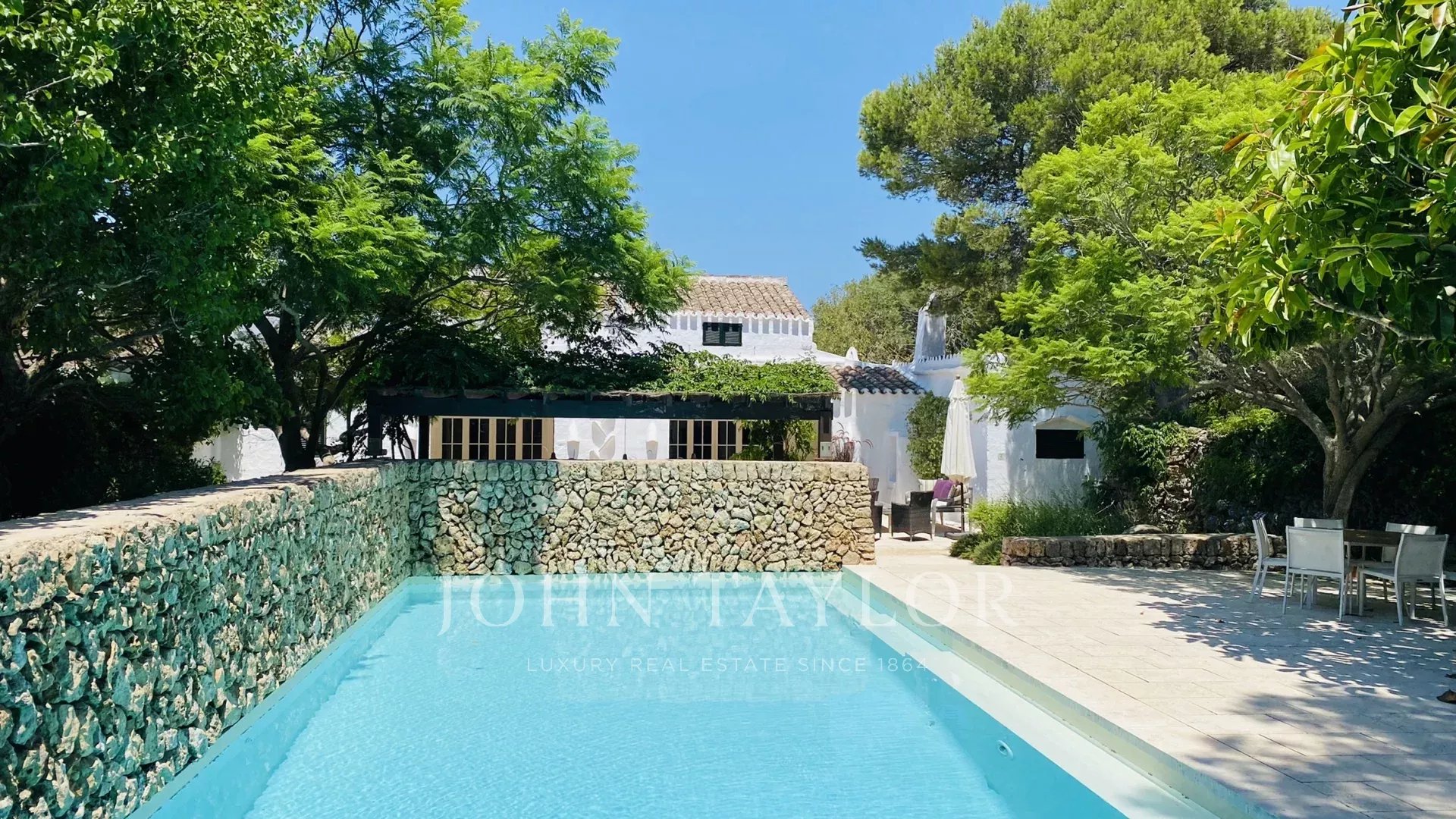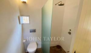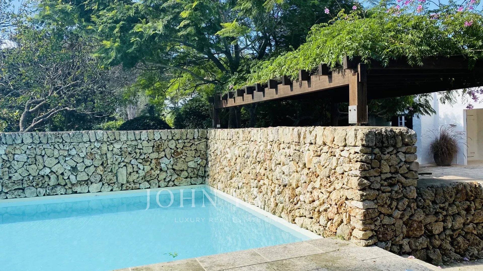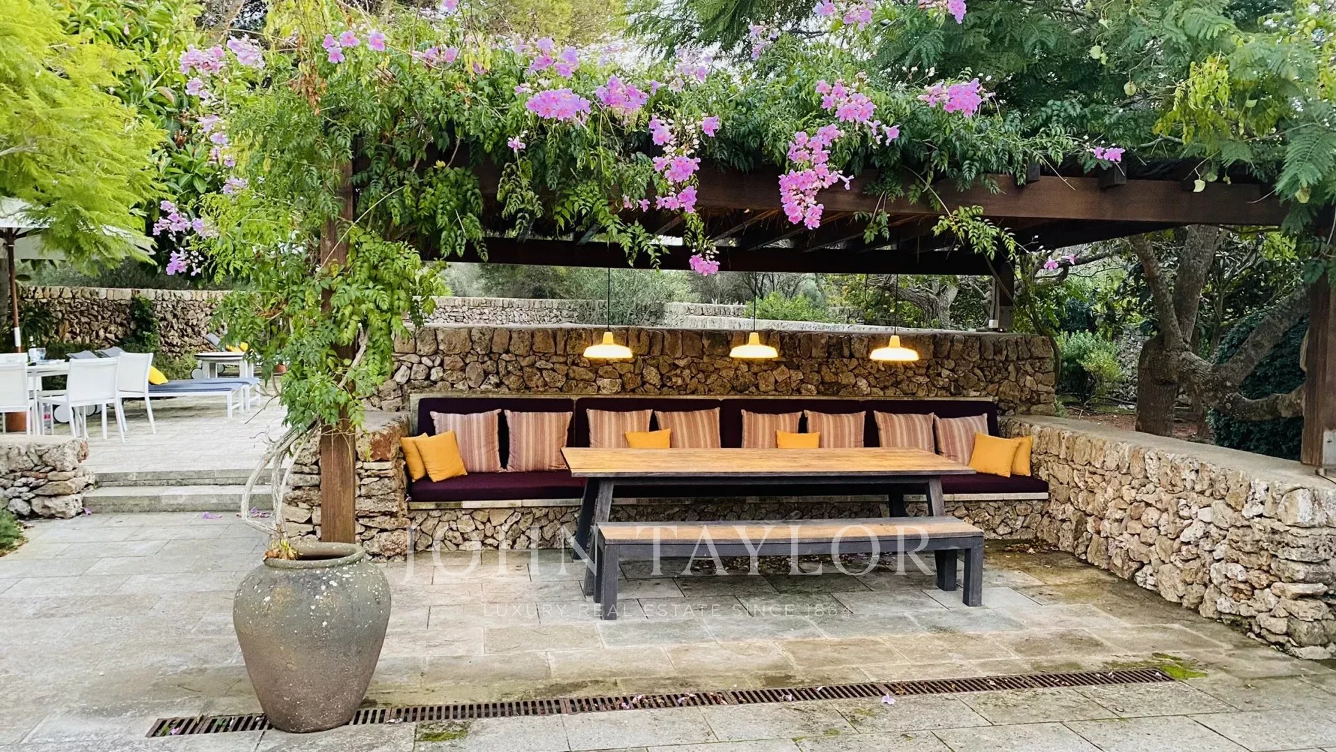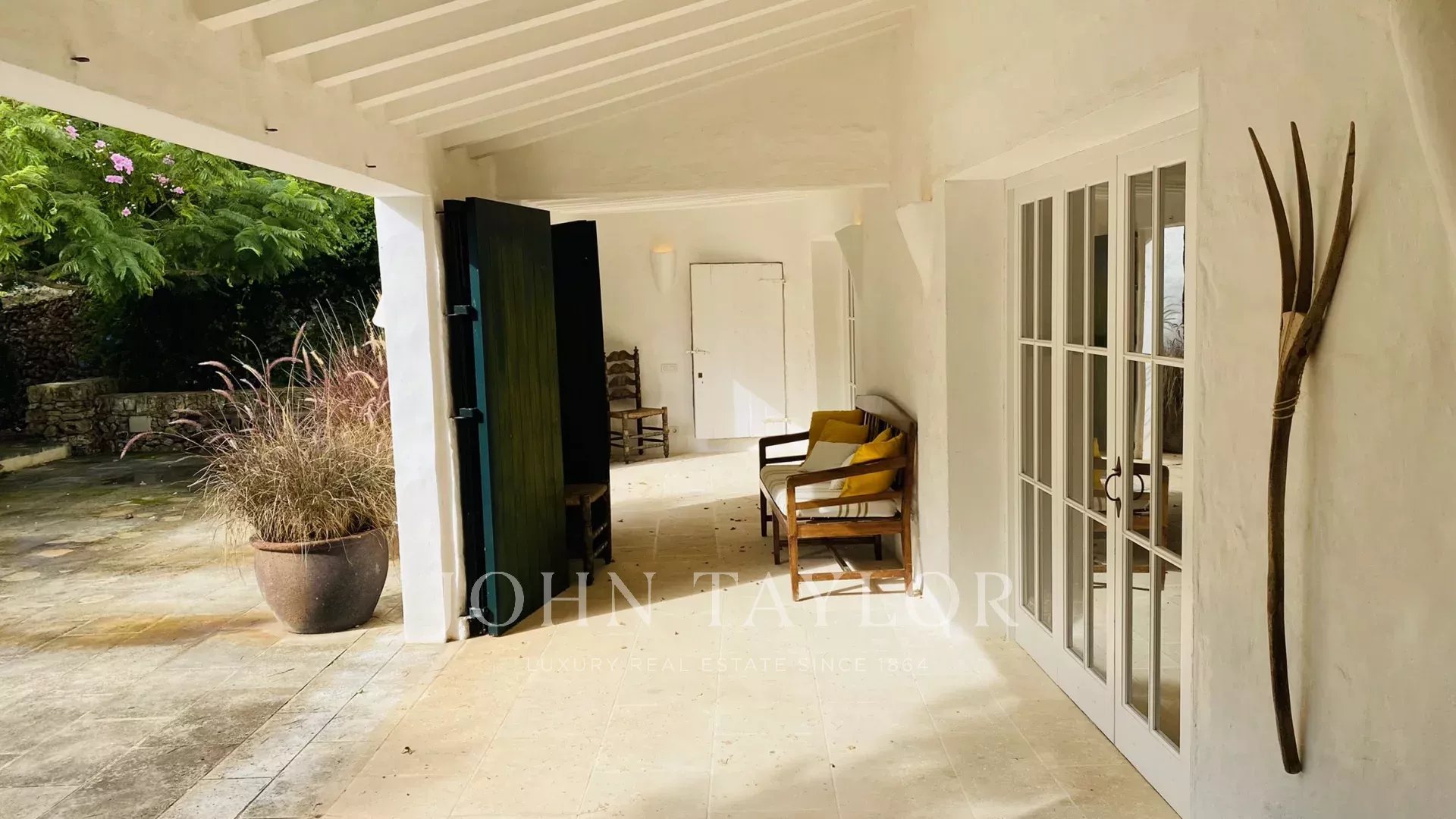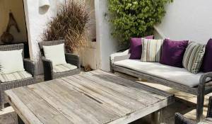 The property has two terraces, one next to the pool and the other in front of the house. The swimming pool, of design, has Roman stairs on one side, and is surrounded by a dry wall on the other. The terrace in front of the house has a pergola with a table and two benches for outdoor dining. The entrance hall of the house can be converted into a covered porch by opening the large glass doors.