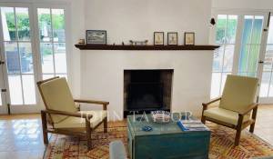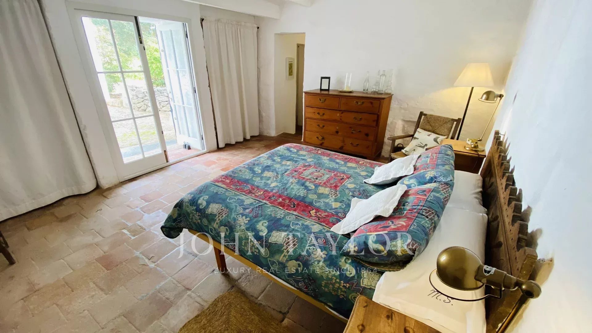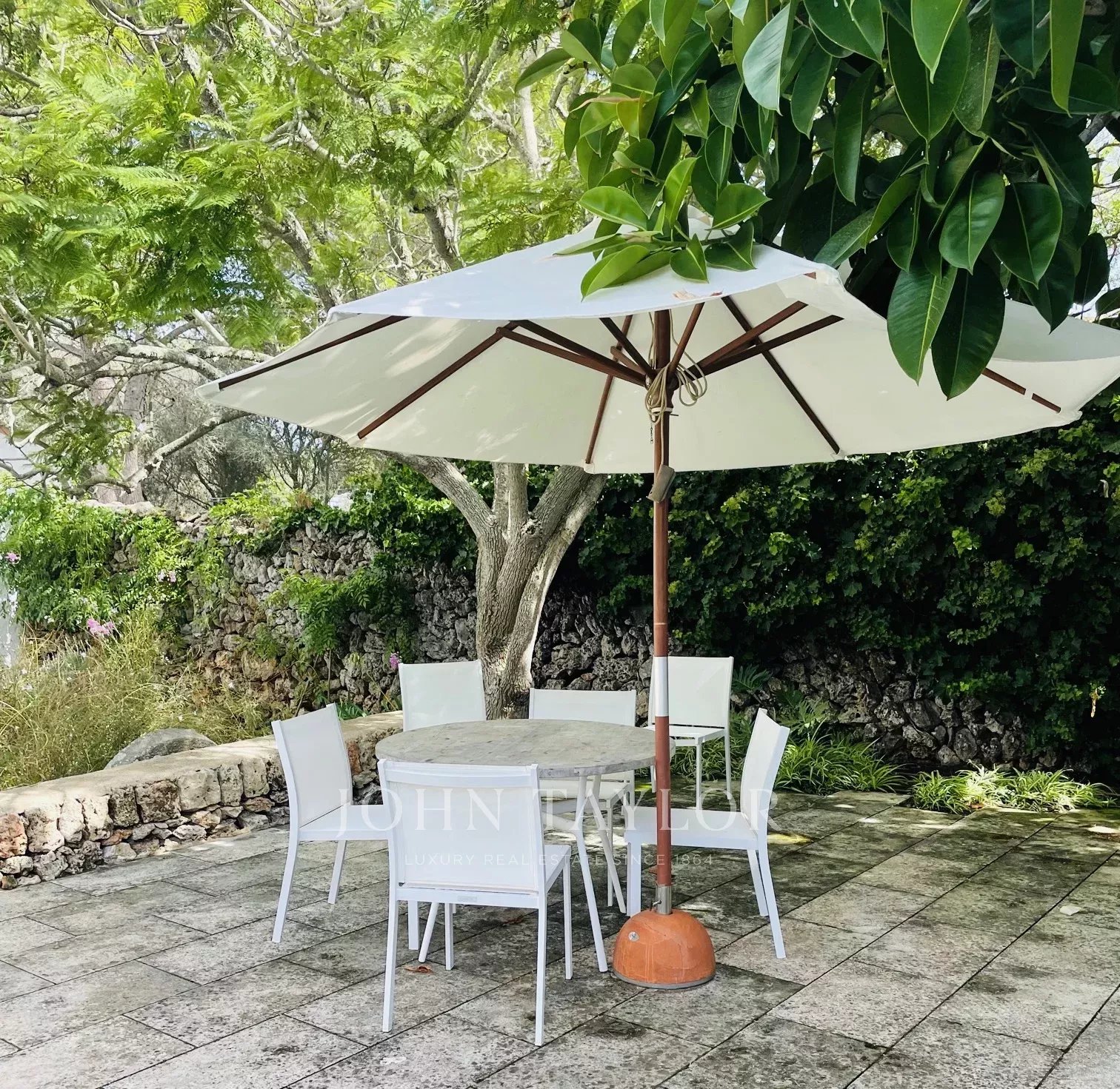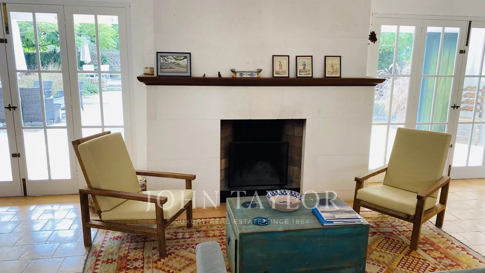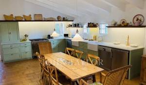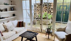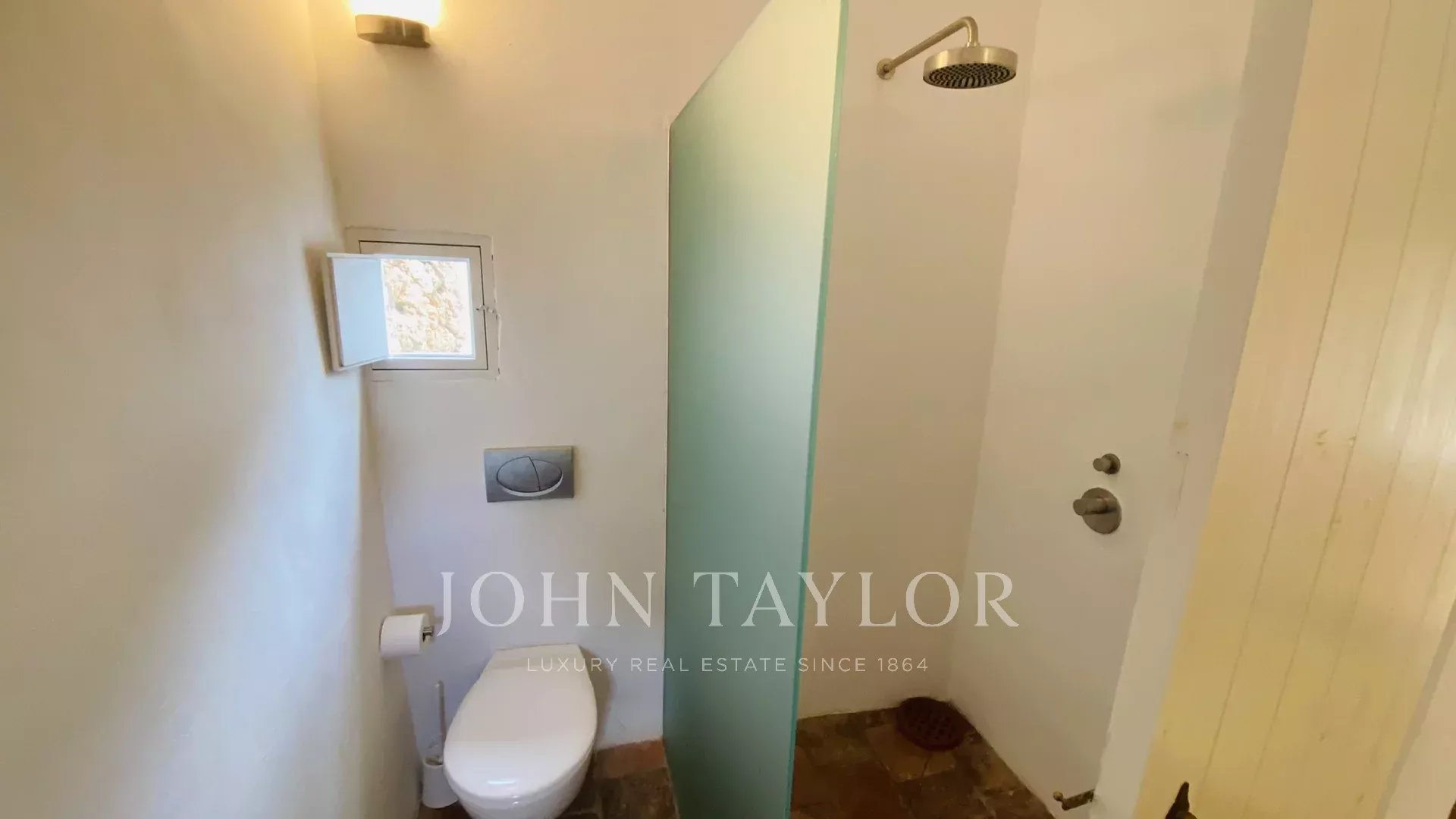 The property has two terraces, one next to the pool and the other in front of the house. The swimming pool, of design, has Roman stairs on one side, and is surrounded by a dry wall on the other. The terrace in front of the house has a pergola with a table and two benches for outdoor dining. The entrance hall of the house can be converted into a covered porch by opening the large glass doors.