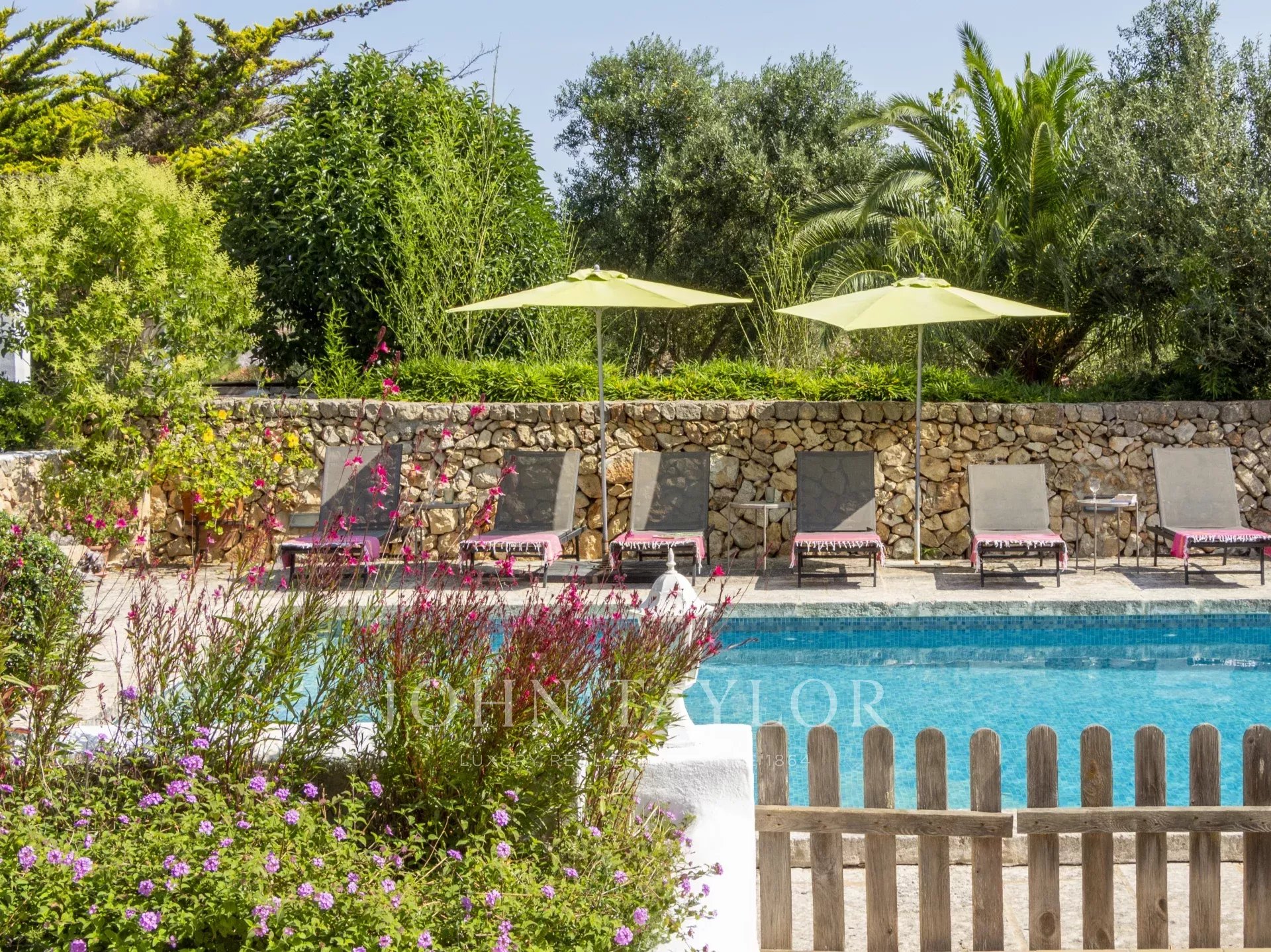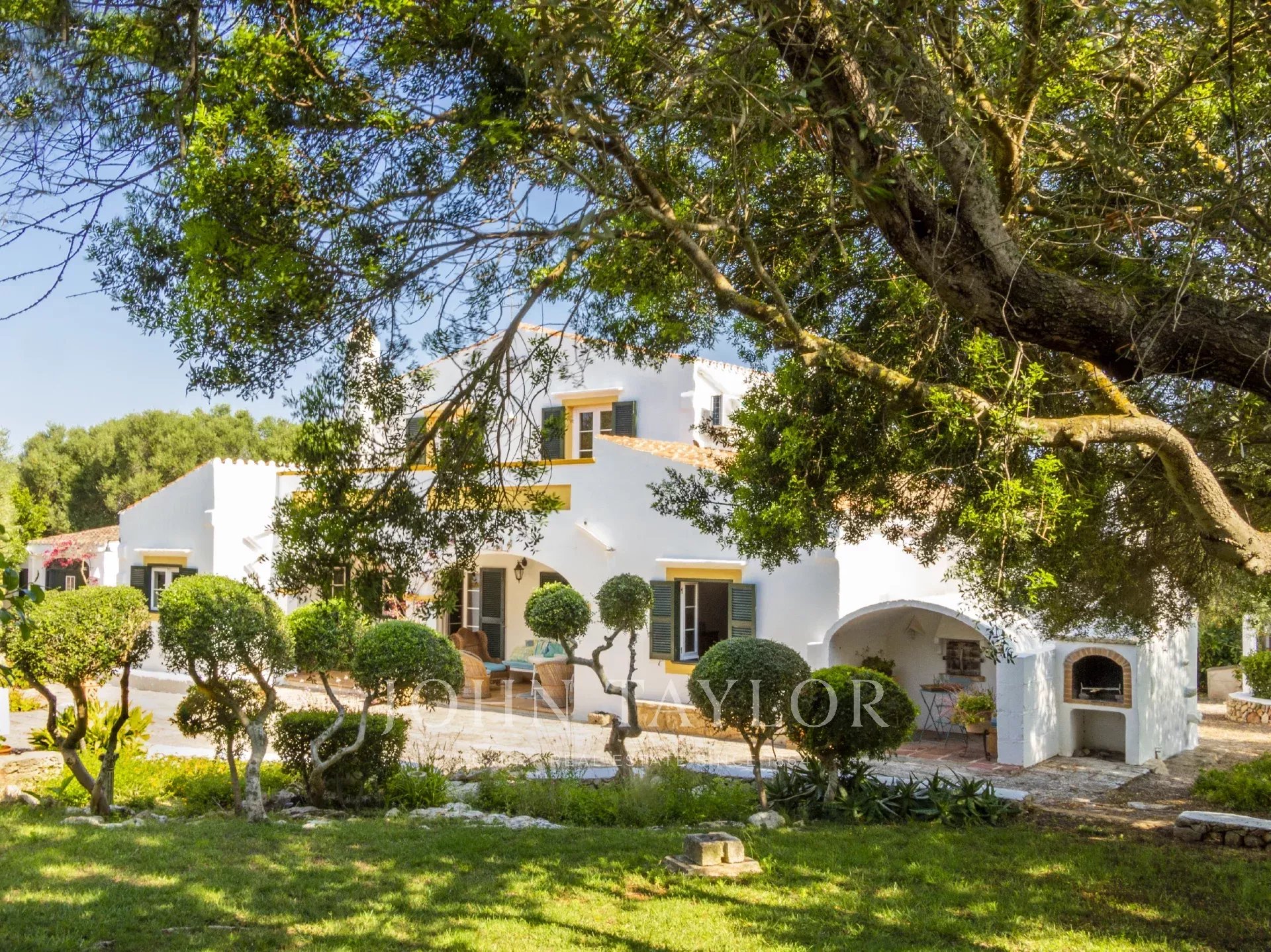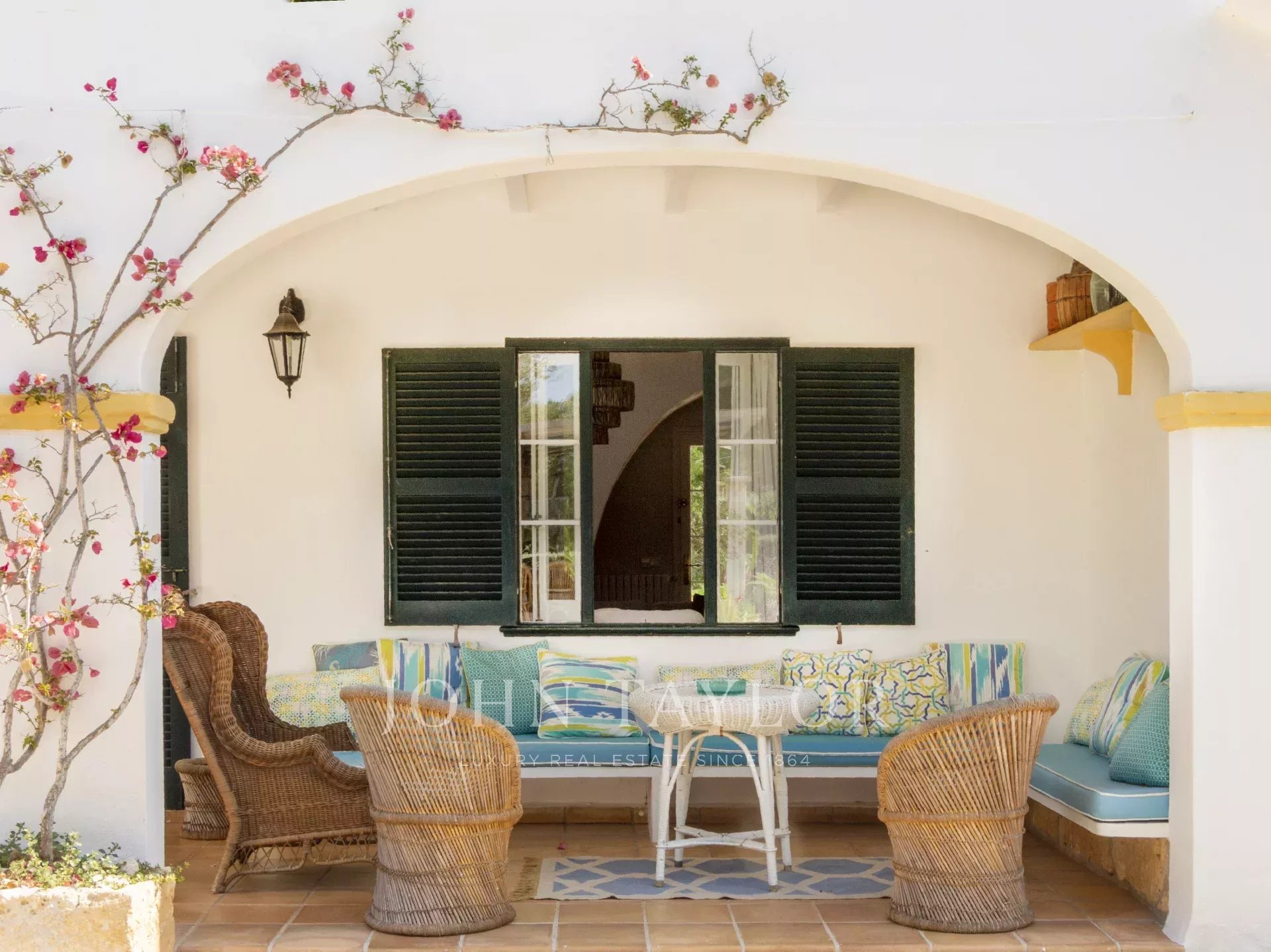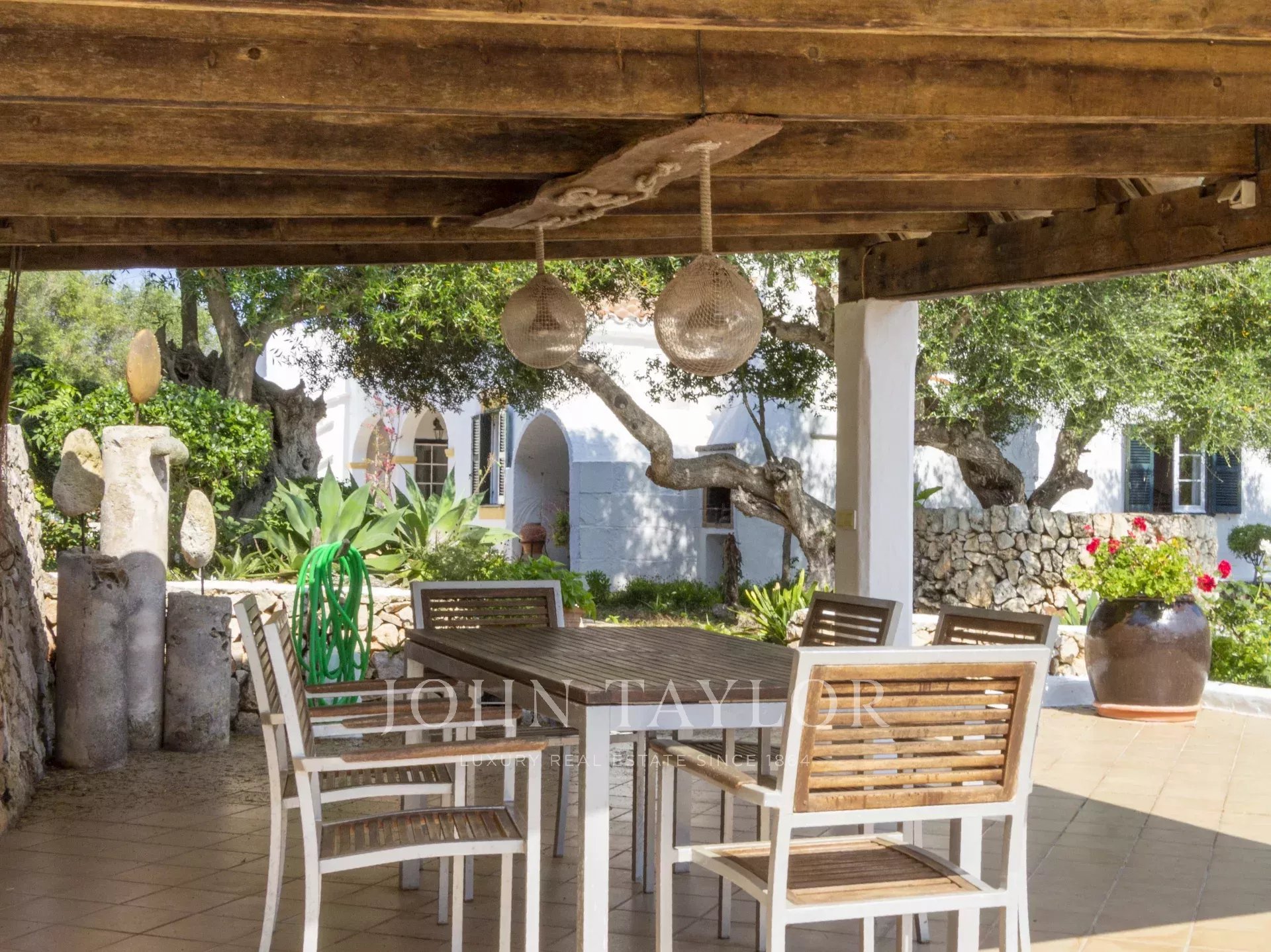Exterior: The property covers approximately 11,000 square meters. The pool is located on the east side of the house and measures 10 x 5 meters. Near the pool, there is a covered area for outdoor dining. The porch of the house features typical Menorcan built-in sofas. The grounds have large grassy areas, olive trees, and several very quiet areas where one can relax in the shade.