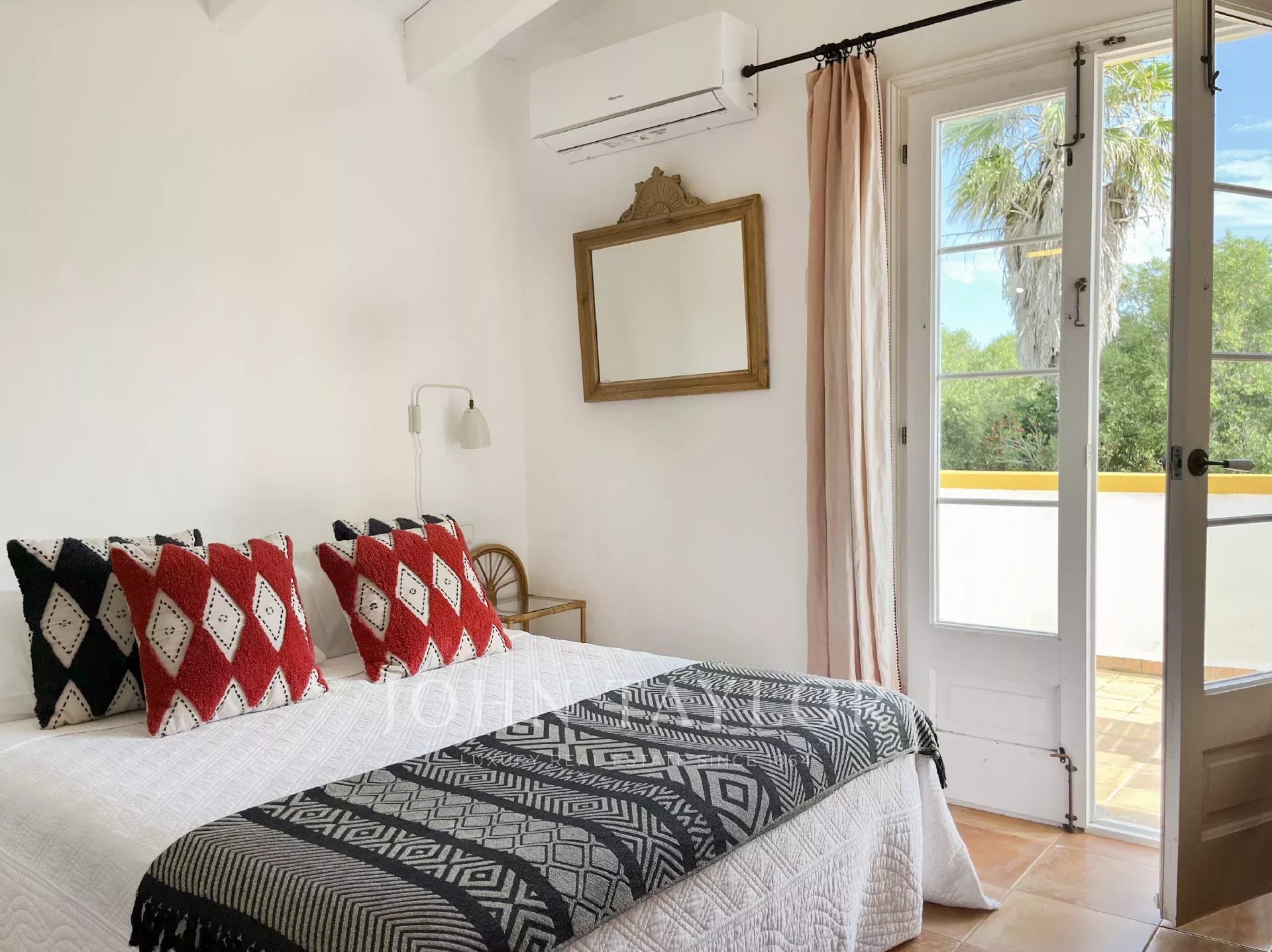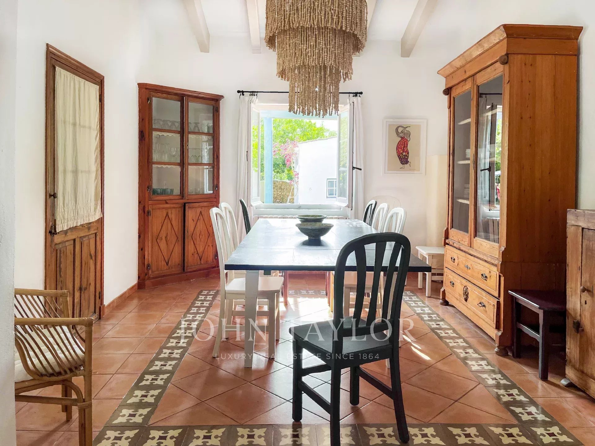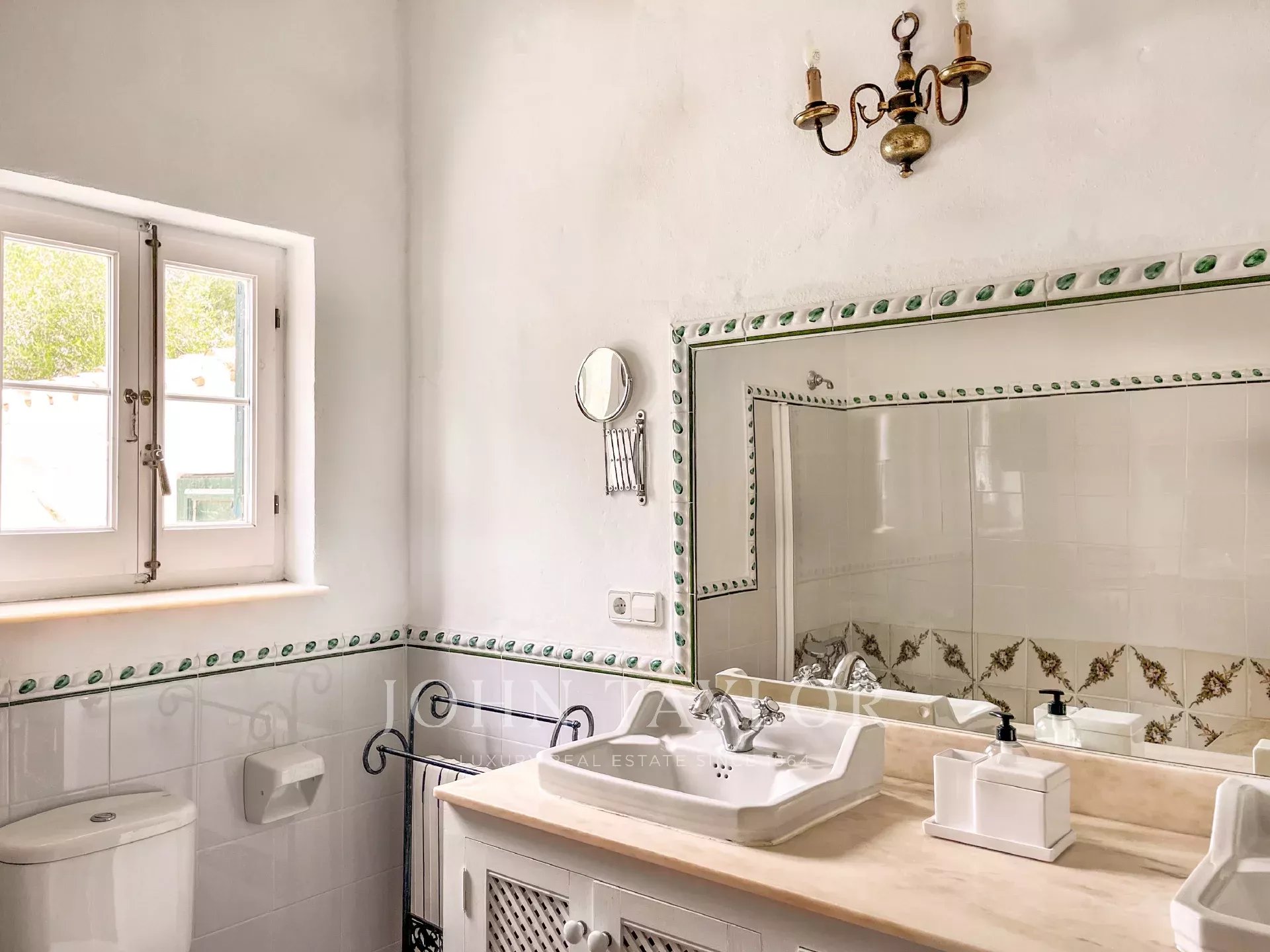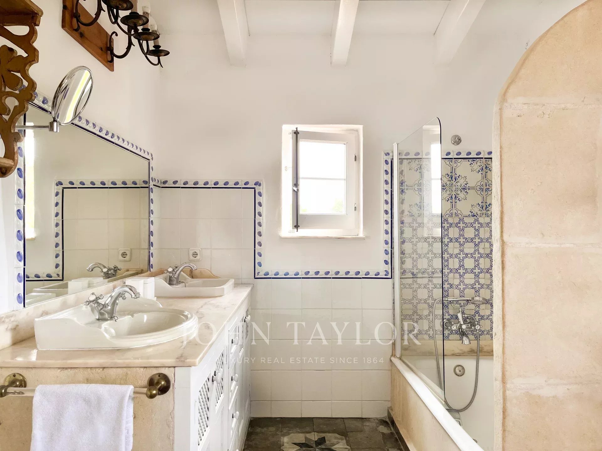 Exterior: The property covers approximately 11,000 square meters. The pool is located on the east side of the house and measures 10 x 5 meters. Near the pool, there is a covered area for outdoor dining. The porch of the house features typical Menorcan built-in sofas. The grounds have large grassy areas, olive trees, and several very quiet areas where one can relax in the shade.