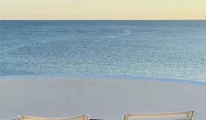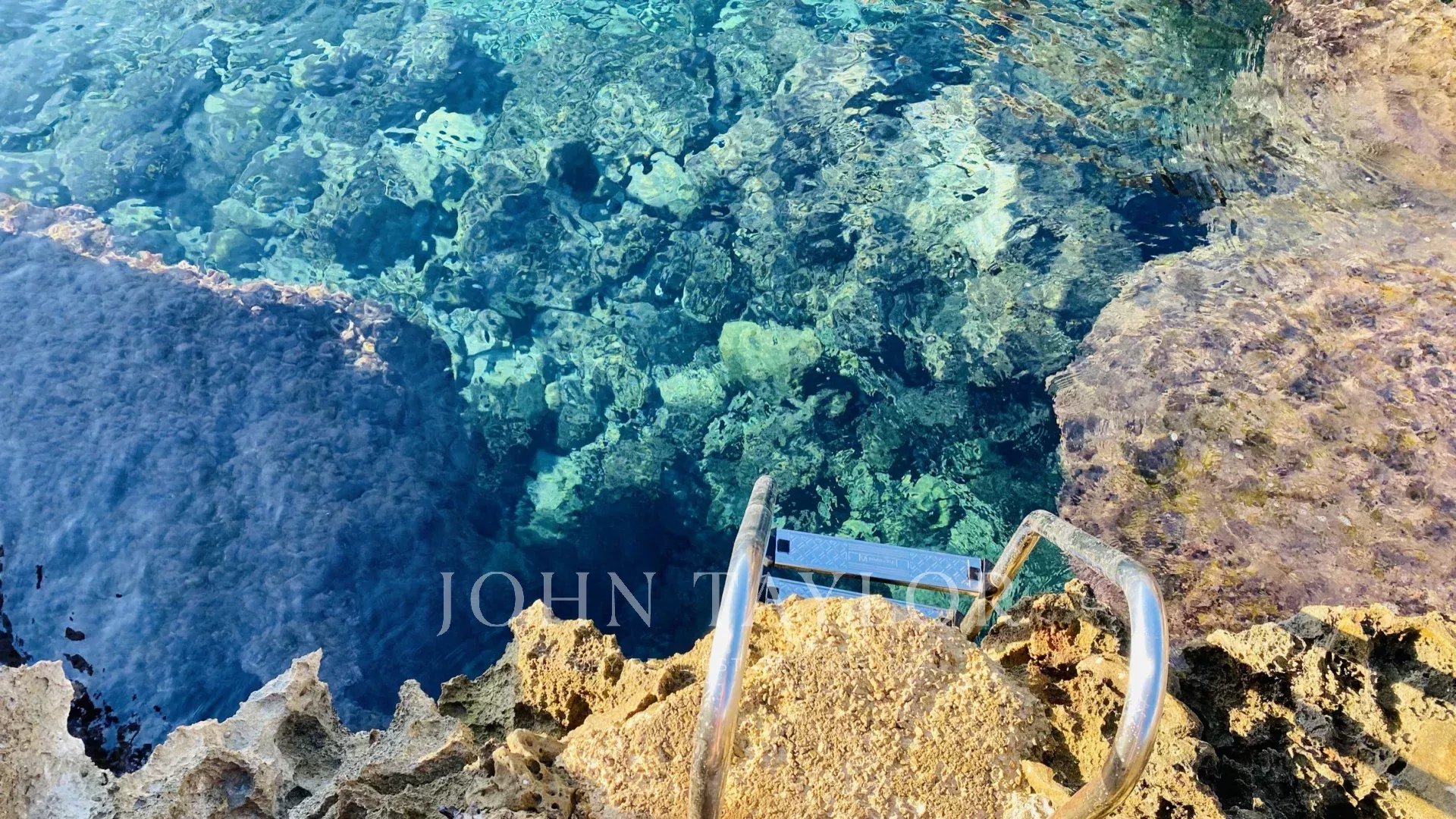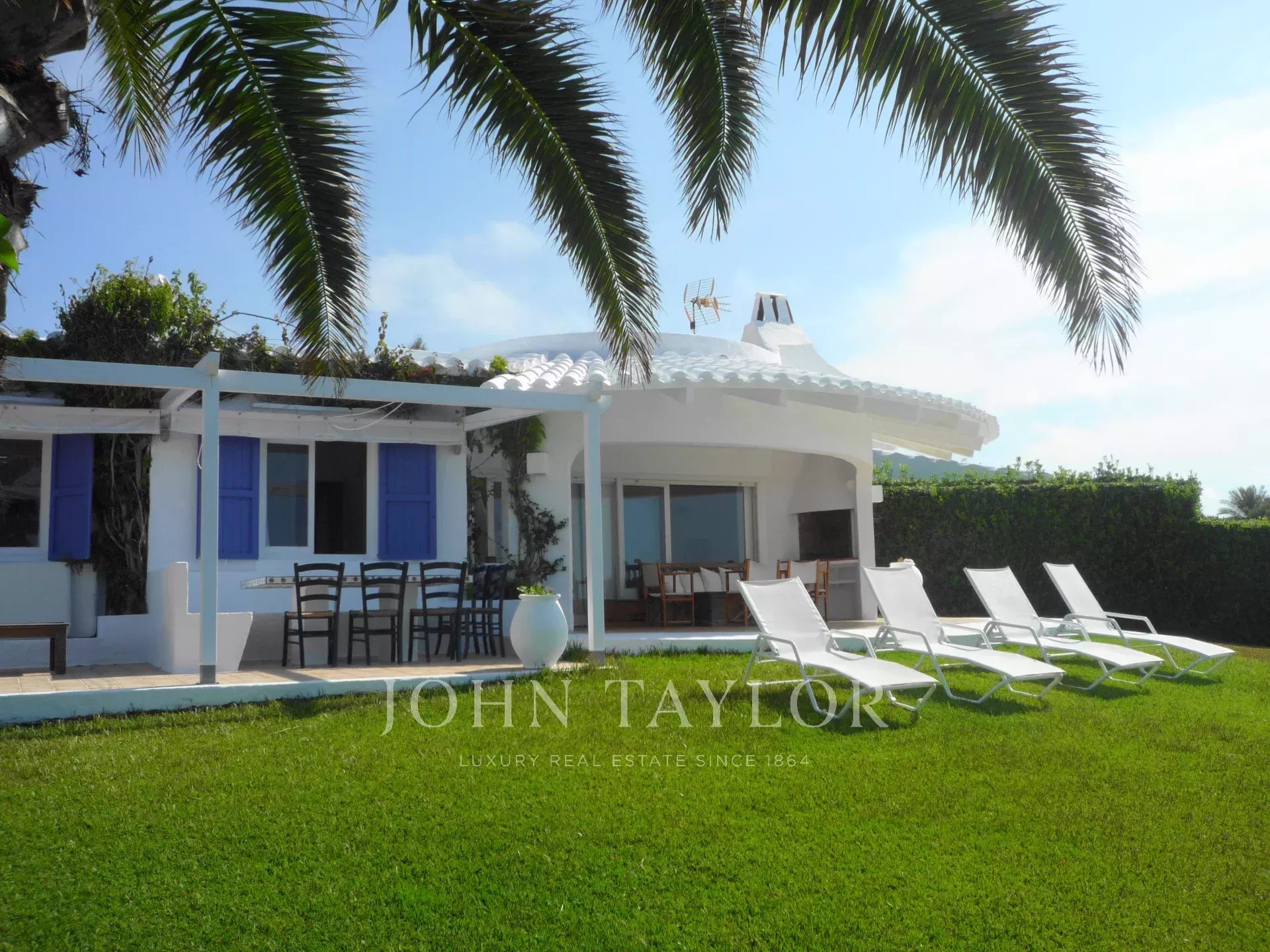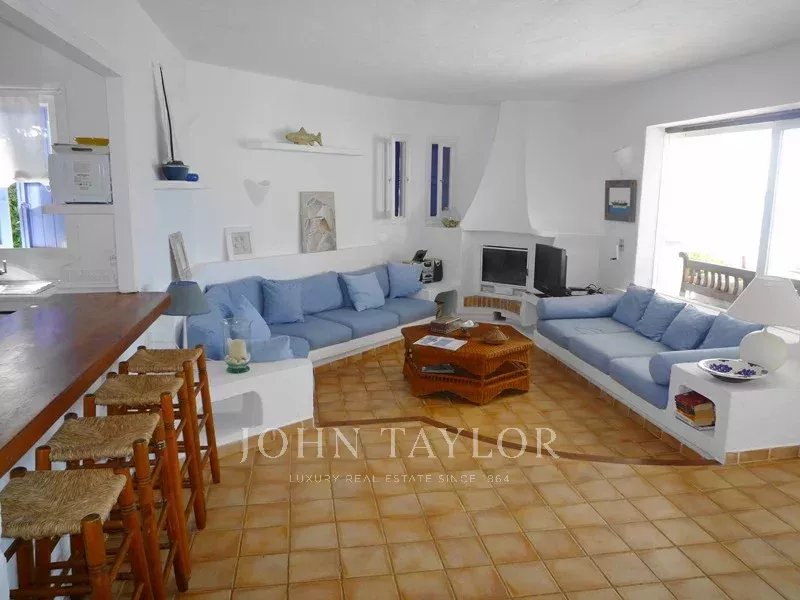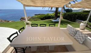 The garden has grass up to the rocks leading to the sea, where it is possible to access the crystal-clear waters via stairs. There are two large covered terraces with a sofa, chairs, and a table for dining or relaxing. From them, you can enjoy wonderful views of the open sea.