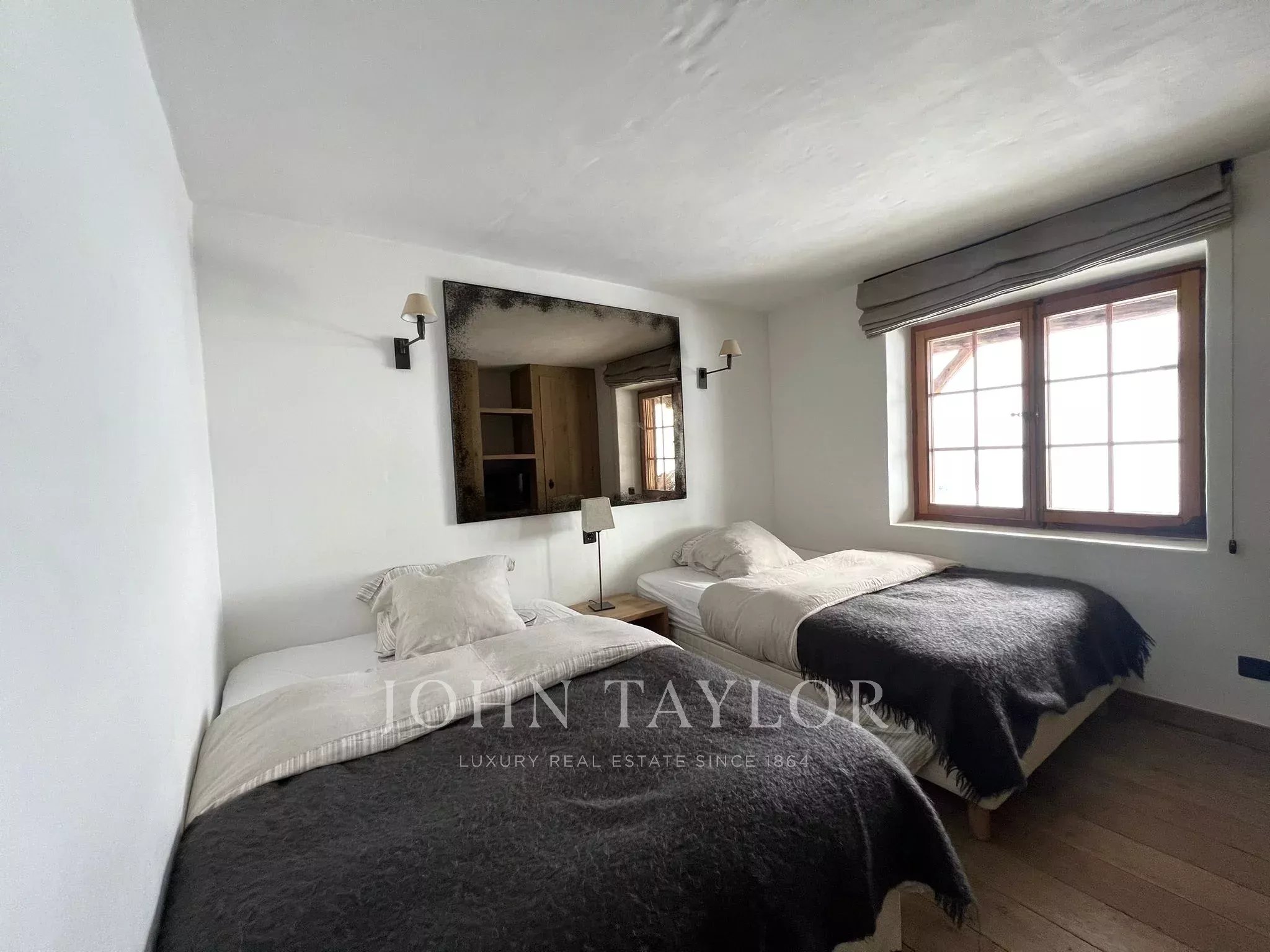 Inside, the property offers bright and comfortable living spaces, with large windows that frame the spectacular mountain scenery. The bedrooms are peaceful and welcoming, designed with natural materials and soft tones to create a relaxing retreat after a day on the slopes. The chalet also includes well-appointed bathrooms and a fully equipped kitchen with a charming rustic style.