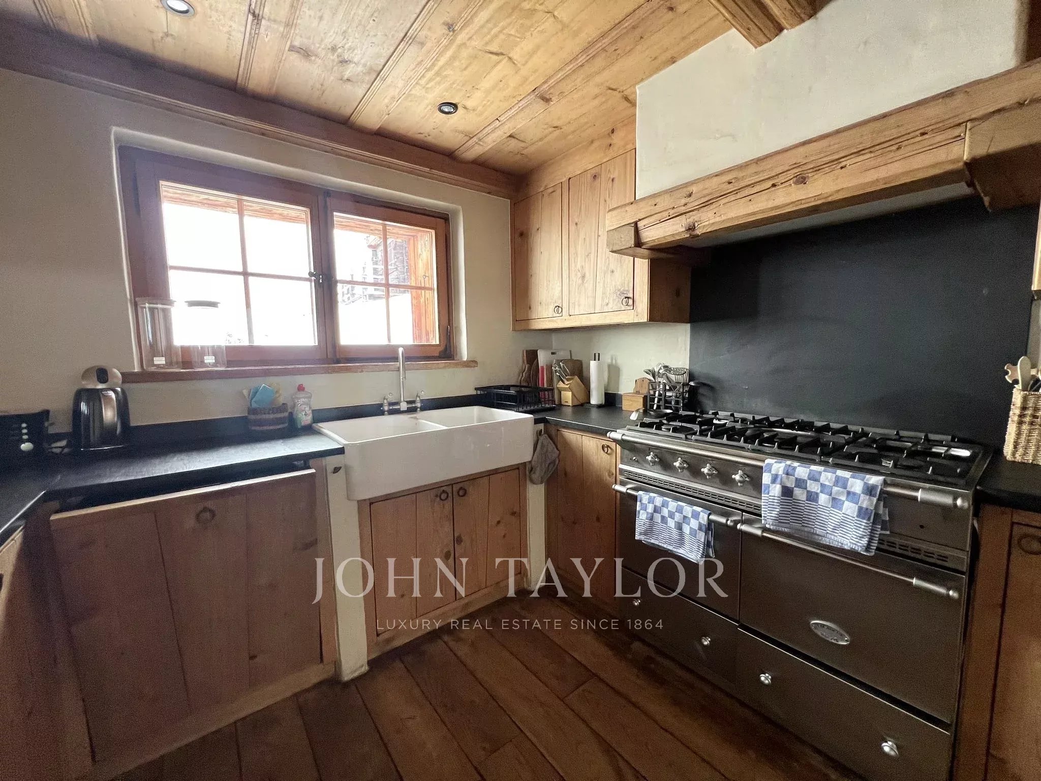 The chalet features beautiful aged wood throughout, creating a cosy and elegant atmosphere. The spacious wooden balcony, overlooking the snow-covered landscape, is the perfect place to enjoy quiet mornings, sunny winter afternoons, or unforgettable sunsets above the valley.