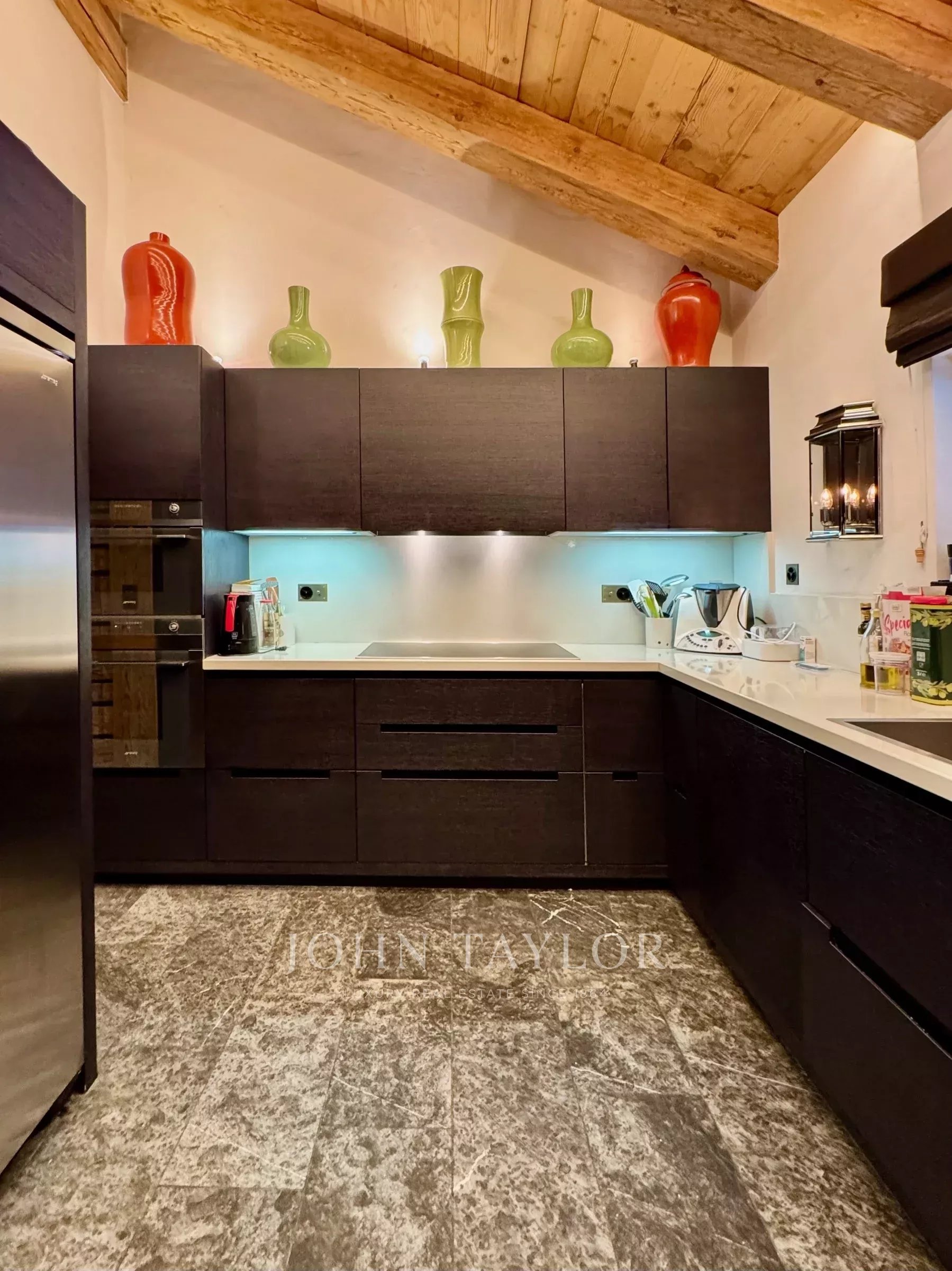 The fully equipped modern kitchen features sleek dark cabinetry, high-quality appliances, and a clean, minimalist design, making it both functional and stylish. It opens naturally into the living space, perfect for hosting and social moments.