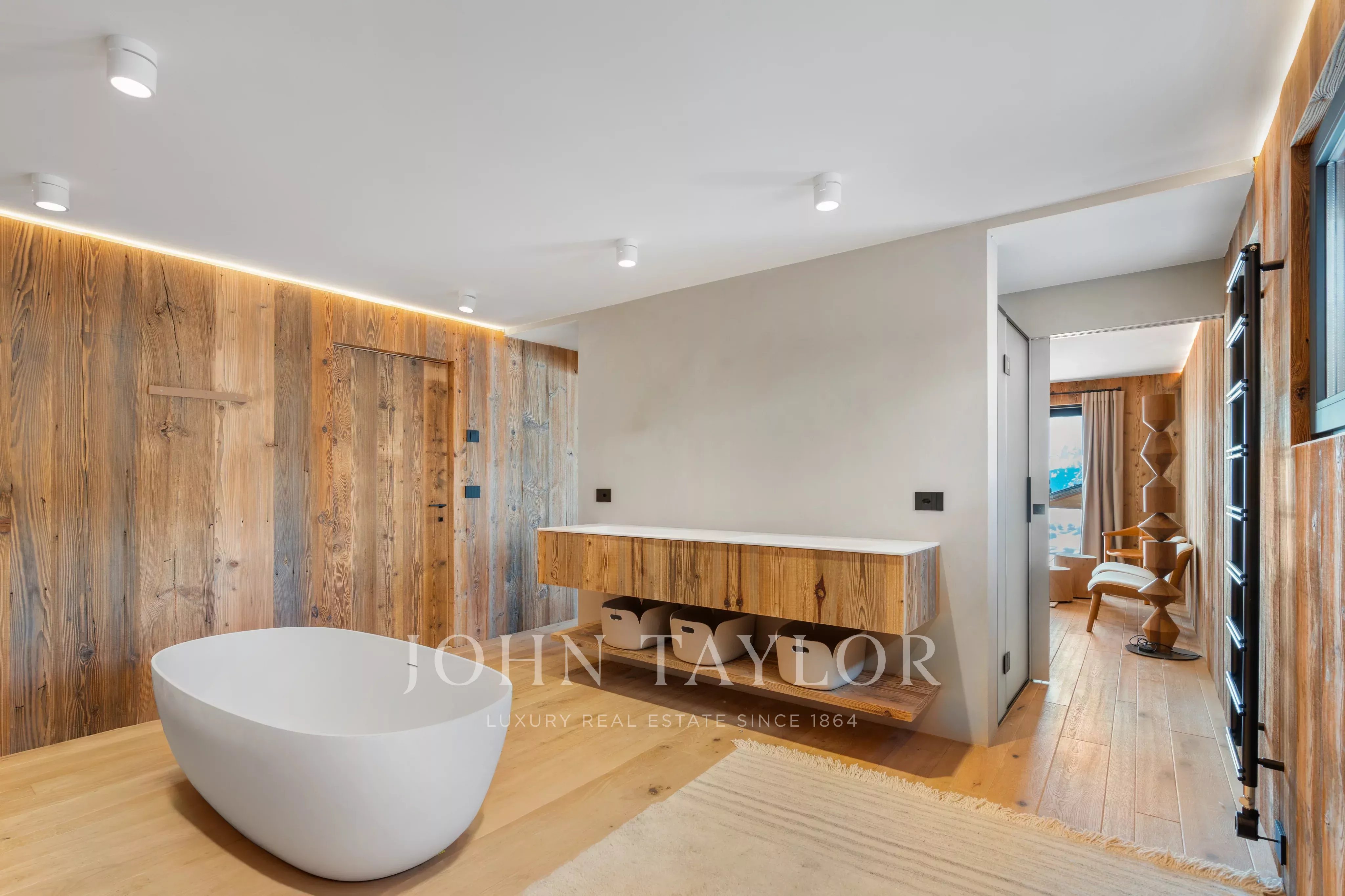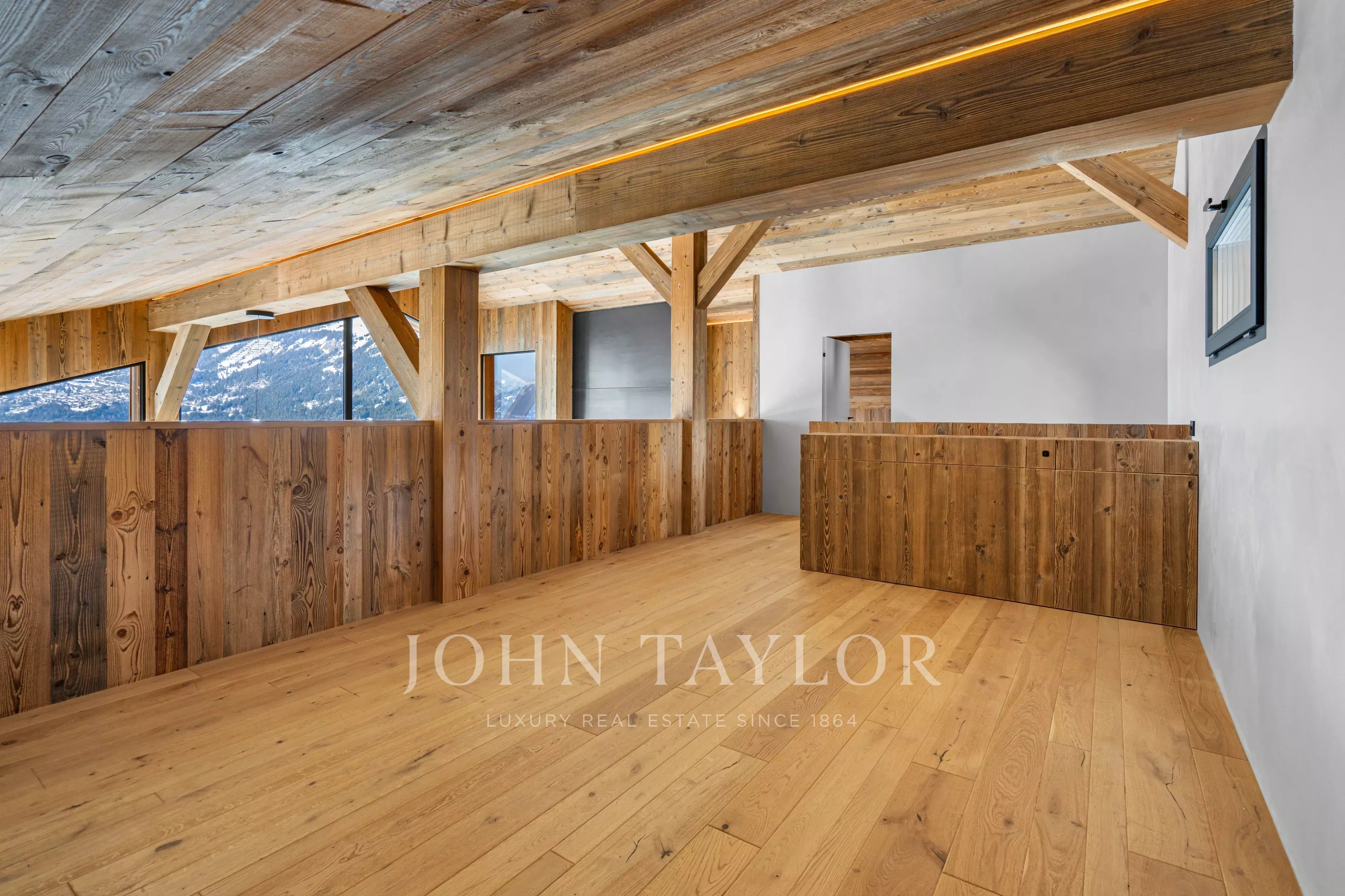 The reception area, bathed in natural light, opens onto a breathtaking panoramic view of the surrounding Alps. Noble materials, meticulous finishes and attention to detail create a warm, refined atmosphere.