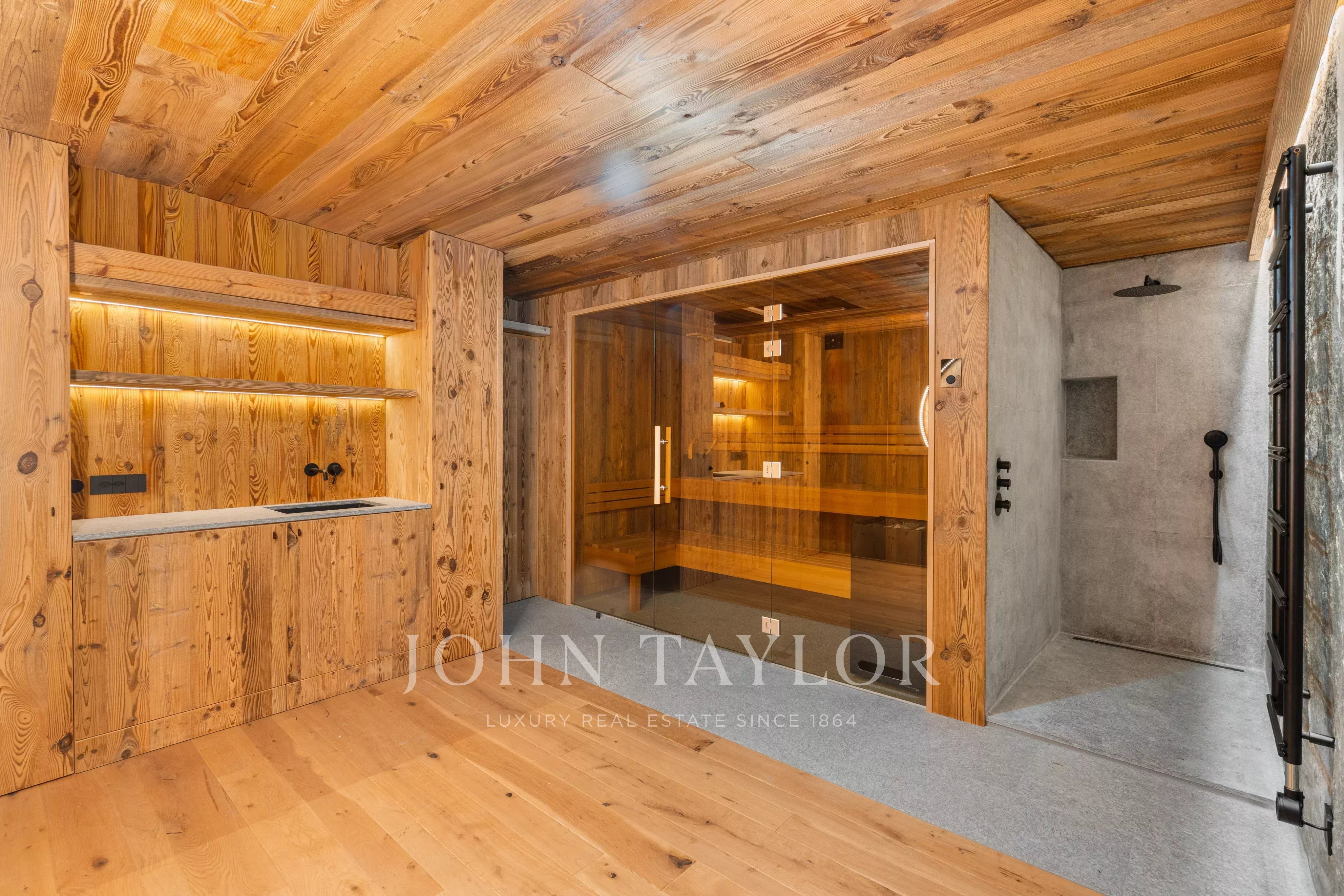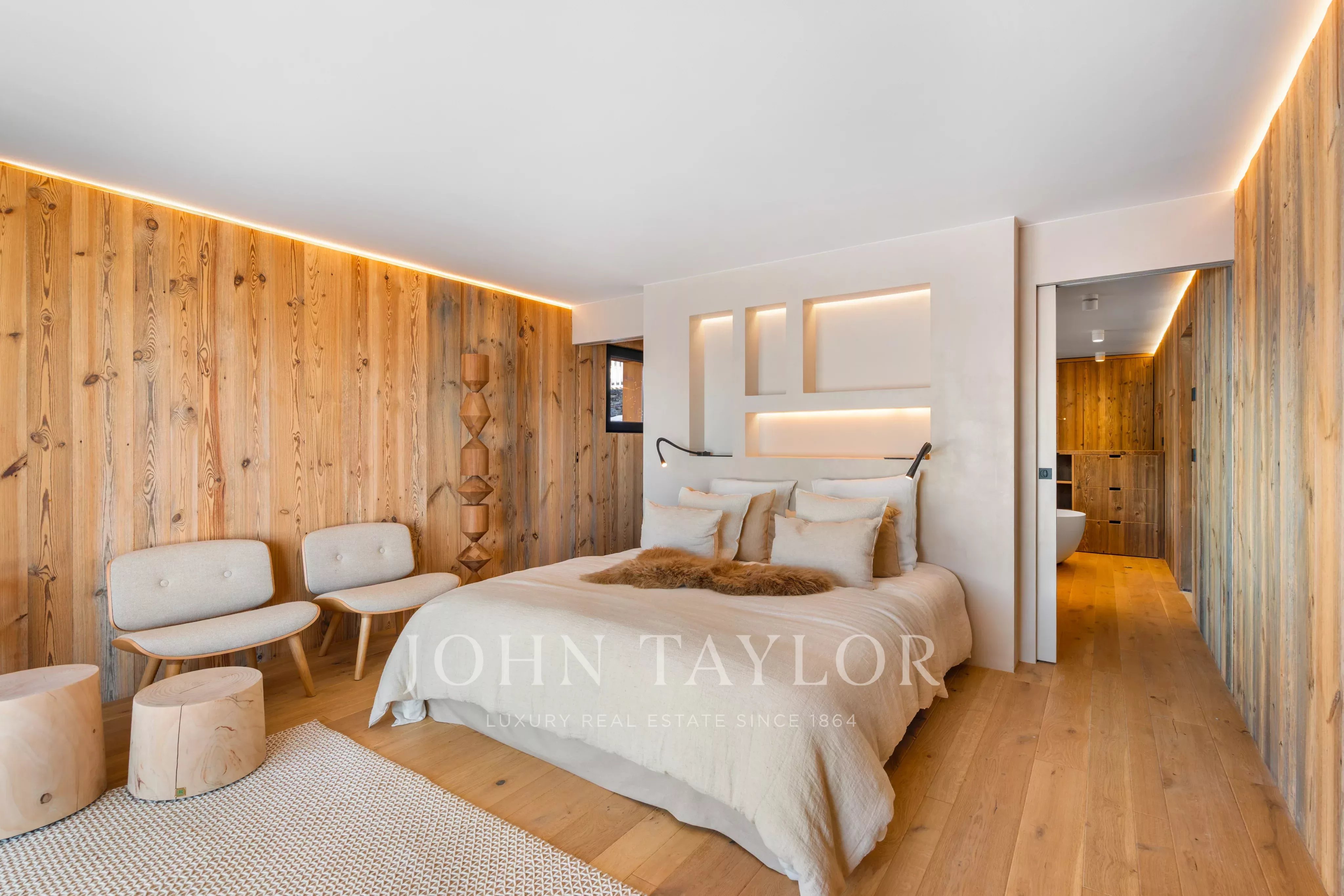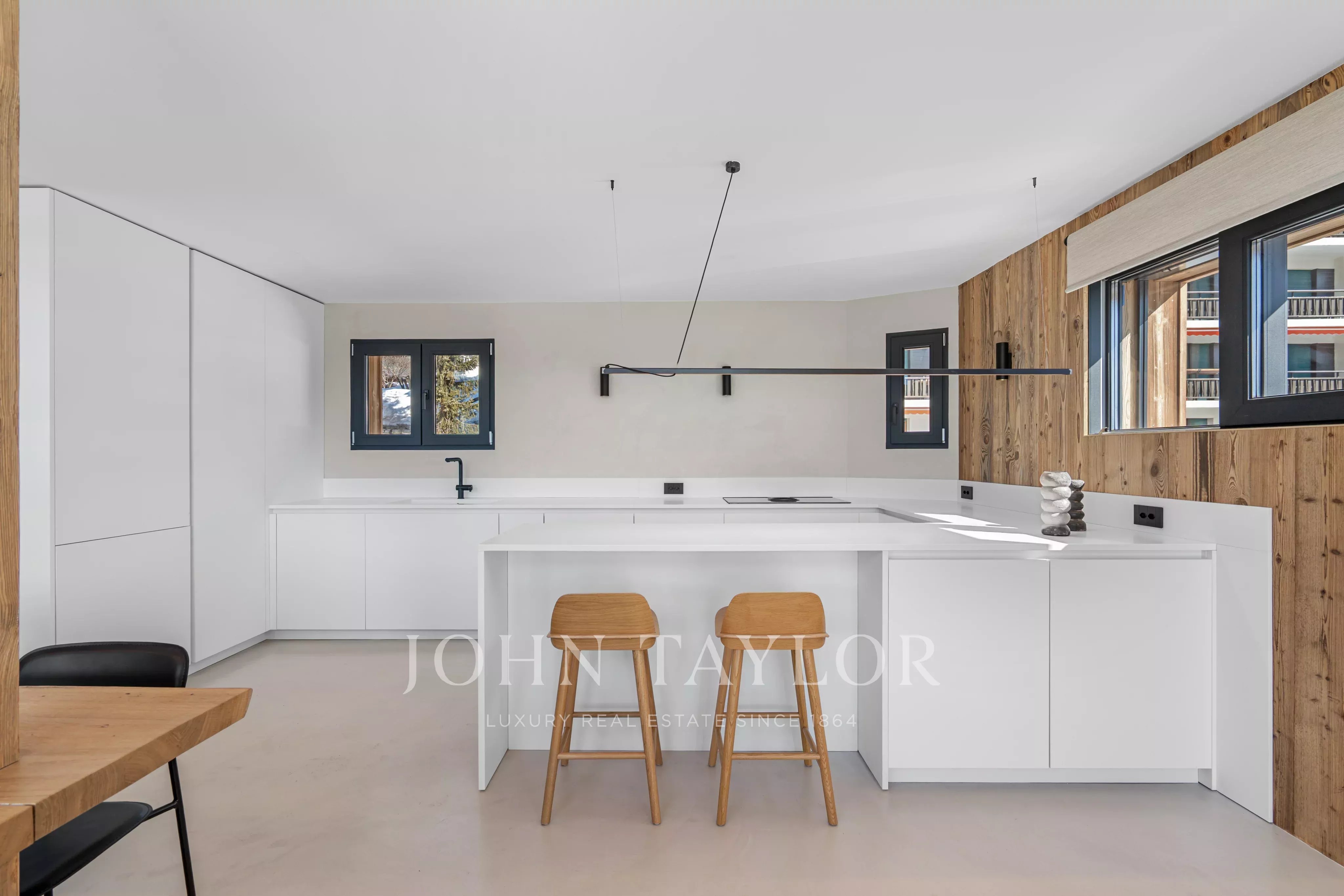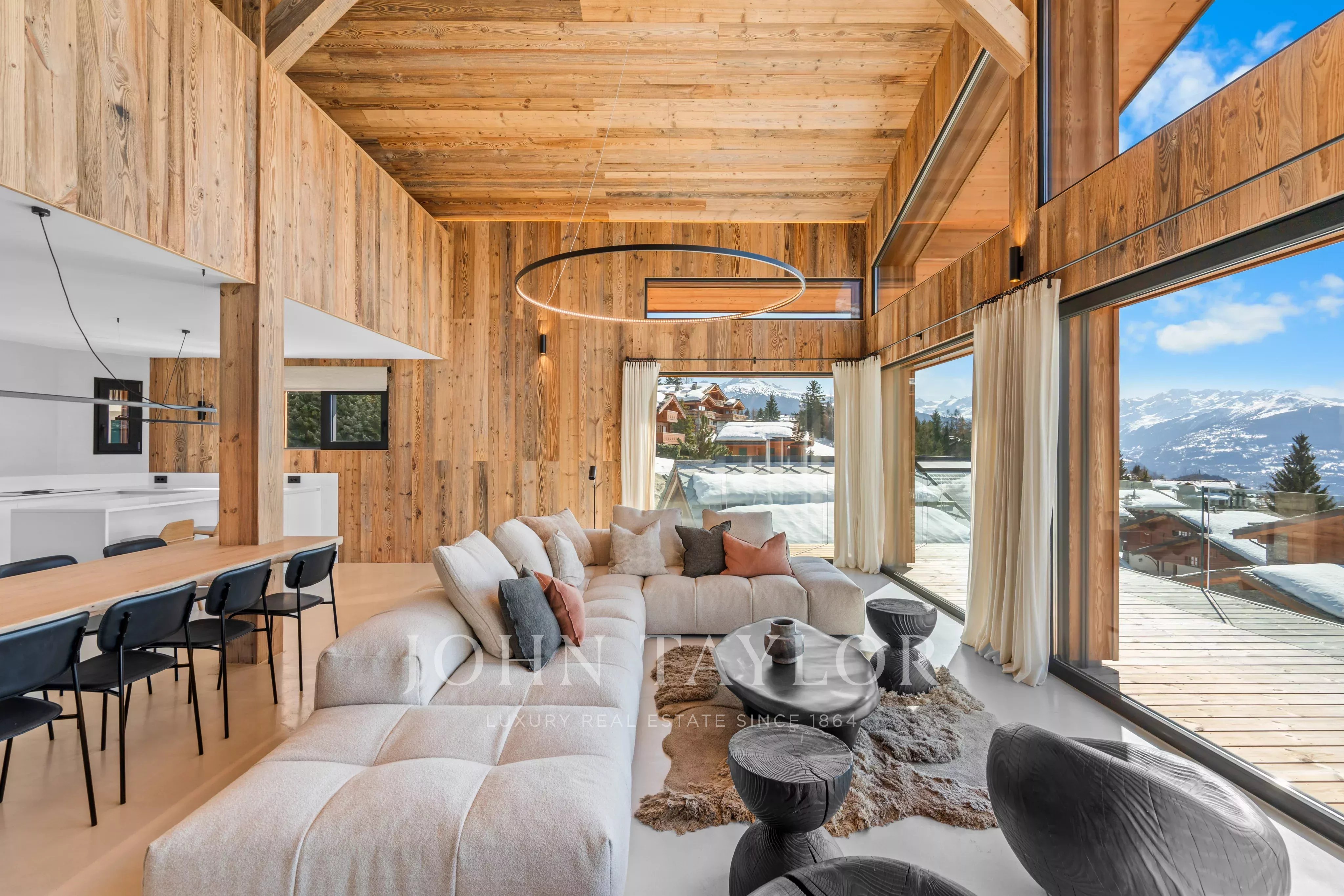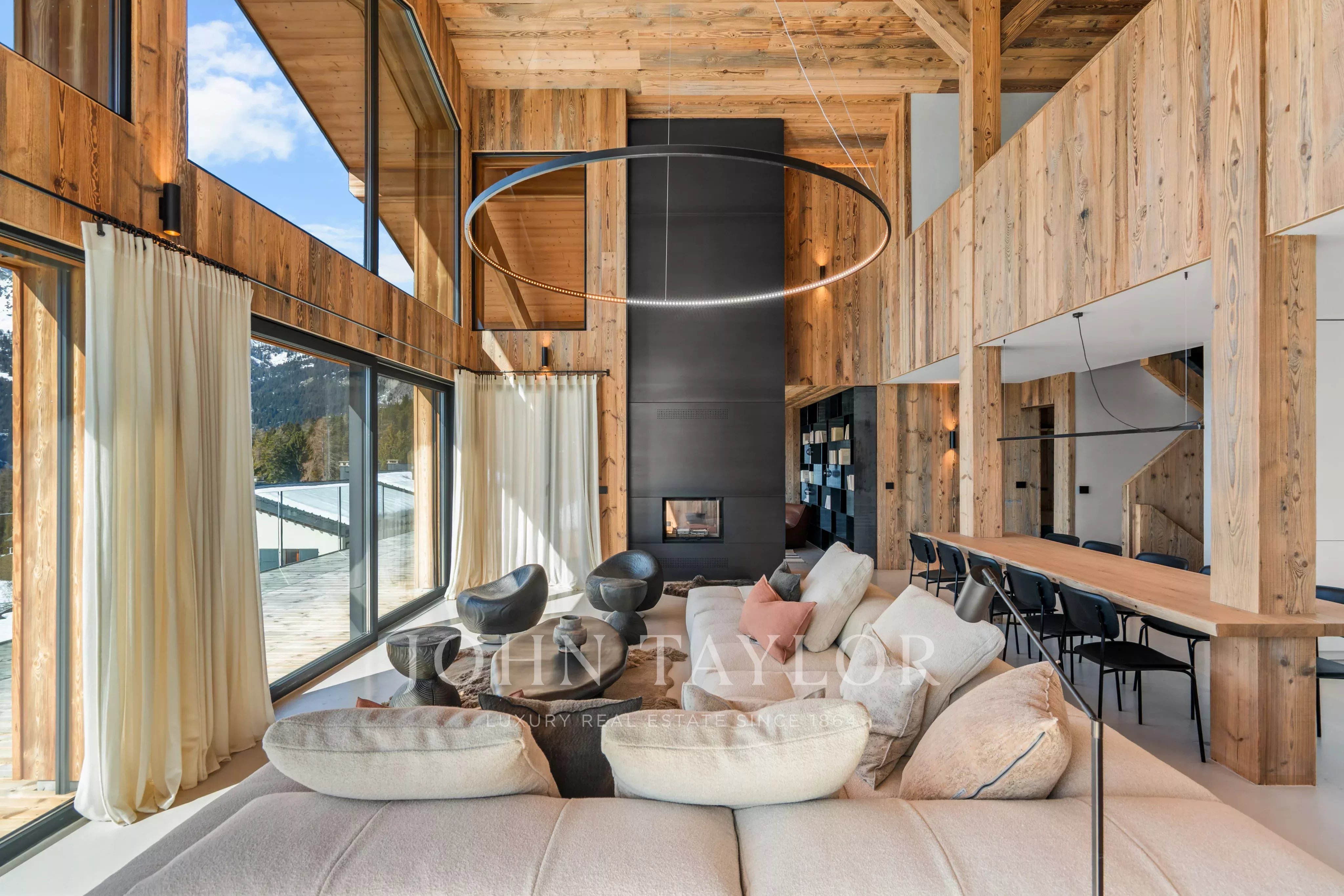 Spread over three levels, the chalet is remarkably bright thanks to its large bay windows and high ceilings, which give the living spaces a feeling of openness and elegance rare in the mountains.