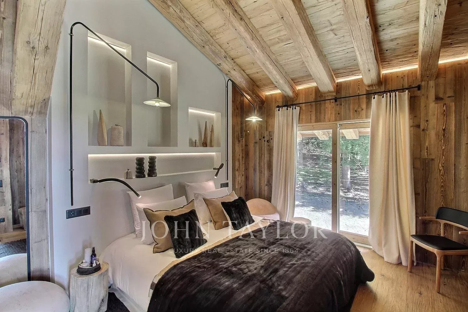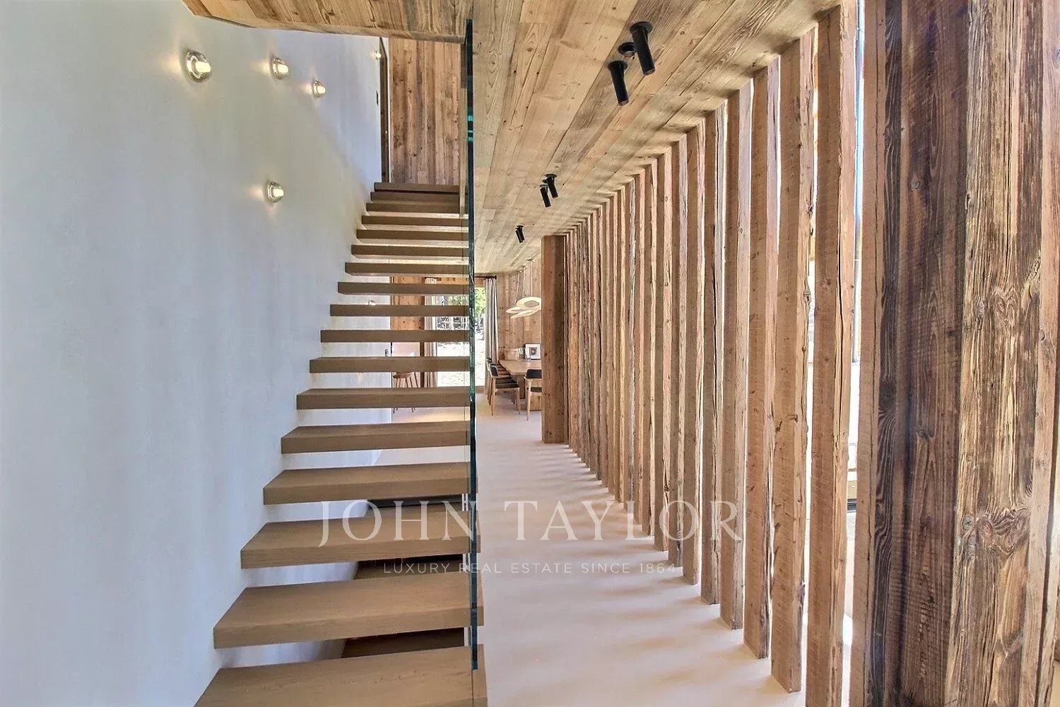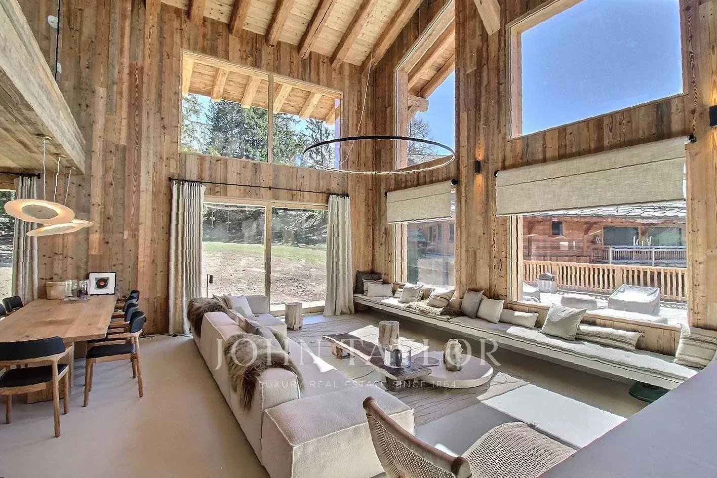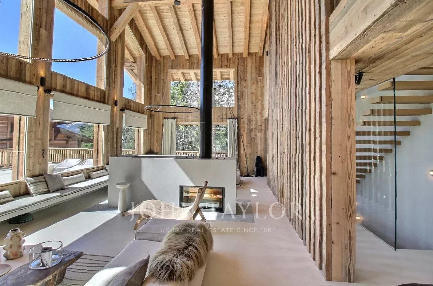 The chalet offers a warm, contemporary atmosphere in a modernized Alpine style: spacious living room with high ceilings, large south-west-facing windows, exposed solid wood framework and a double-sided fireplace integrated into the living room.