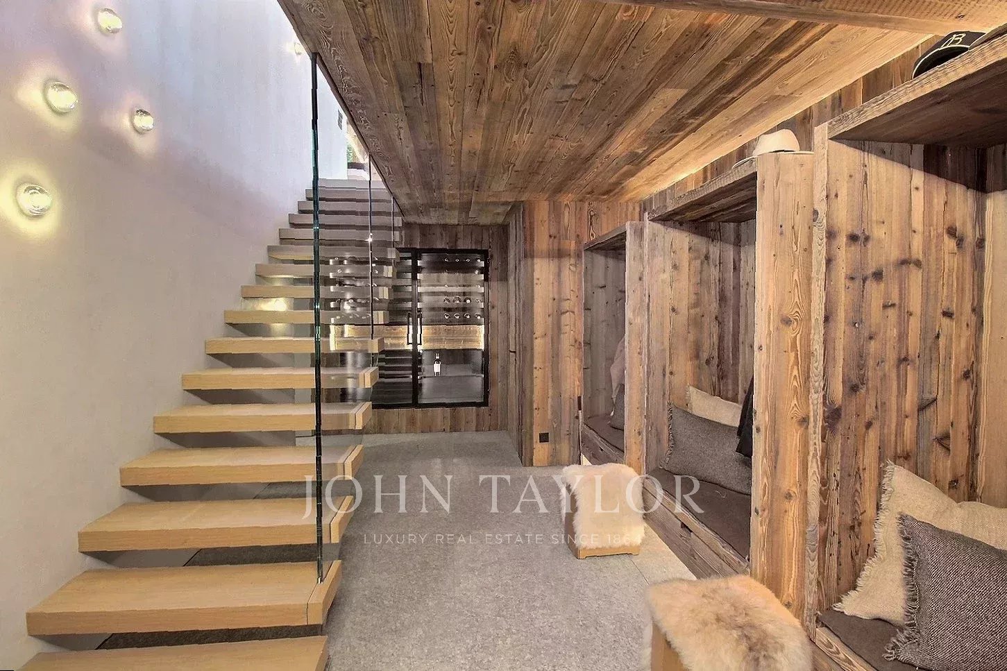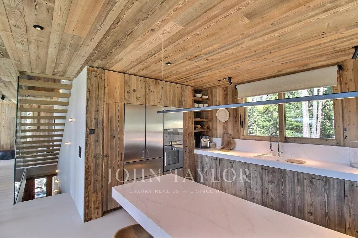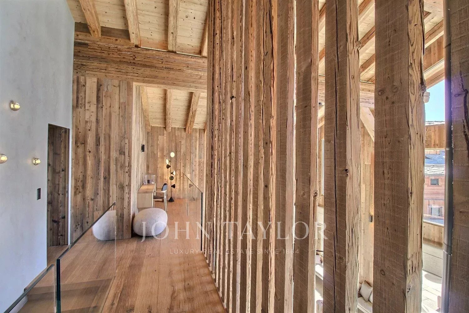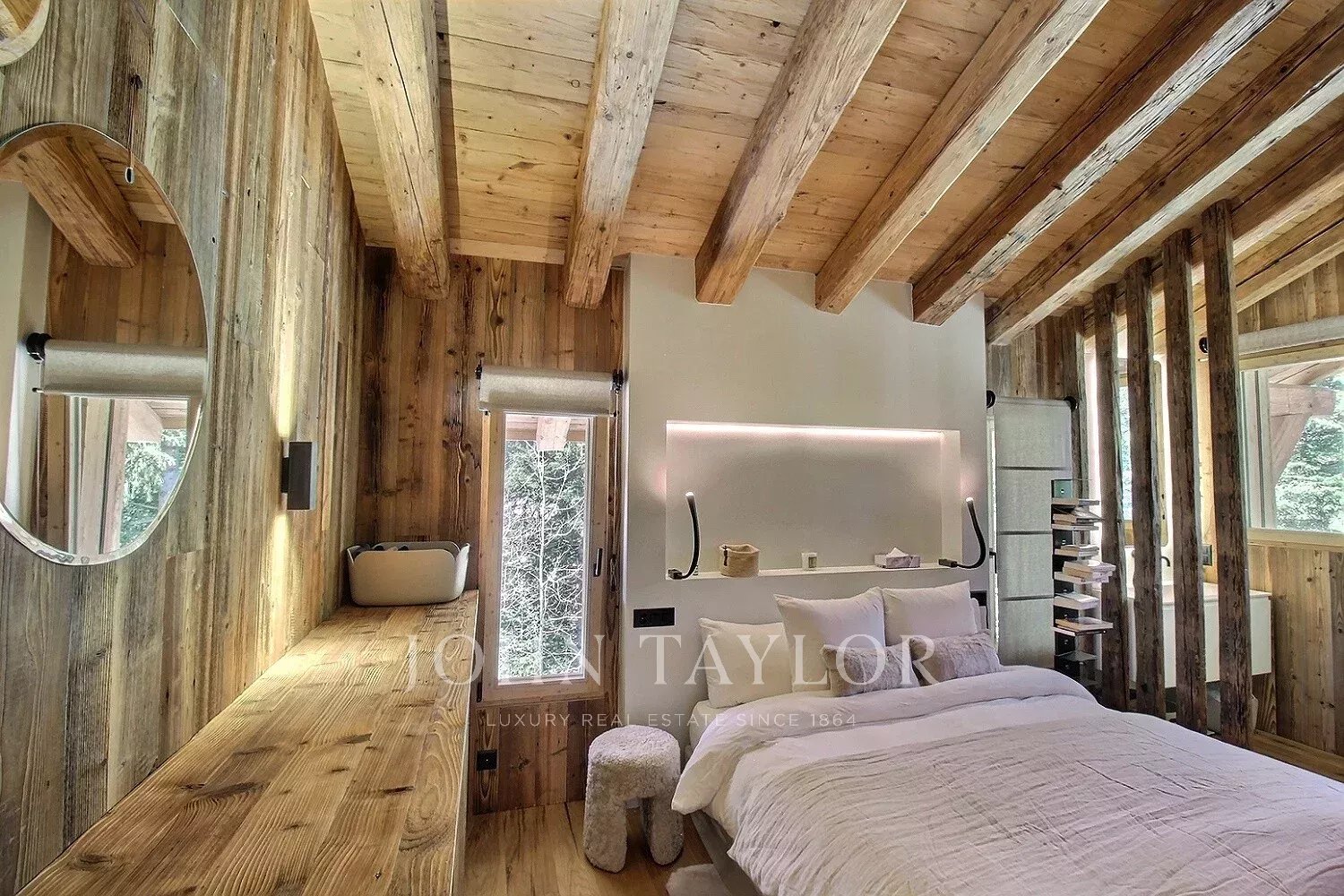 The chalet offers a warm, contemporary atmosphere in a modernized Alpine style: spacious living room with high ceilings, large south-west-facing windows, exposed solid wood framework and a double-sided fireplace integrated into the living room.