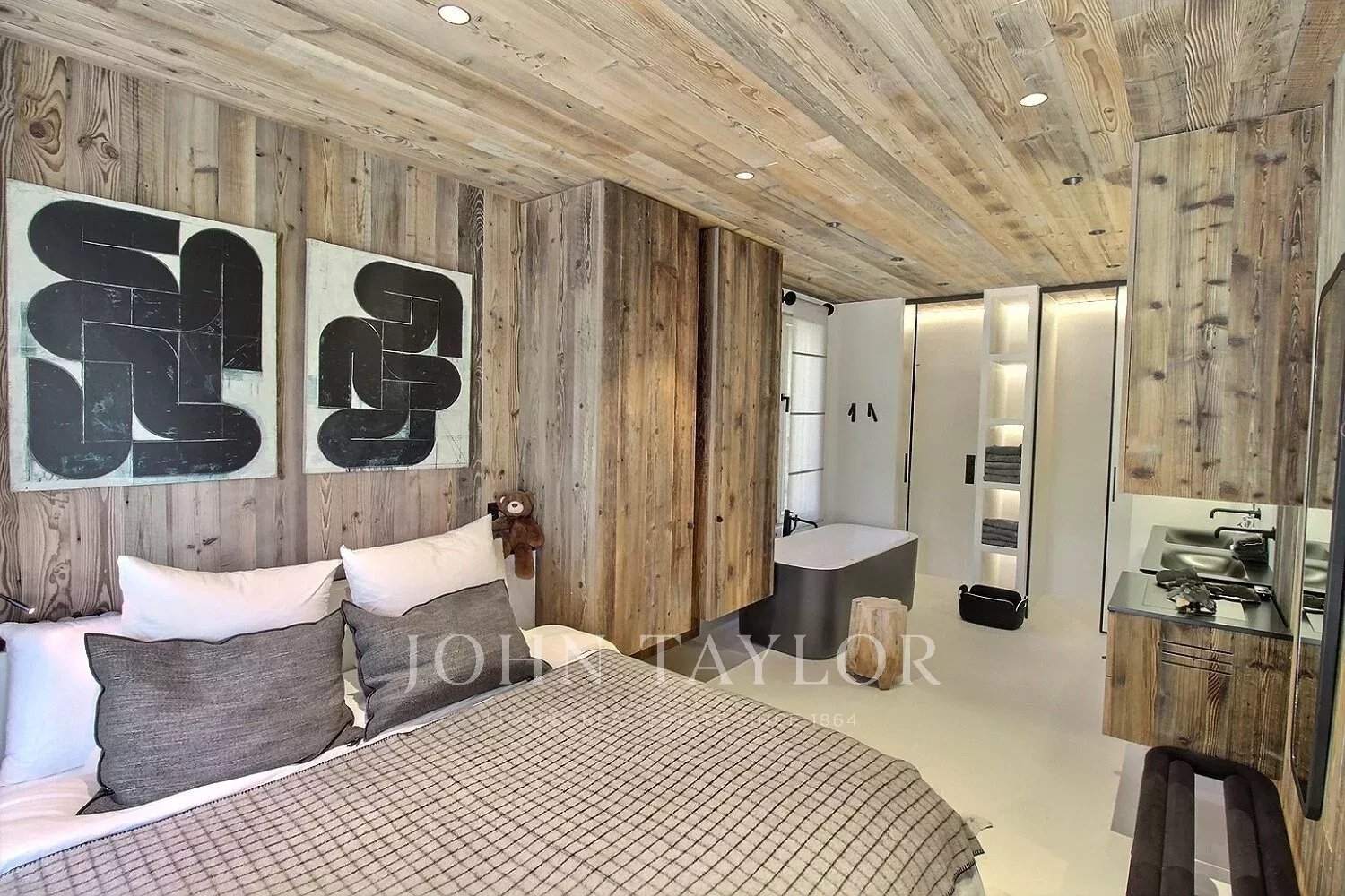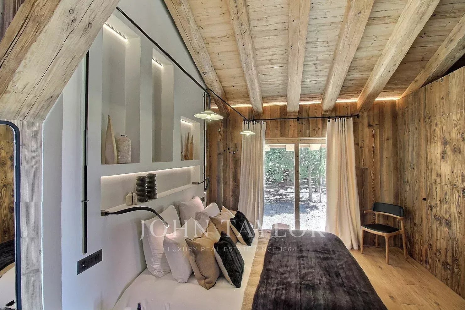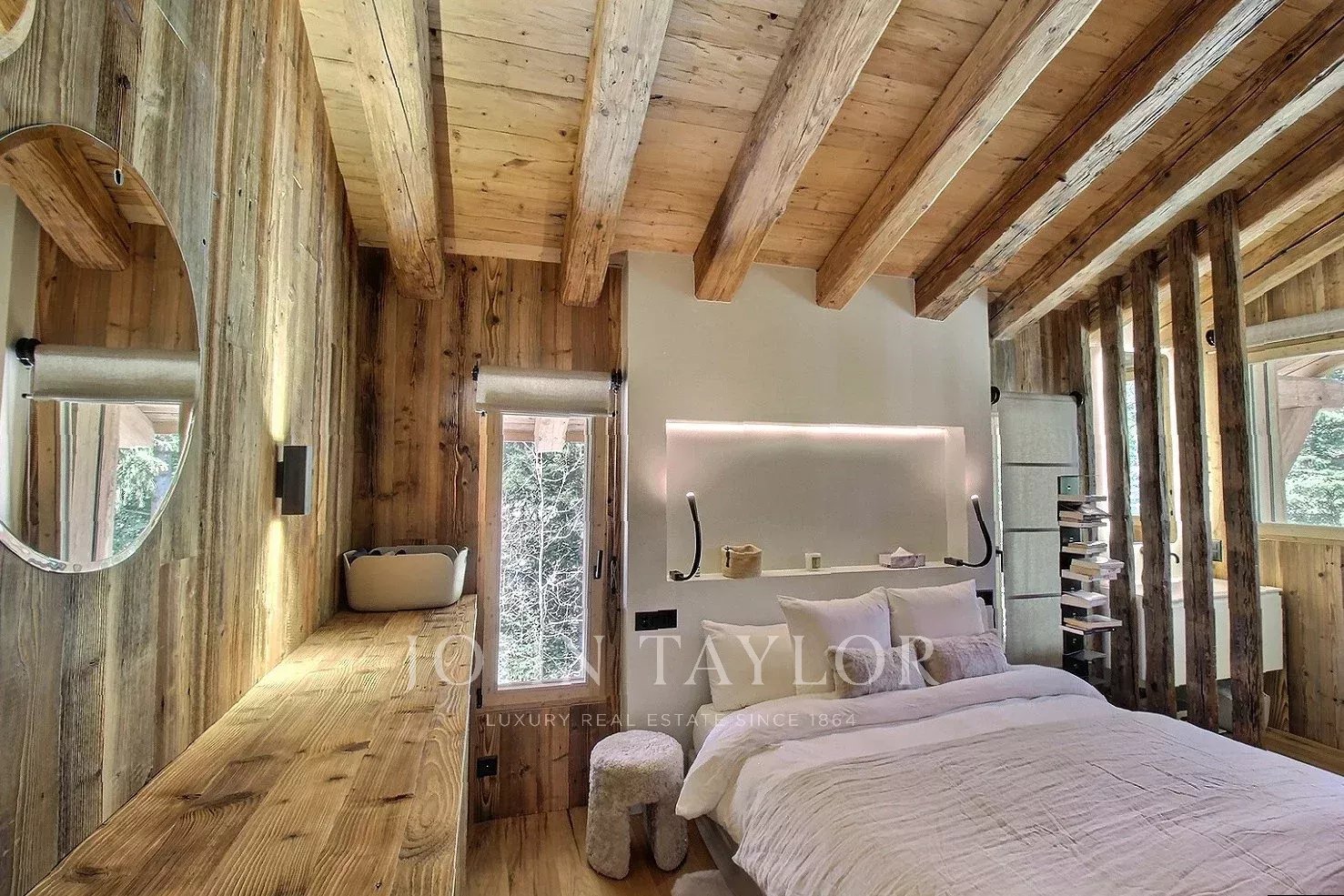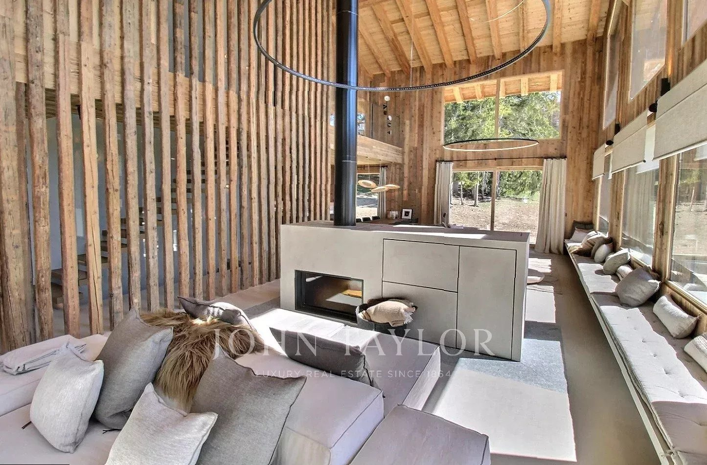 The chalet offers a warm, contemporary atmosphere in a modernized Alpine style: spacious living room with high ceilings, large south-west-facing windows, exposed solid wood framework and a double-sided fireplace integrated into the living room.