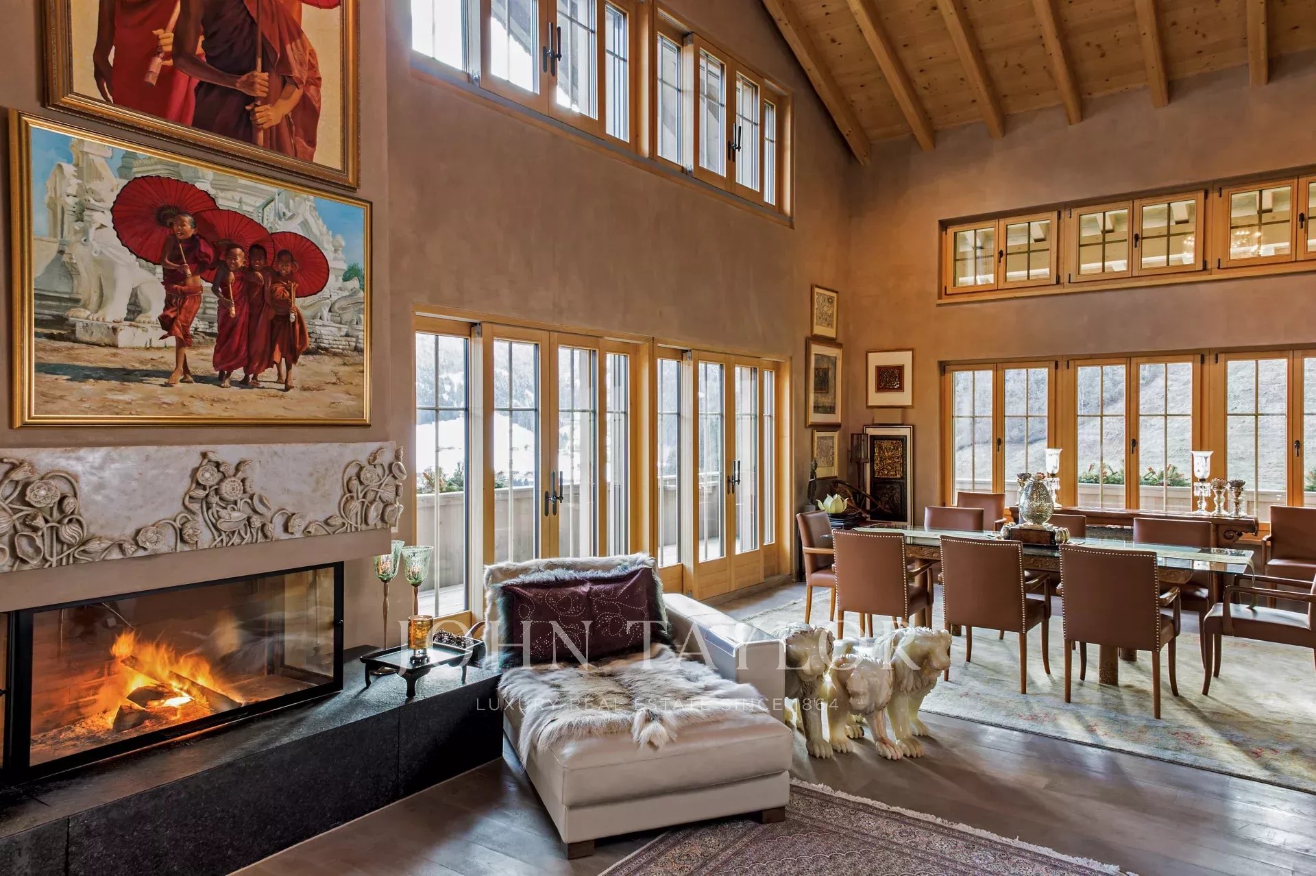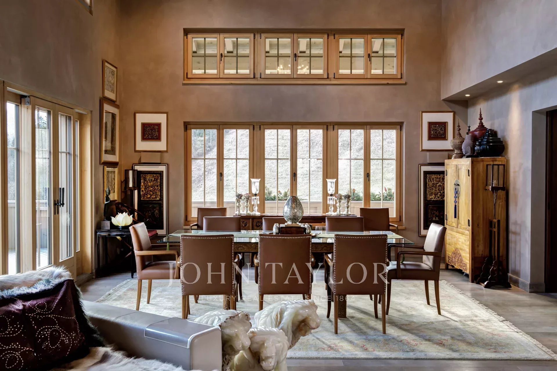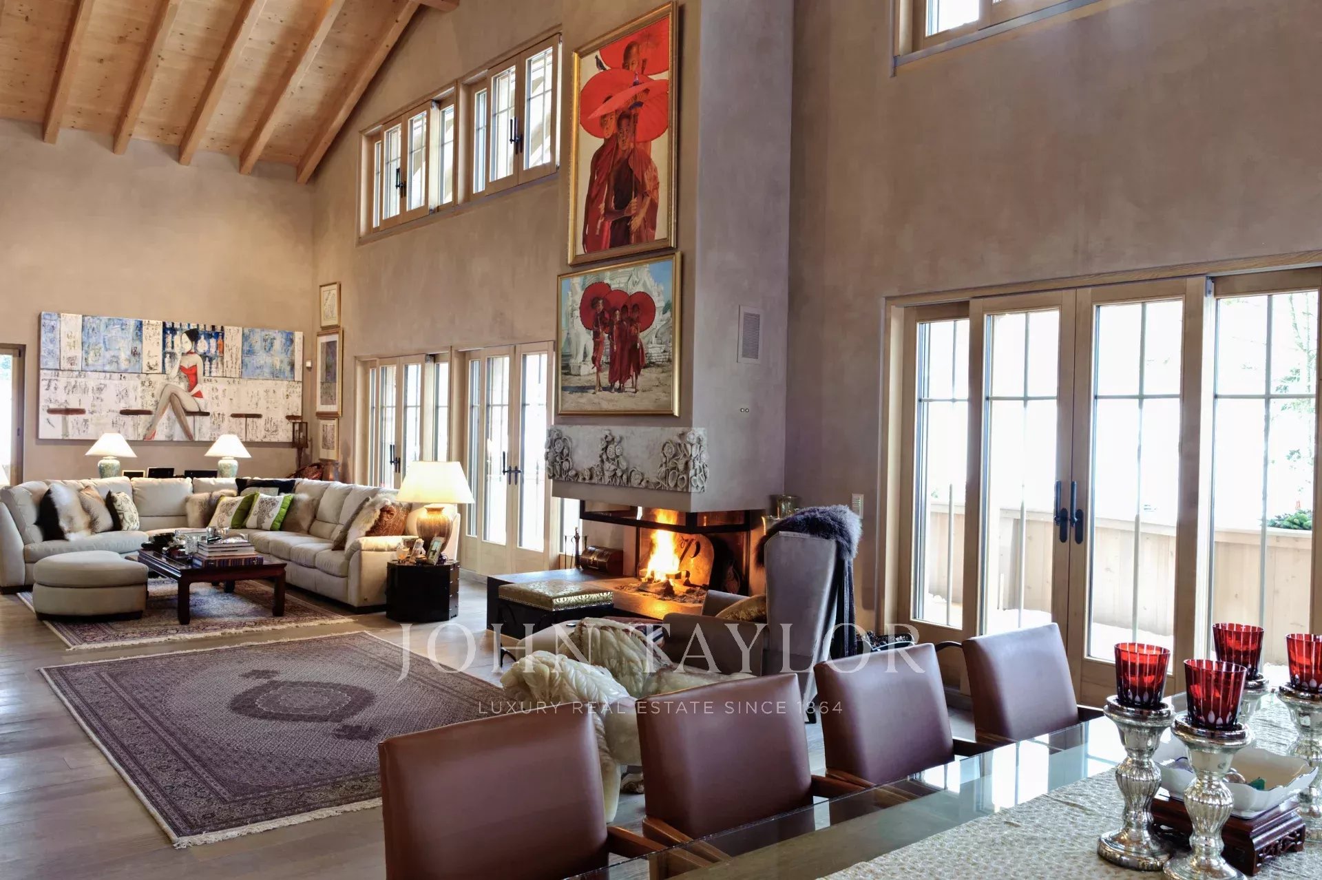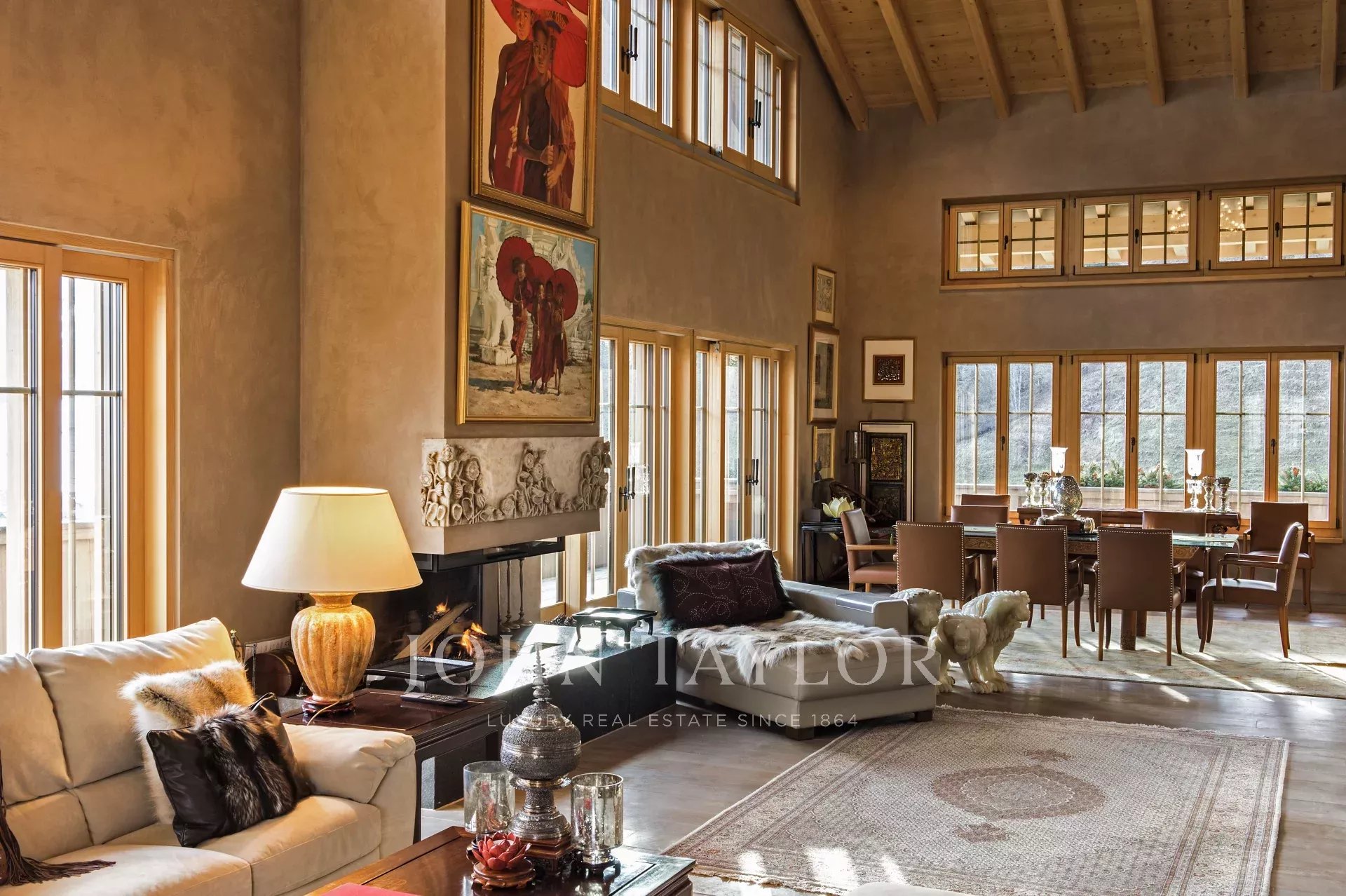 Spacious three levels with a total 405 sq.m3 of internal space, and a 3 meter-wide wrap-around balcony. Height in Living and Dining space with ceiling peak at 8 meters.Open Living and Dining space with hand-carved marble fireplace and ceiling peak at 8 meters height. Kitchen with 2-sided fireplace. Three spacious bedrooms with big private bathrooms and built-in closets, shelves and cabinets. Height in level 1 and 2 rooms at 3 meters, and higher peaked ceilings in level 3. Unobstructed view from most rooms, with 180 degree view in Living/Dining, Kitchen, Master Bedroom and Library. Elevator and indoor garage for two cars.