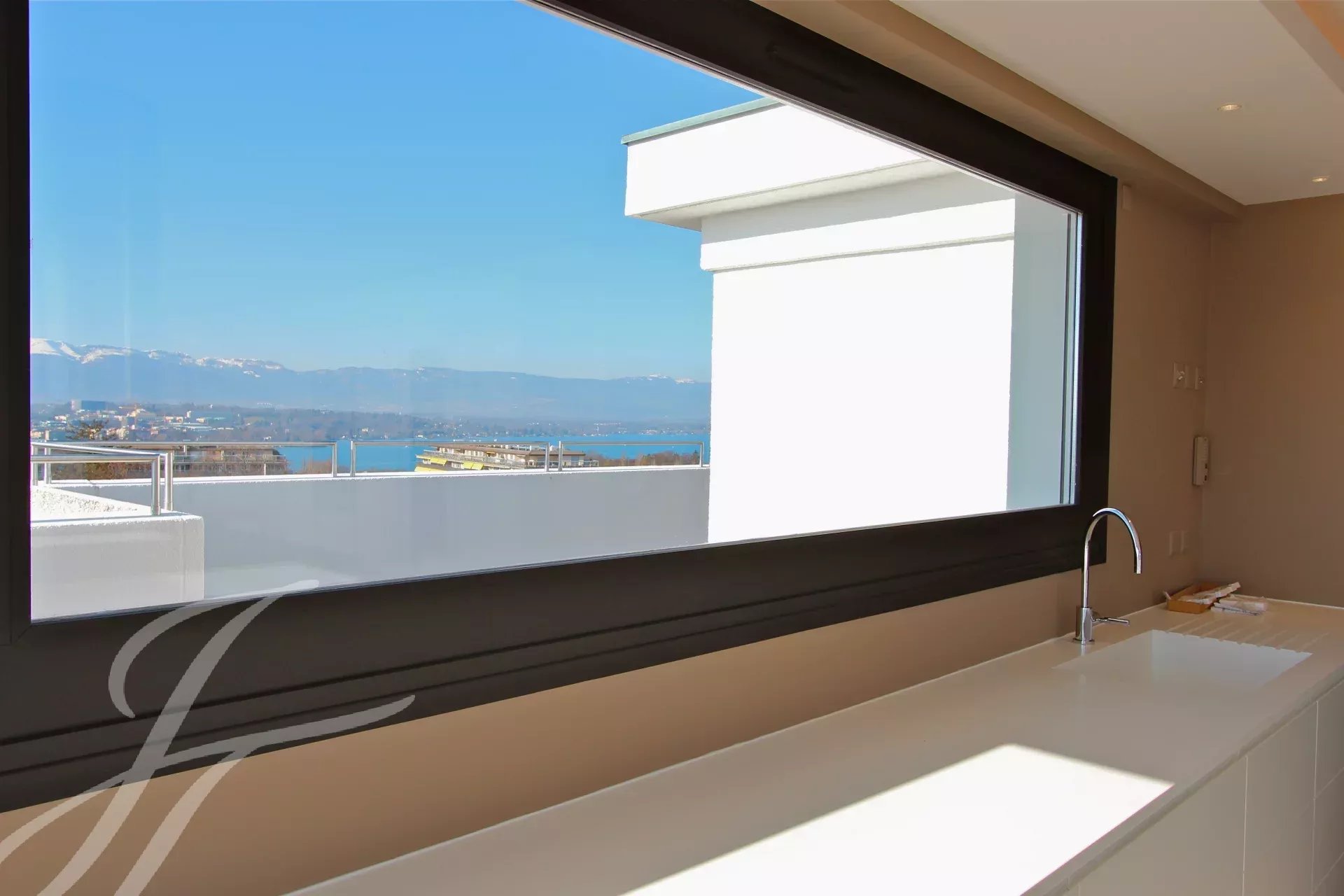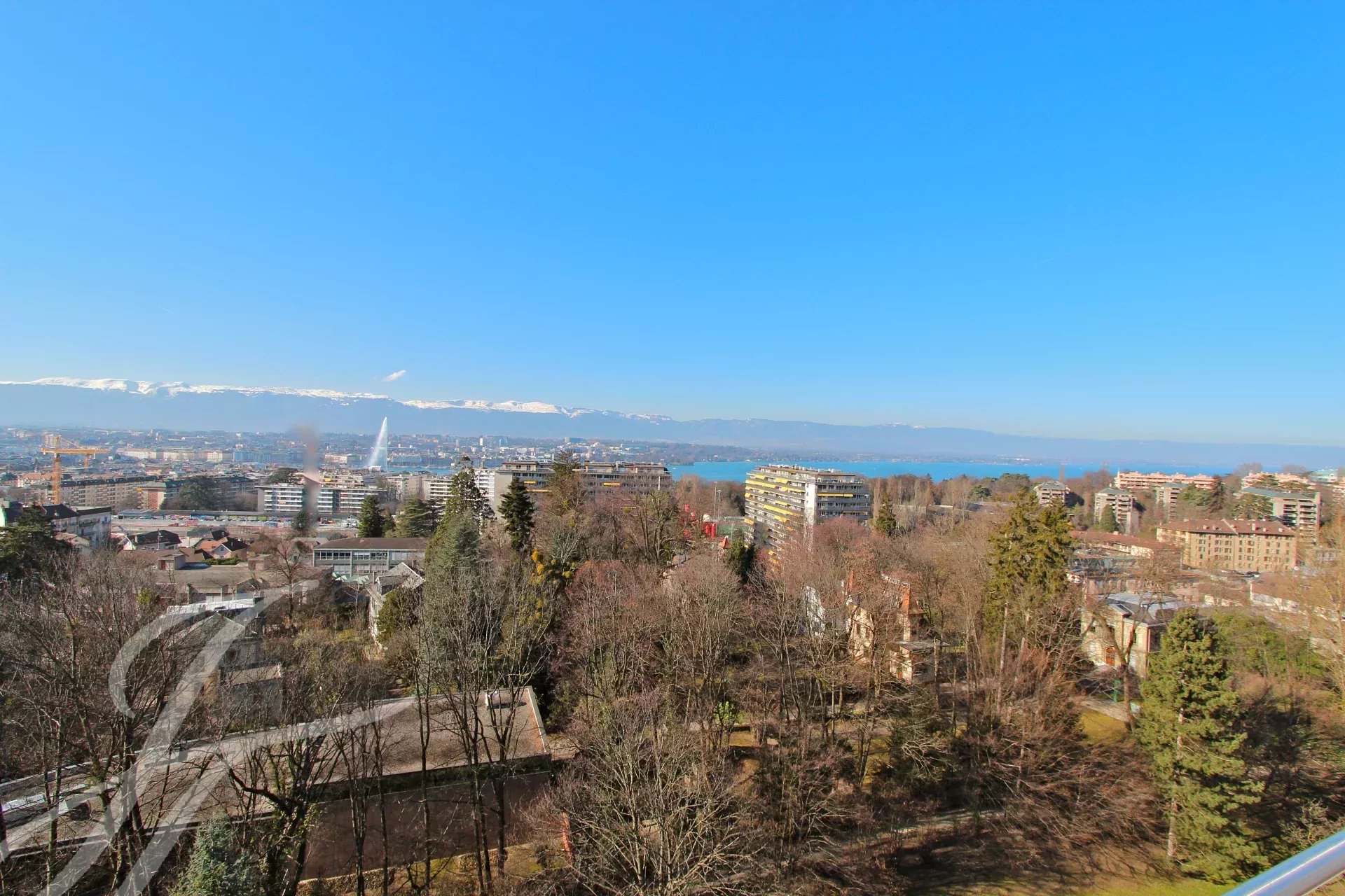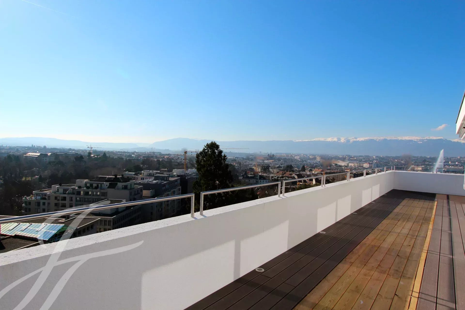 In the heart of Geneva, this splendid 230 m² penthouse duplex stands out as a veritable “villa on the roof.” It boasts a 120 m² terrace and two balconies, each measuring 9 m², offering a unique panoramic view of the city, the Jet d'Eau fountain, the lake, and the surrounding mountains.