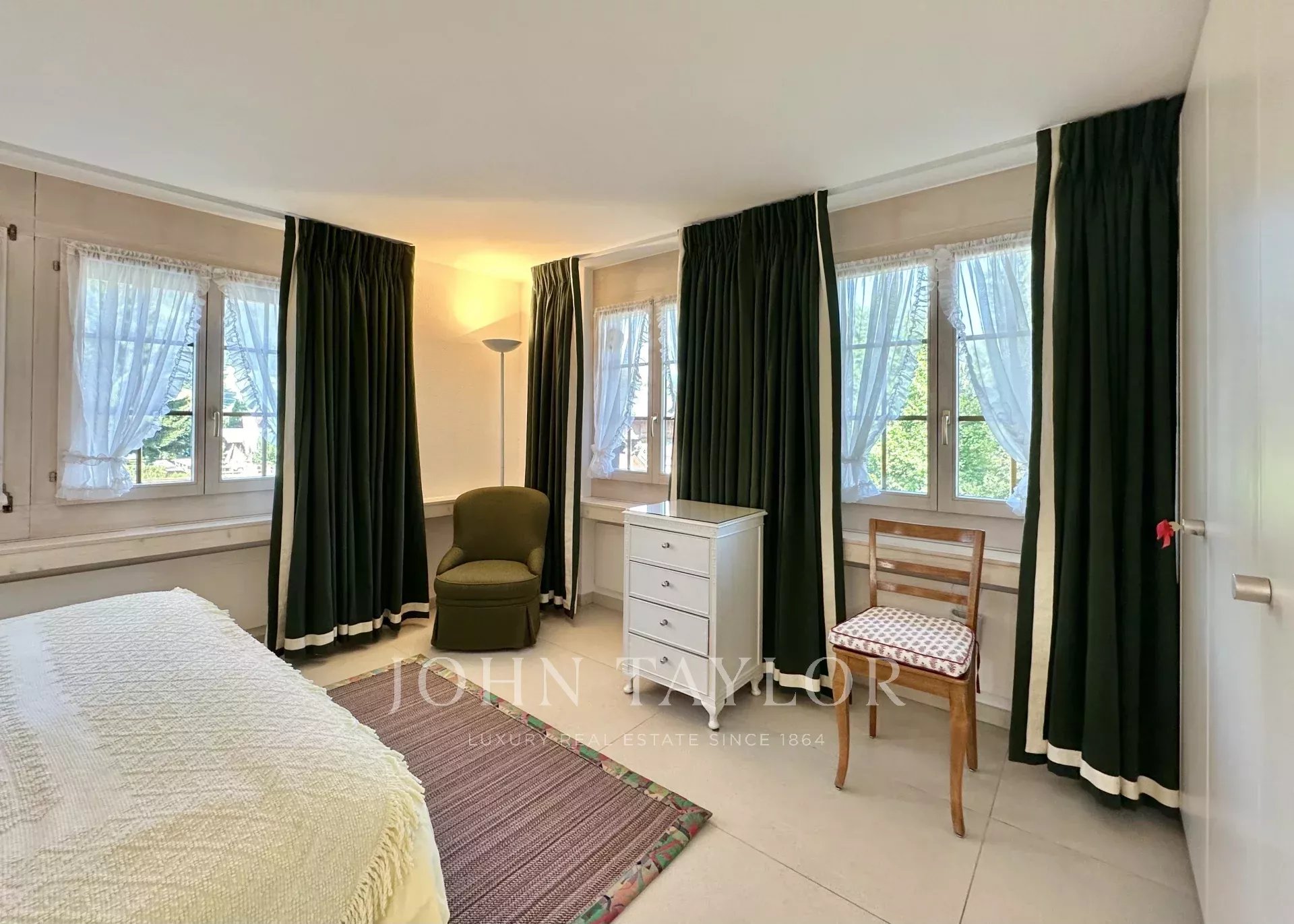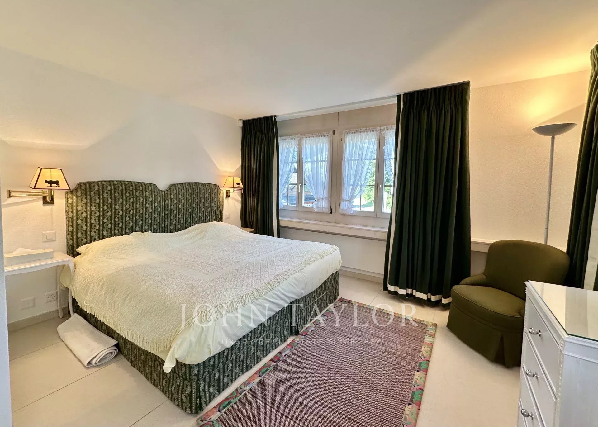 The balcony offers views of Gstaad and the surrounding mountains.