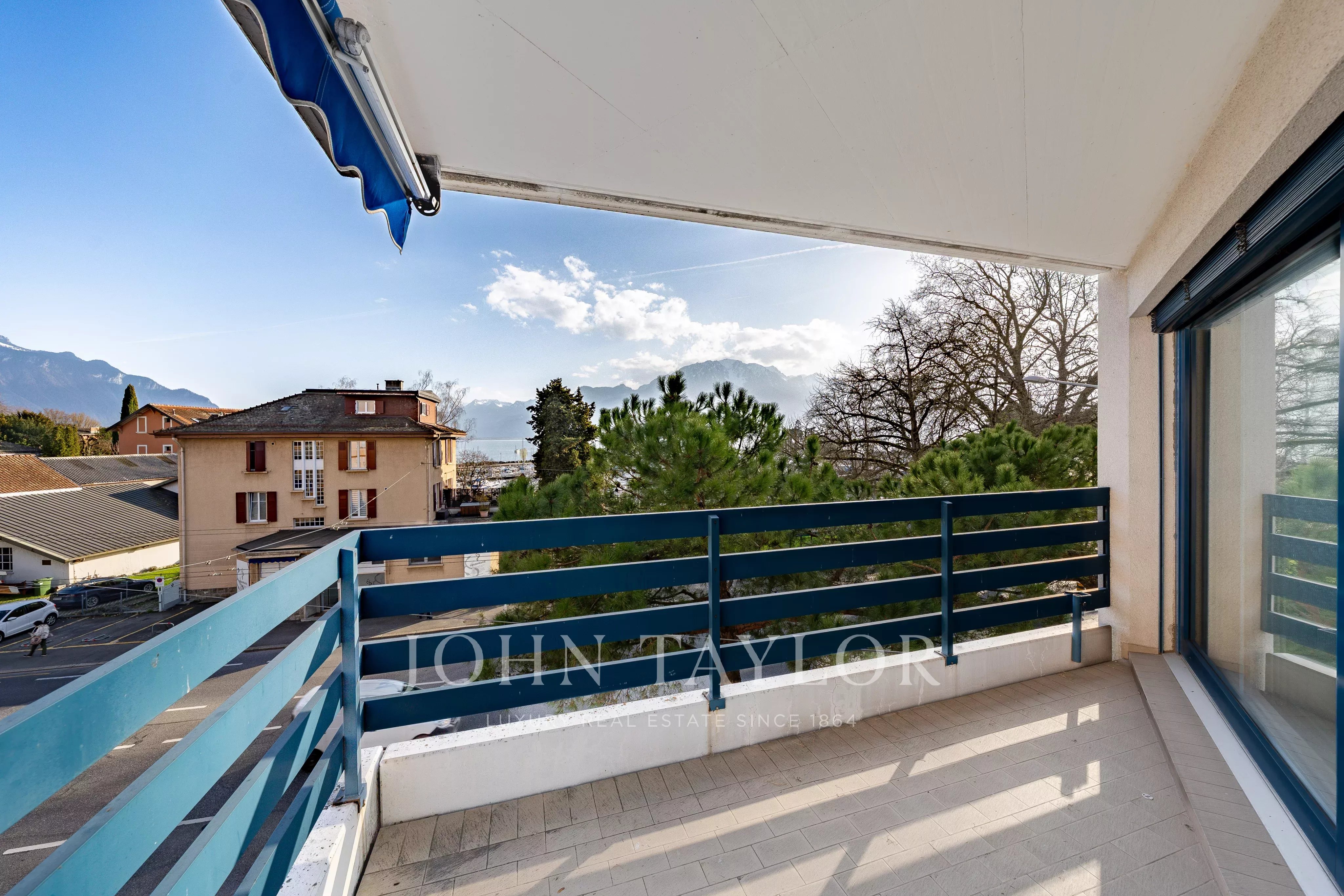 The apartment features a large and bright living room with a fireplace, creating a warm and welcoming atmosphere. Large French doors open onto a balcony, offering a pleasant open view of the lake and surrounding area.