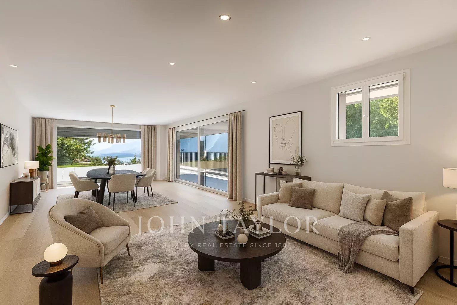 -Large living room with bay windows and open kitchen
