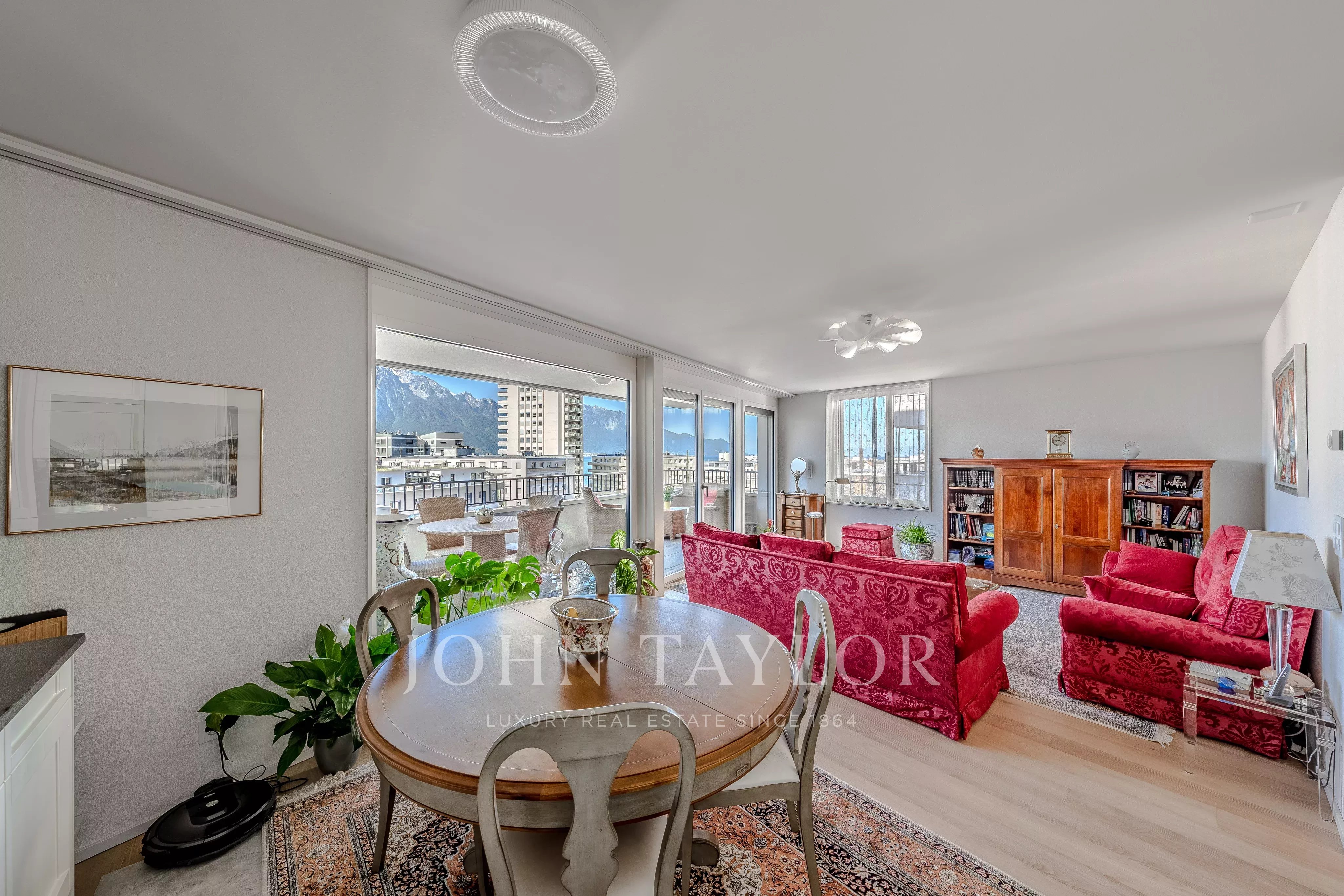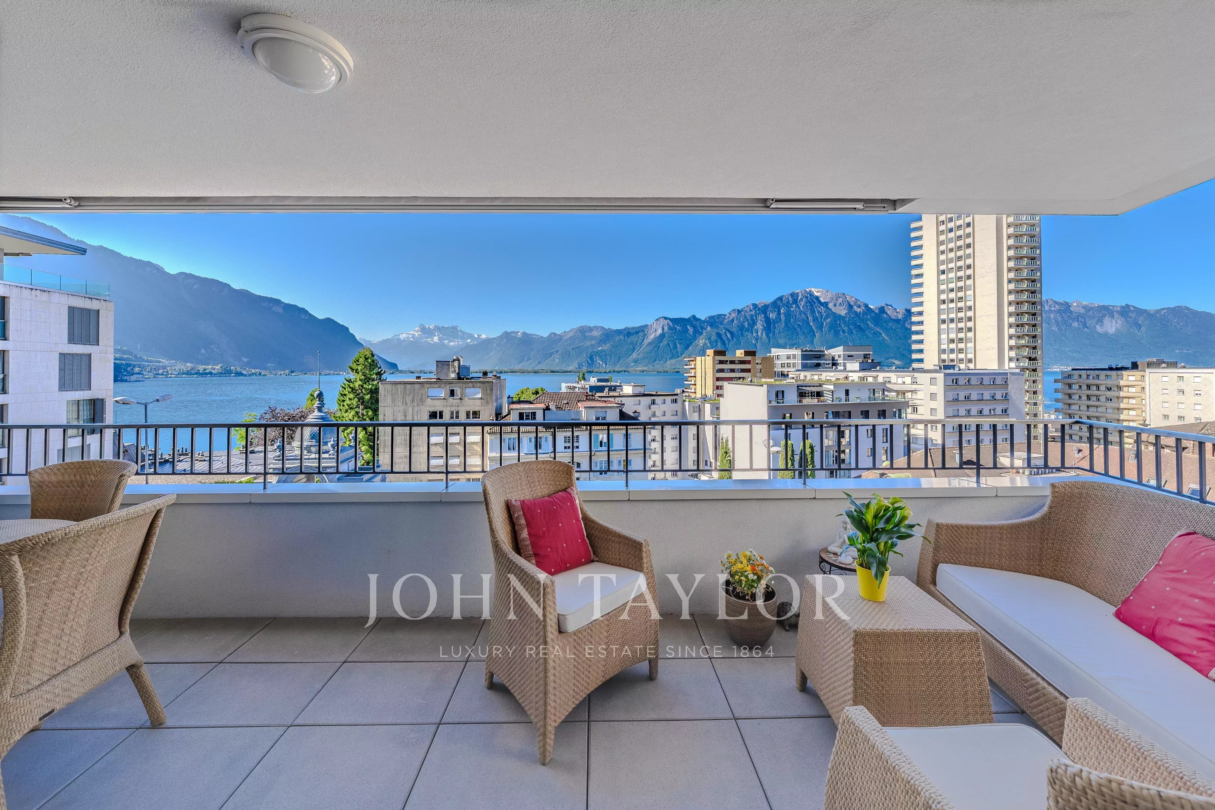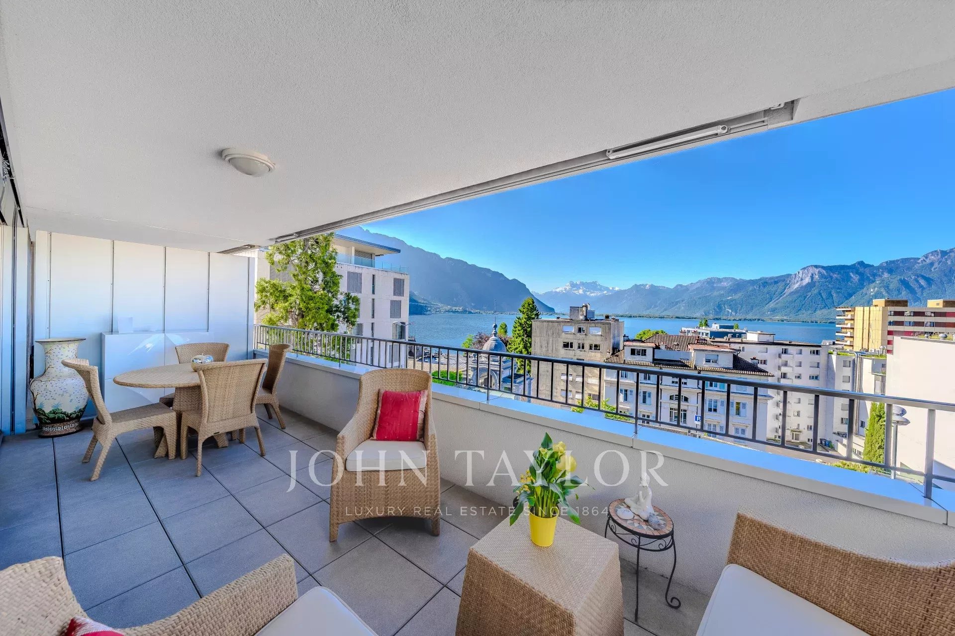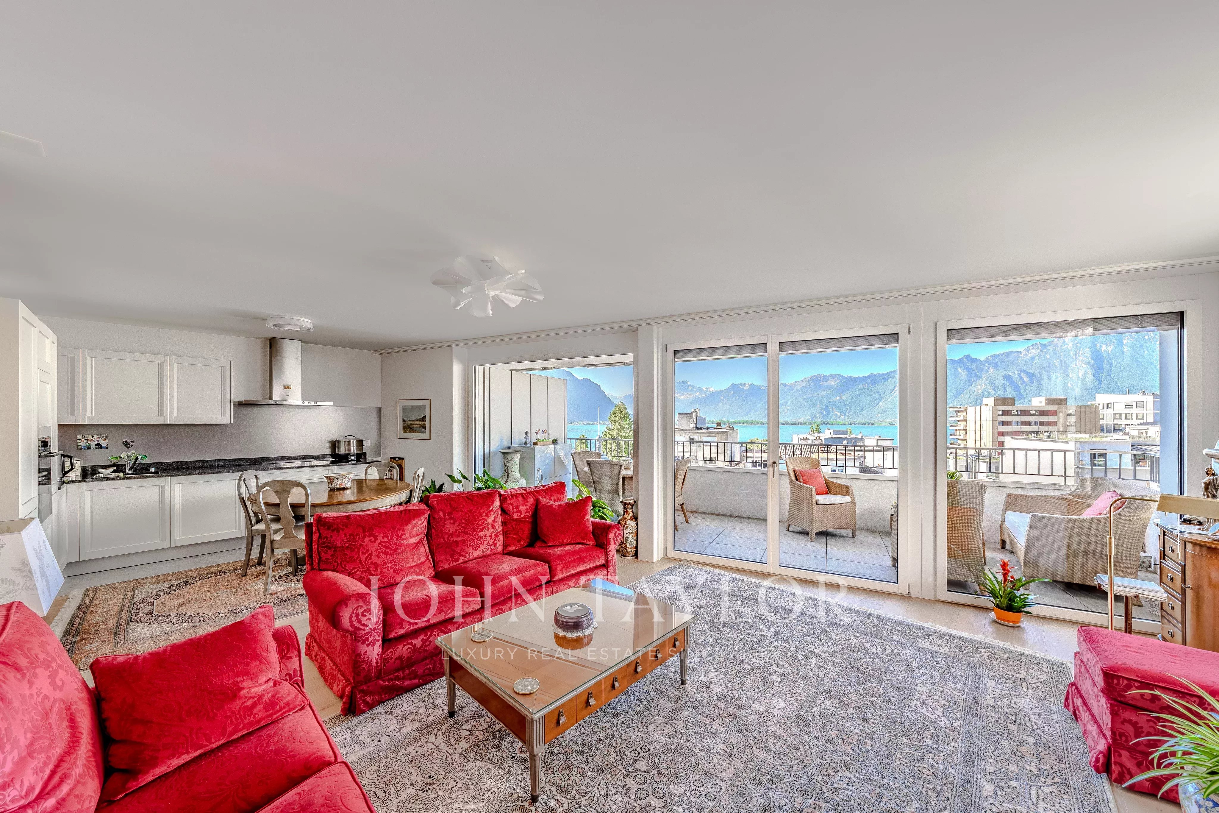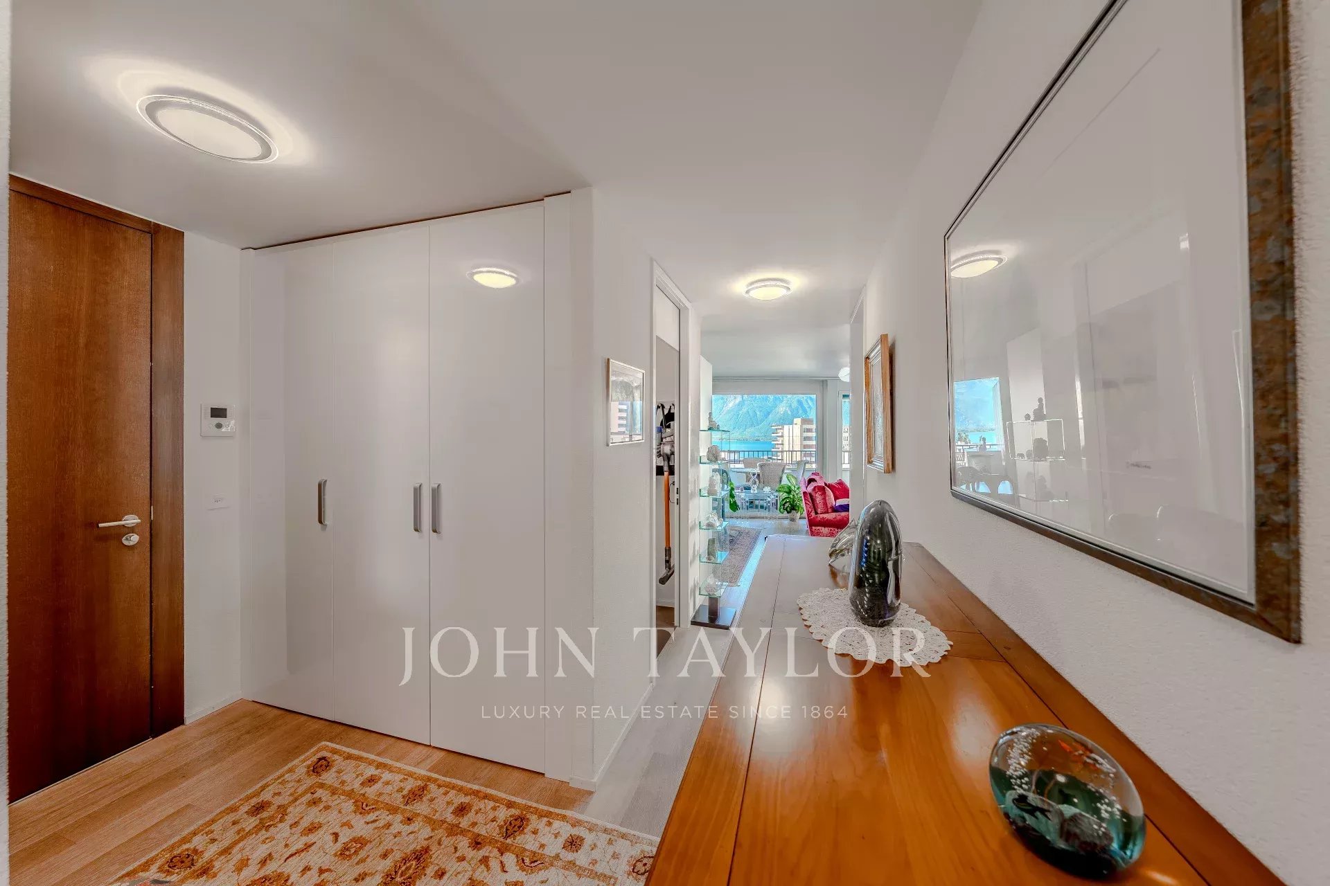 - The apartment comprises a spacious living room with dining area and open kitchen, opening onto a large 20 m² balcony with exceptional views of Lake Geneva and the Dents du Midi mountains.