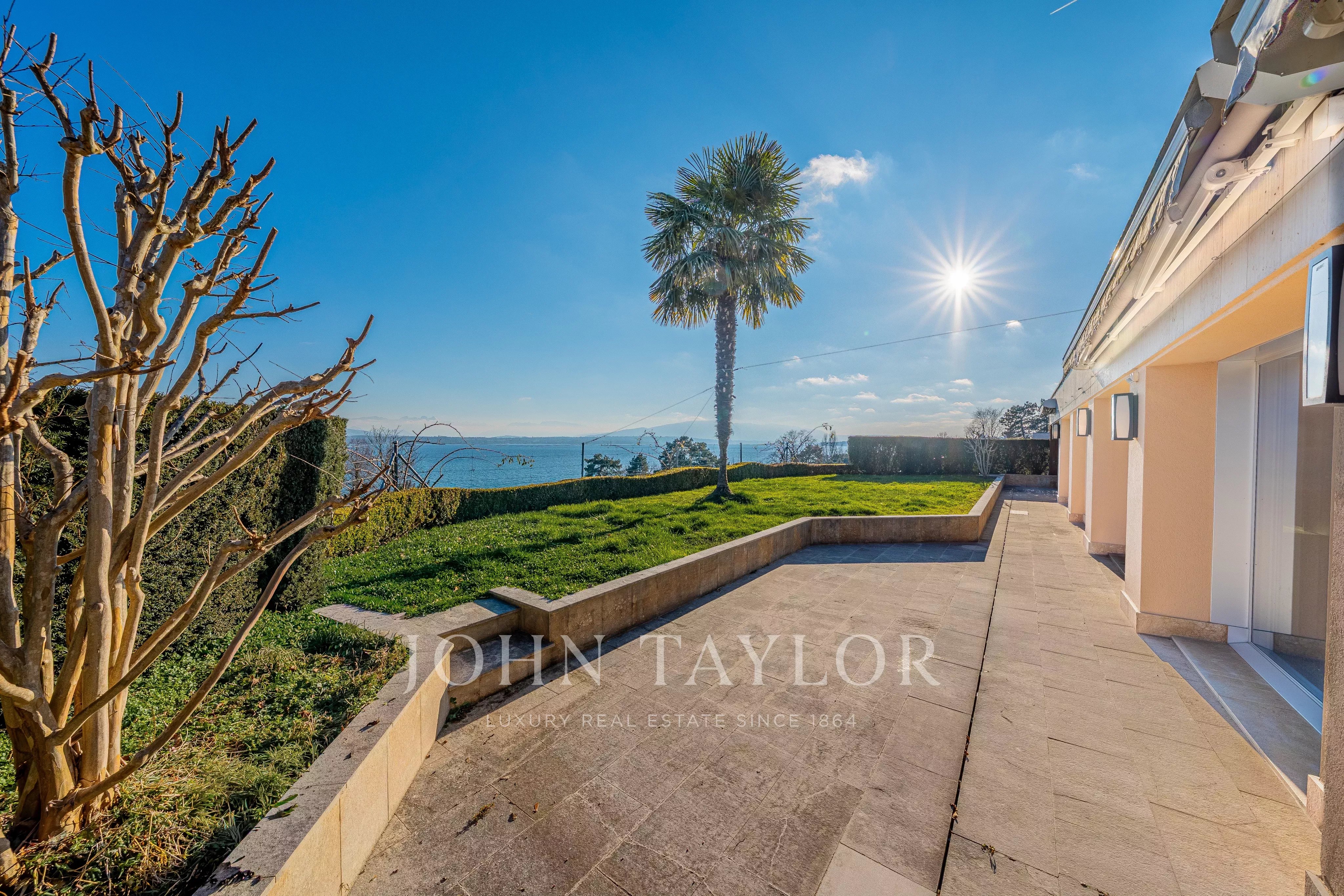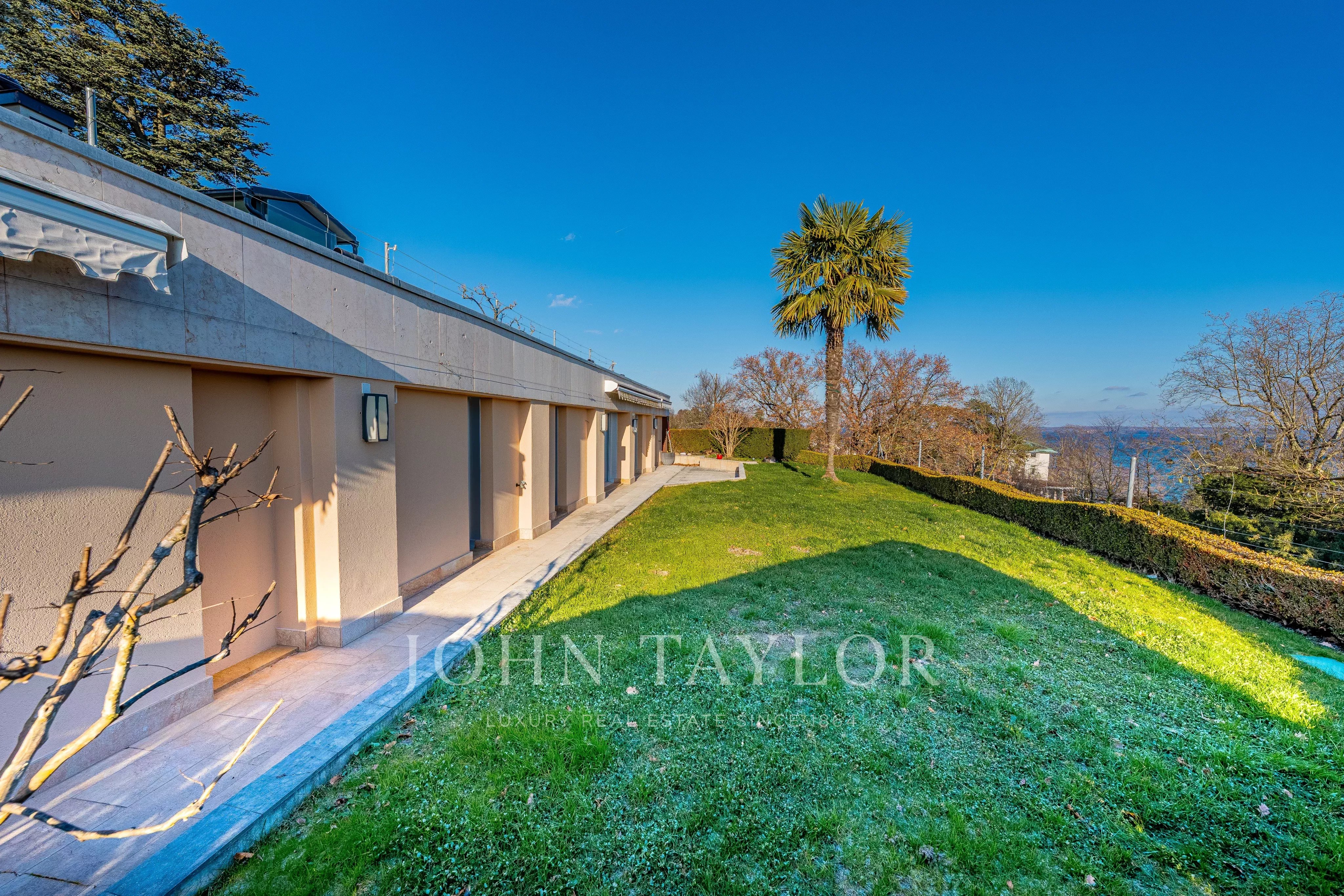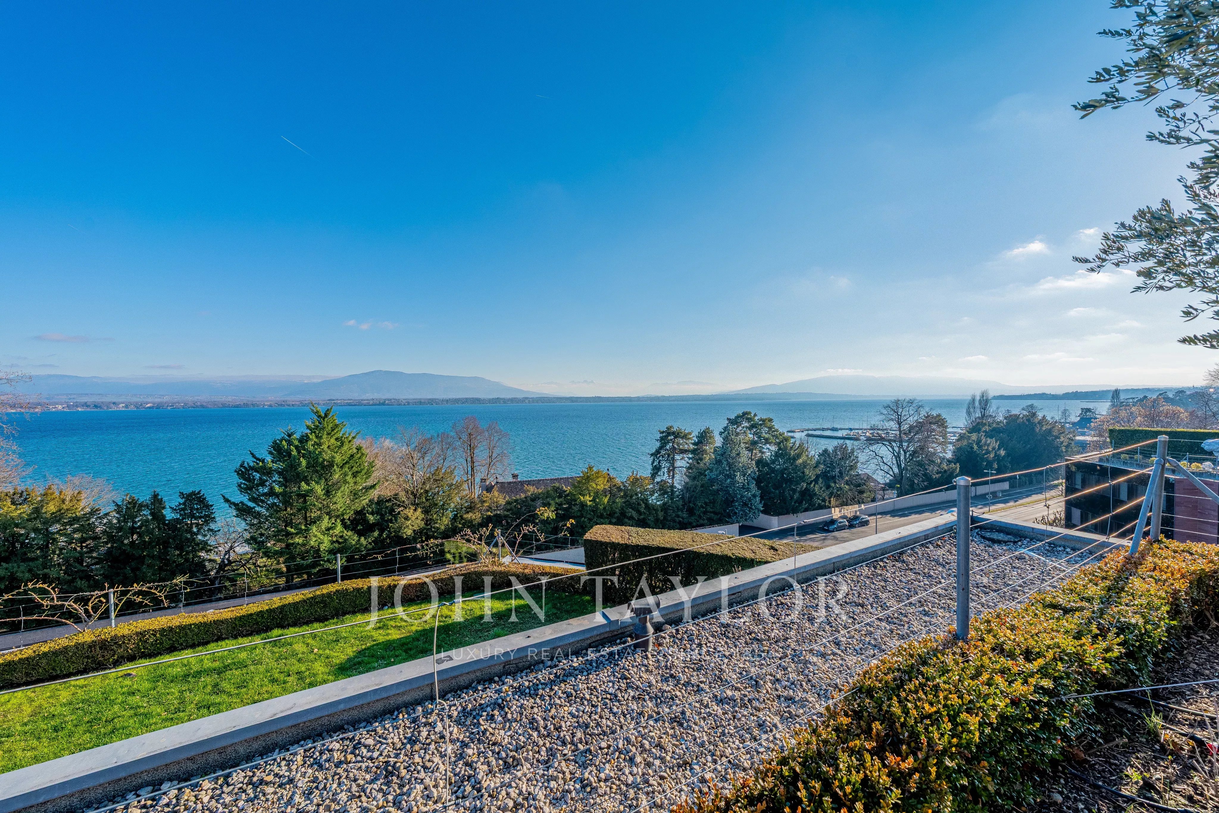 Nestled facing the lake, it enjoys an absolutely spectacular panoramic view over Lake Geneva, the Alps, the city of Geneva, and its iconic Jet d’Eau.