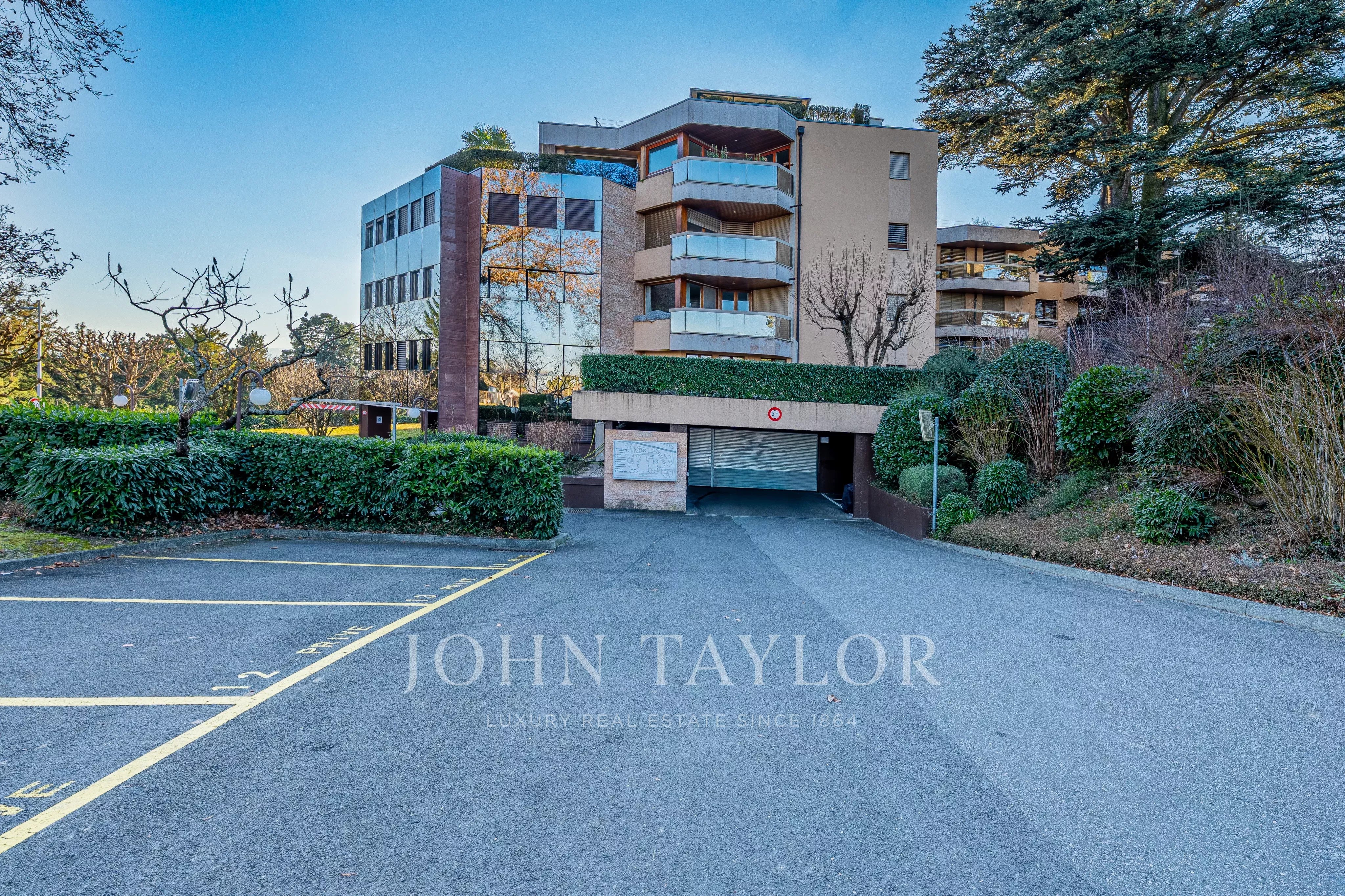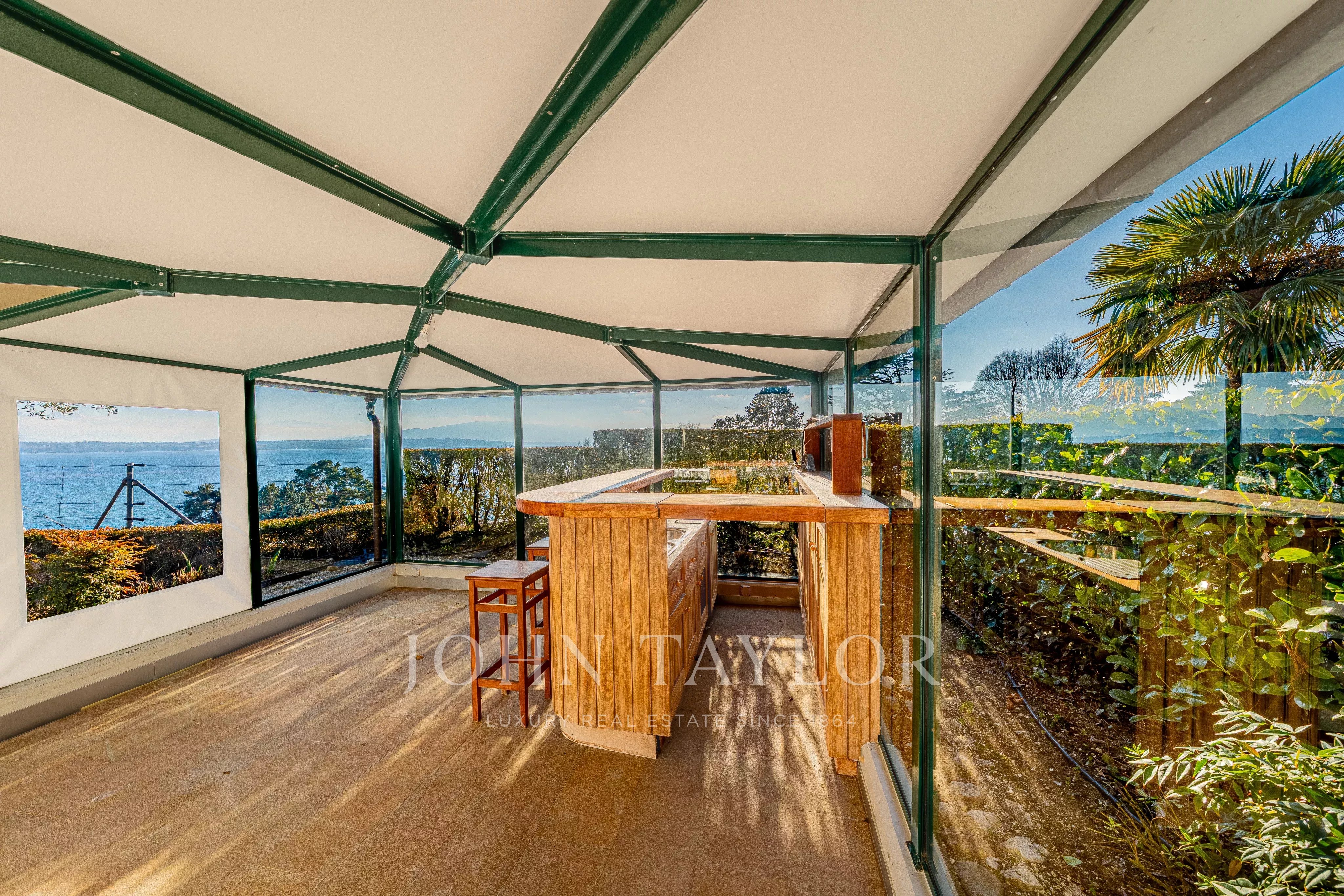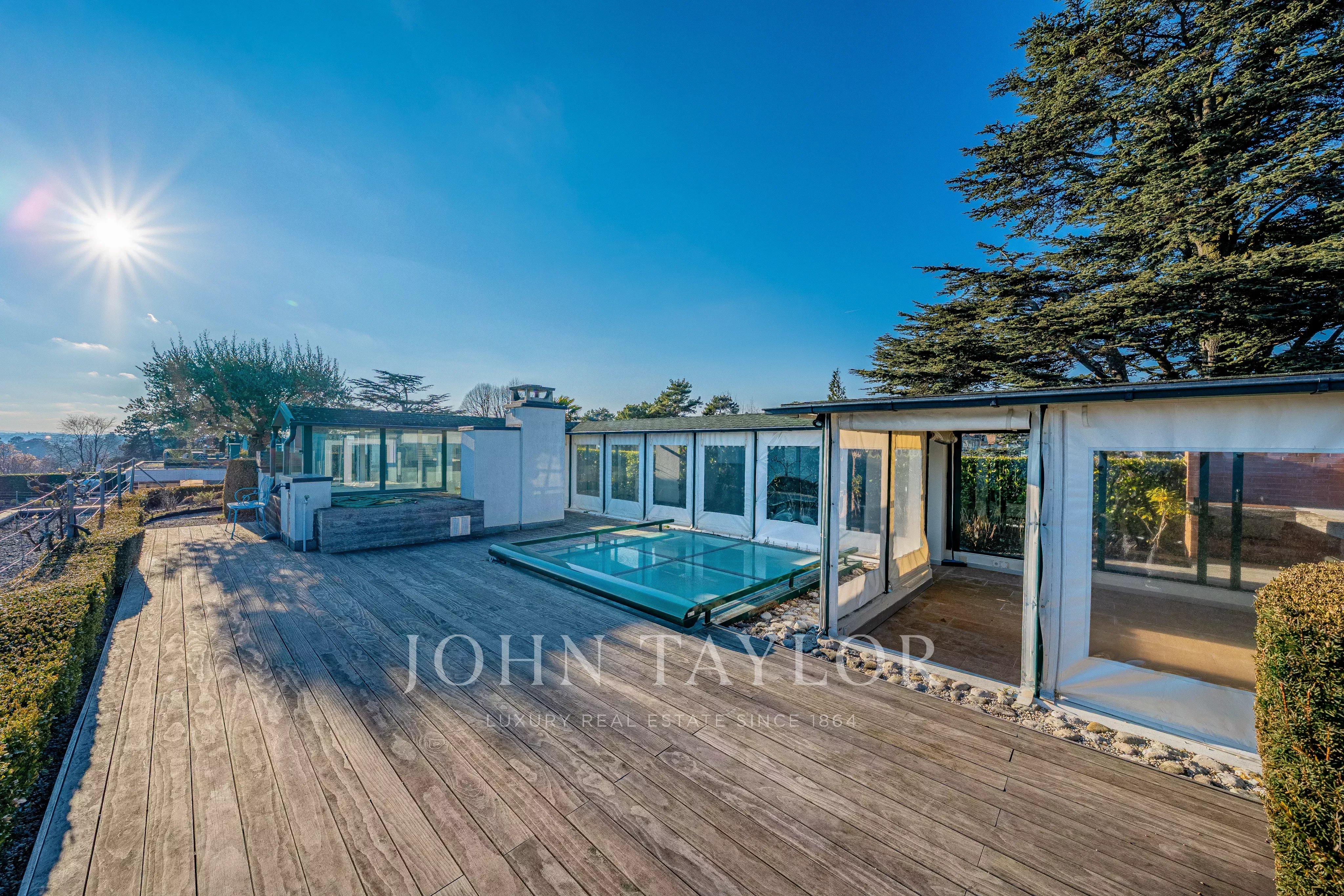Nestled facing the lake, it enjoys an absolutely spectacular panoramic view over Lake Geneva, the Alps, the city of Geneva, and its iconic Jet d’Eau.