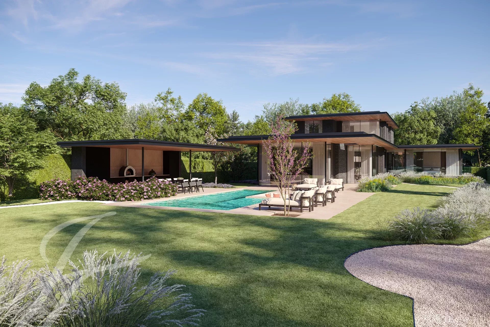 The plot is perfectly flat, unoverlooked and bathed in light, offering a setting of absolute rarity, where architecture and nature interact in harmony.