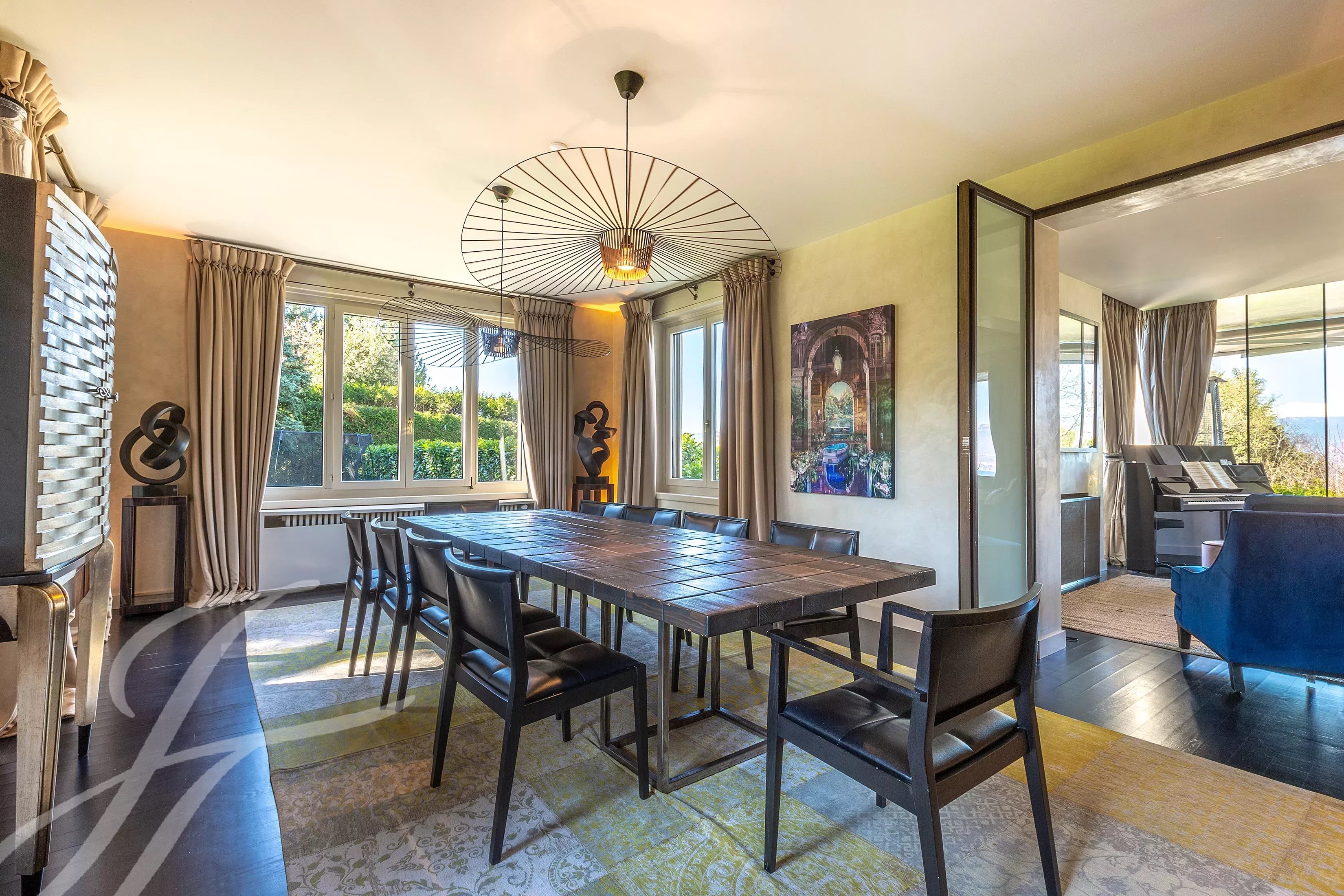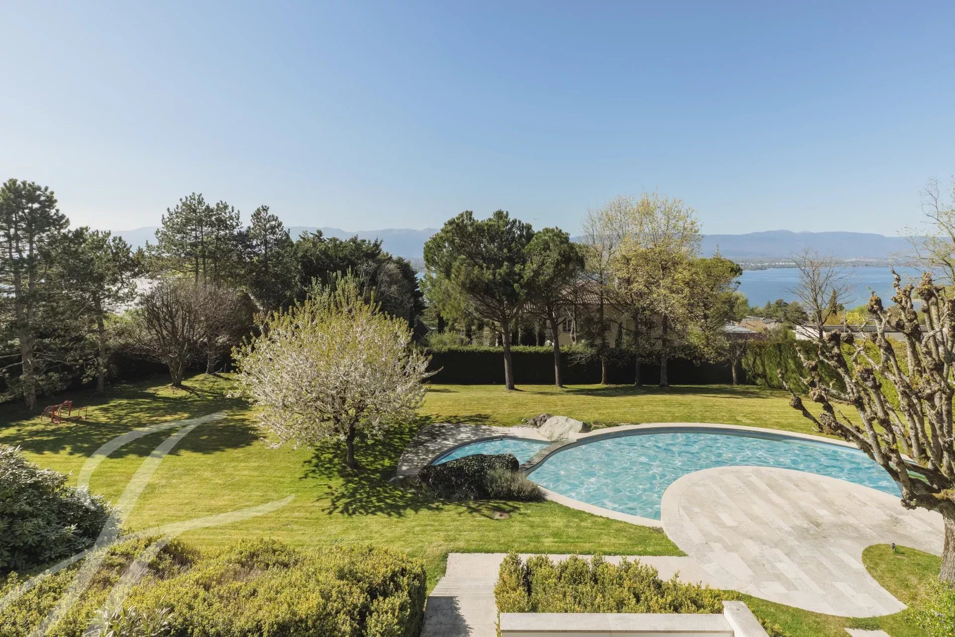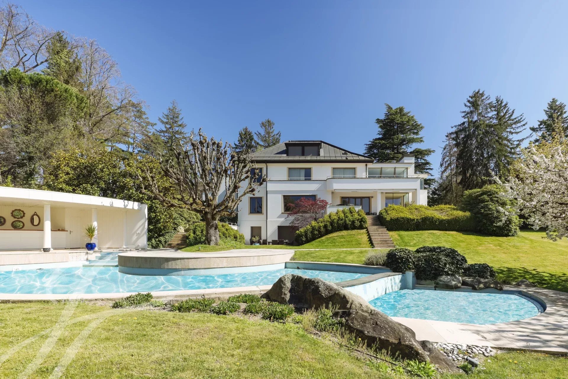 Located in the prestigious commune of Cologny, this magnificent property enjoys views over Lake Geneva and the Jura mountains, offering an exceptional and peaceful living environment.