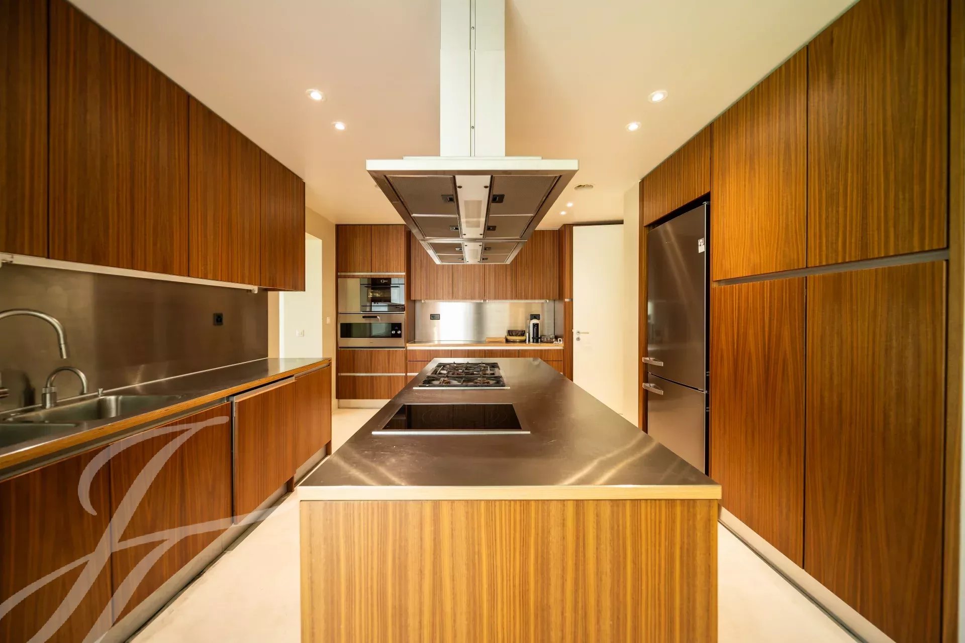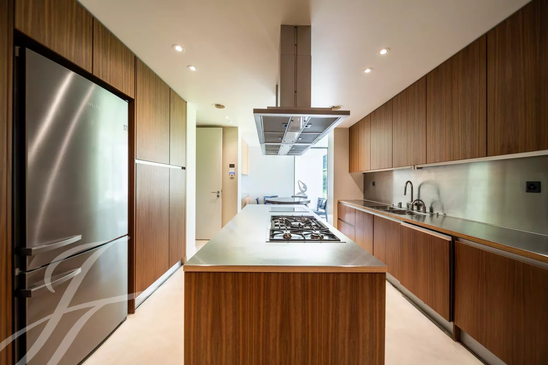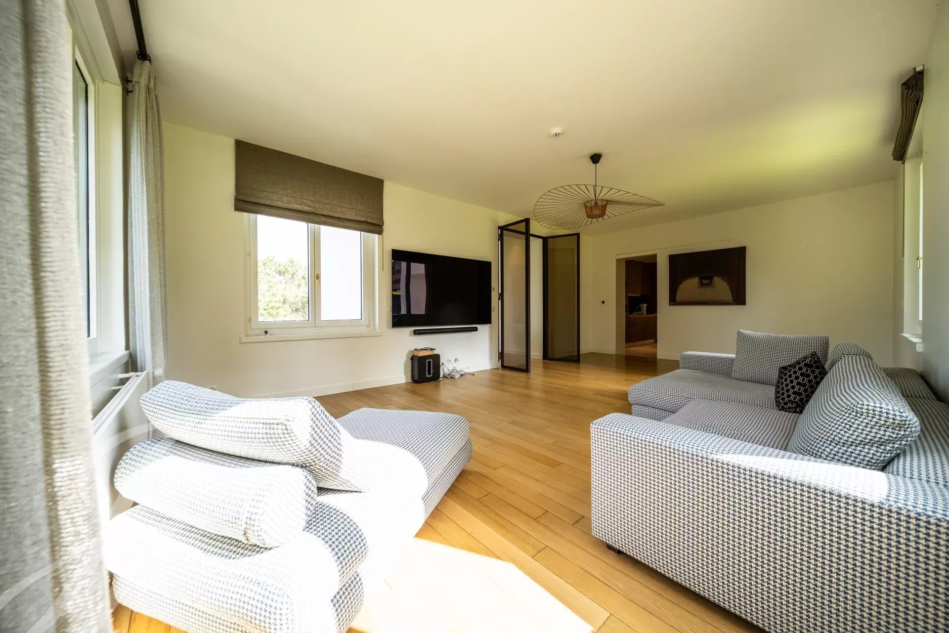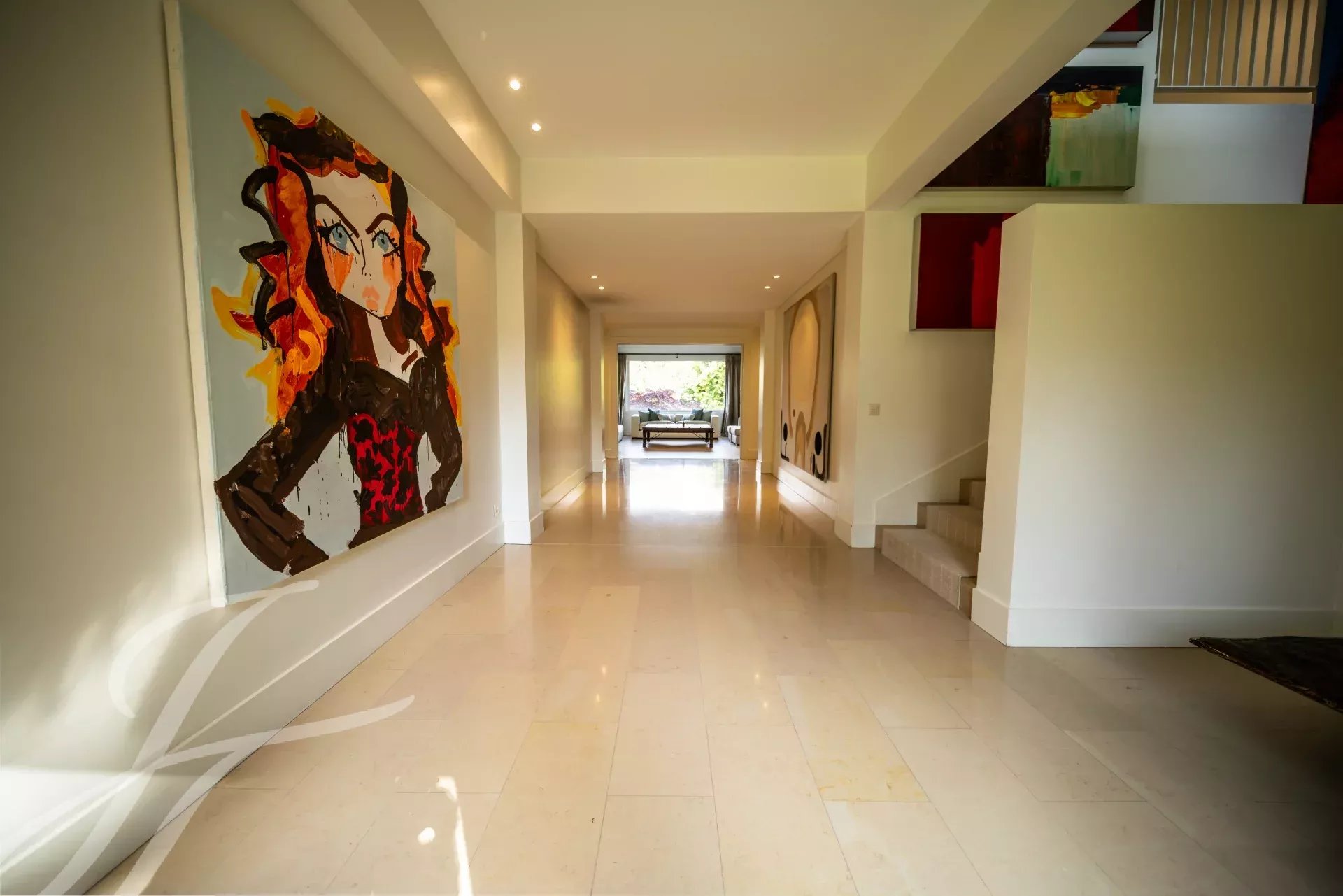 The reception rooms flow harmoniously into one another and open onto several terraces, inviting relaxation. A beautiful fully-equipped kitchen with dining area and a large office complete the day spaces.