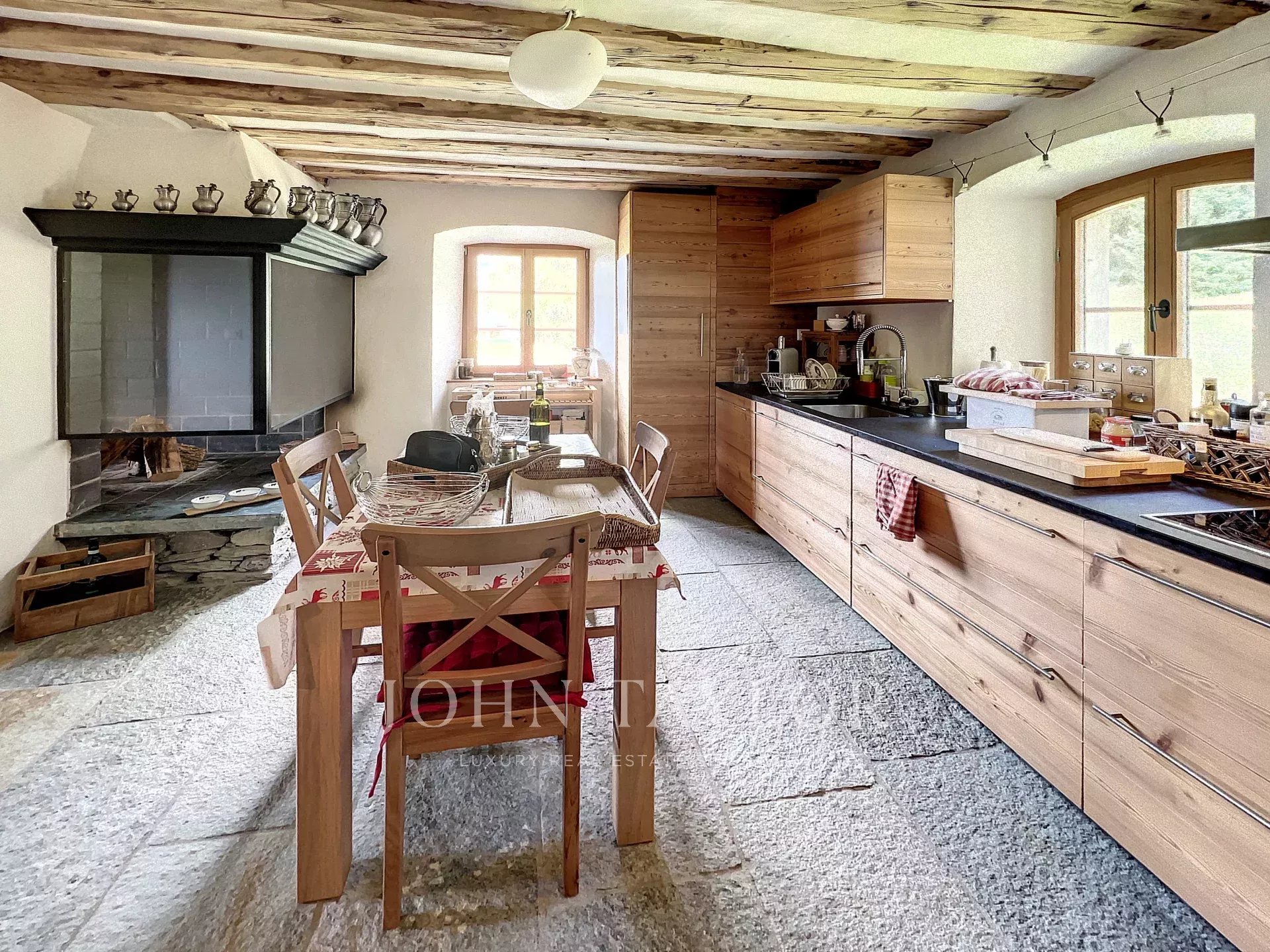 Completely renovated in 2016 using high-quality materials such as natural stone and larch, and a heat pump for underfloor heating. The fireplaces provide aesthetically pleasing additional heating.