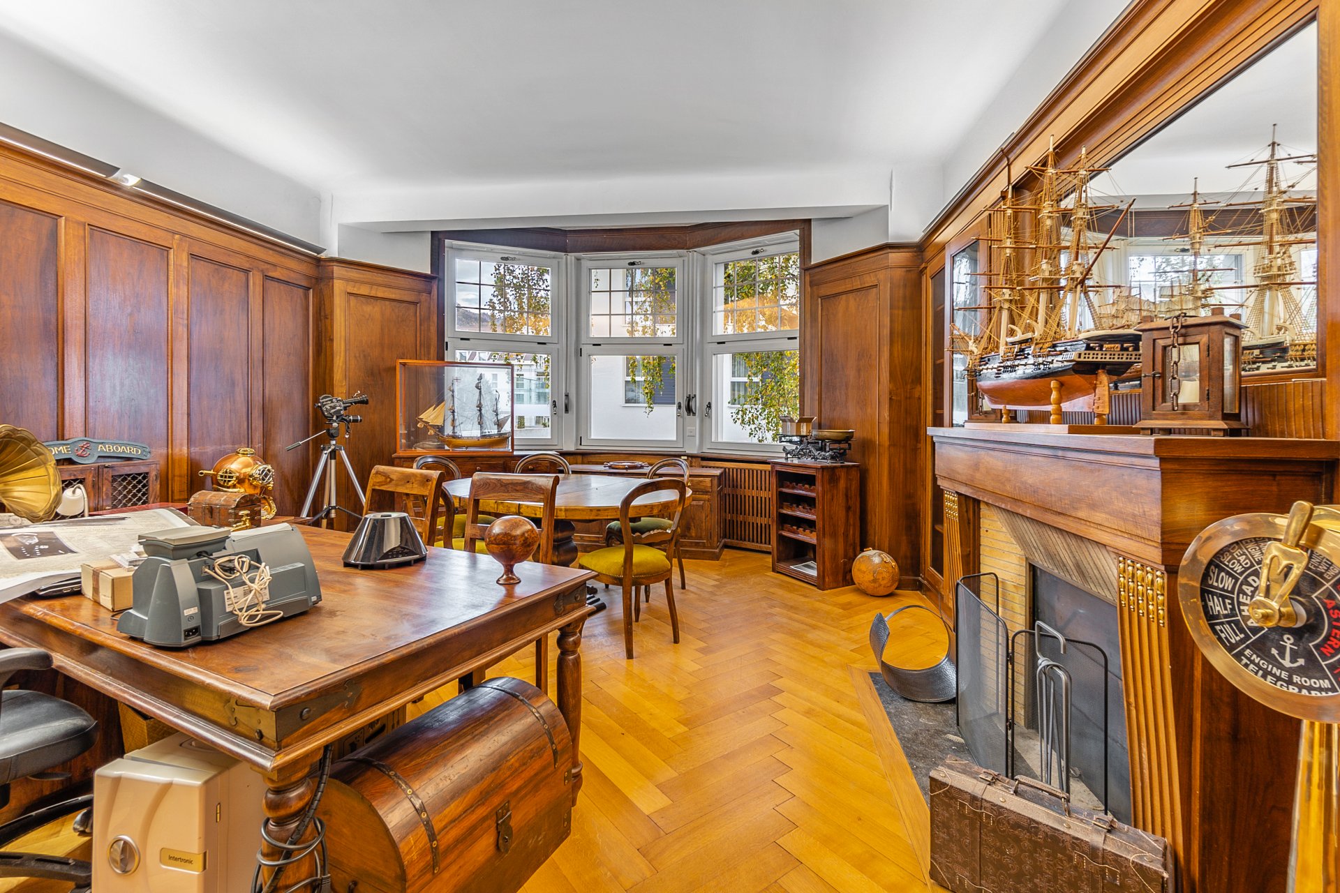-Magnificent central staircase, high ceilings, moldings, woodwork, fireplaces, parquet floors, and dressed stone.