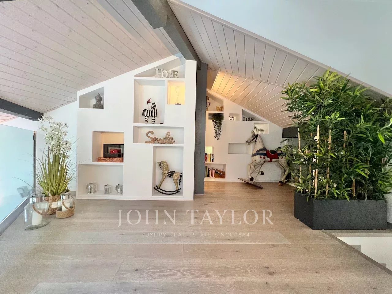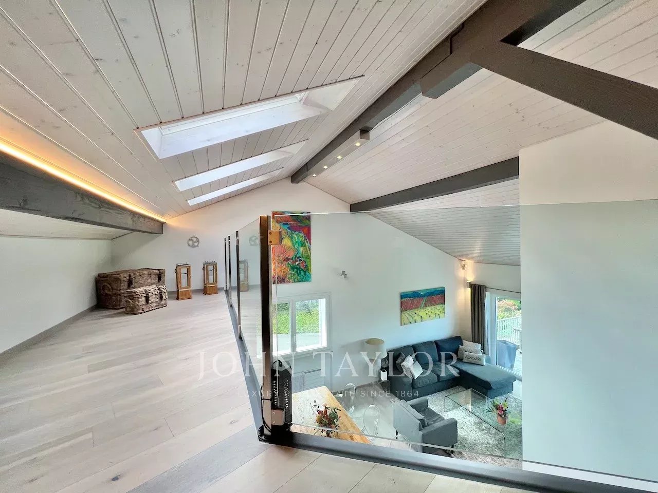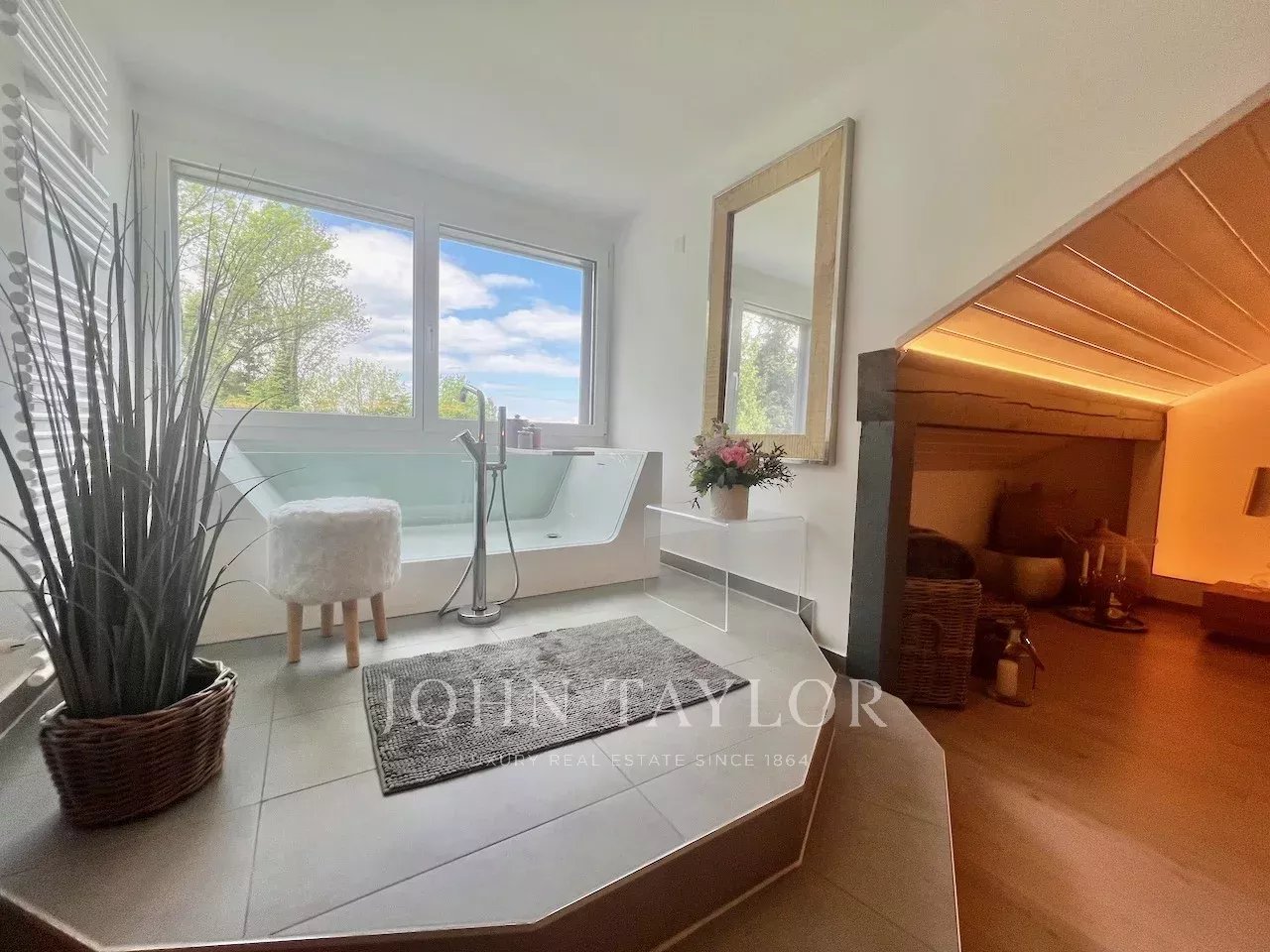 The ground floor features an impressive 70 sqm living area with cathedral ceiling and large bay windows opening onto the terrace and garden. The sleeping area includes four bedrooms, a dressing room, and a spacious family bathroom.